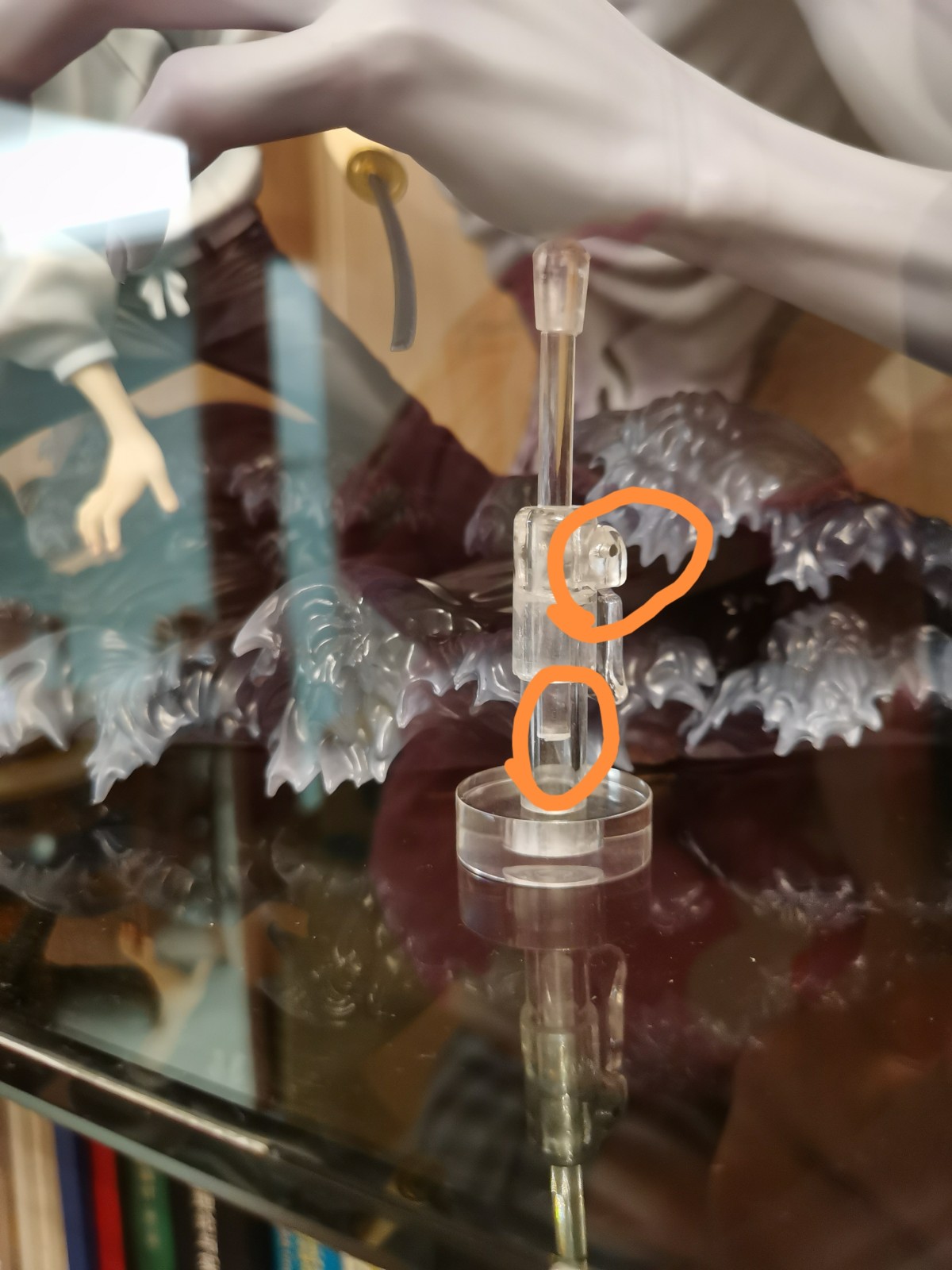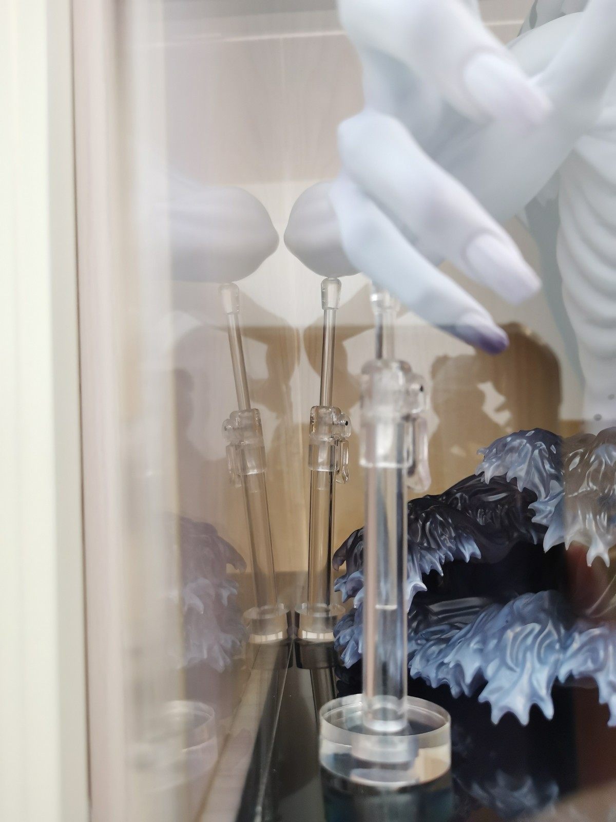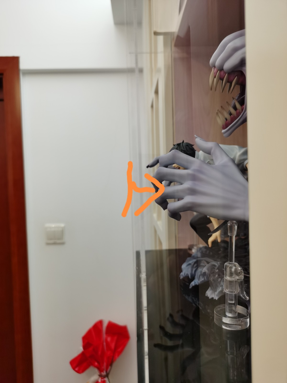 可能是以前就放的偏靠前,然后手办前倒下沉手指刘碰到了亚克力盒前面一面,长时间挤压之下就有了那个痕迹。为了保护手办只能打开盒子把手办整体往后挪了挪,结果就是我前面摆好的支撑点全部都离开原来的位置全得重新摆