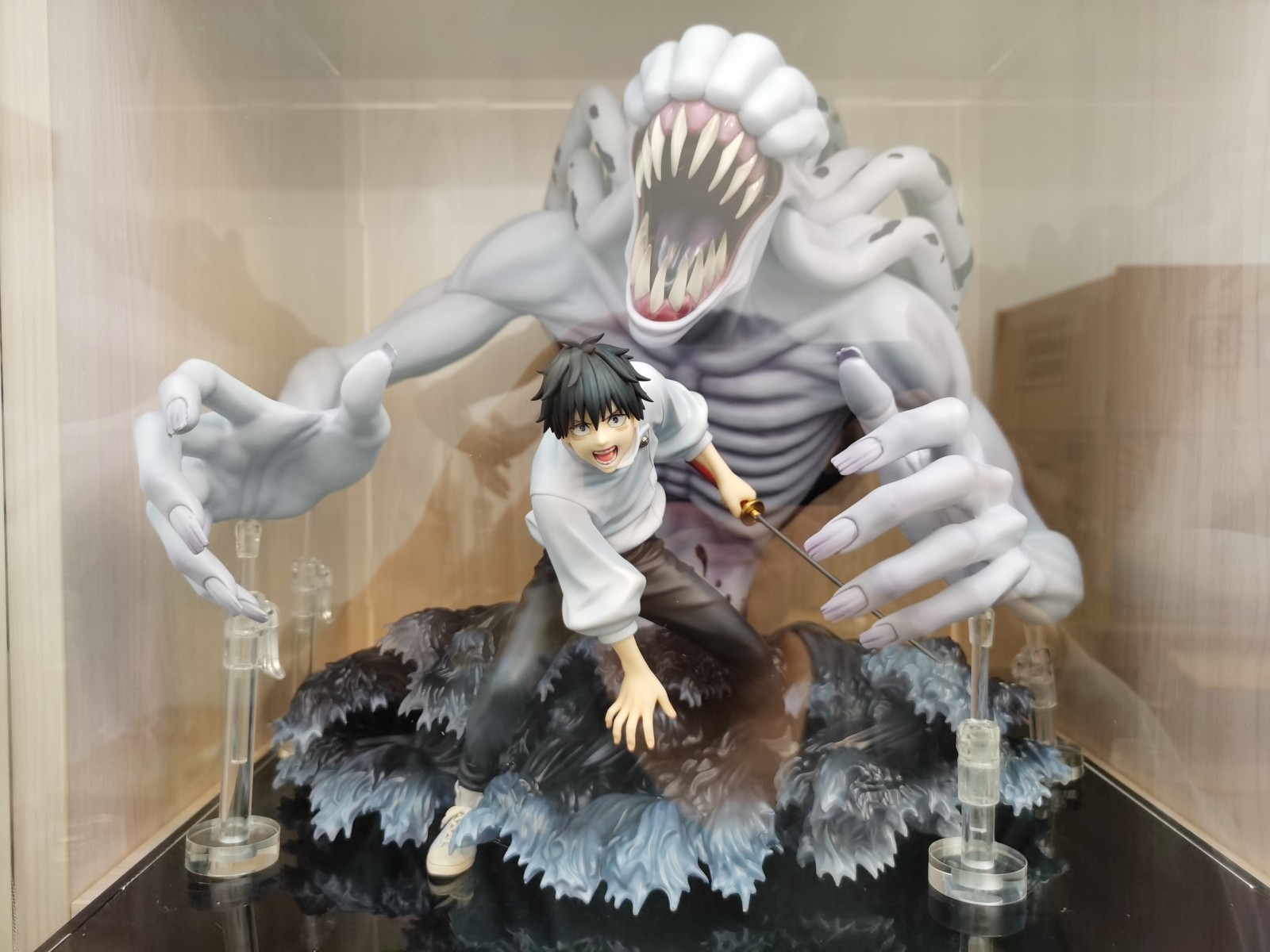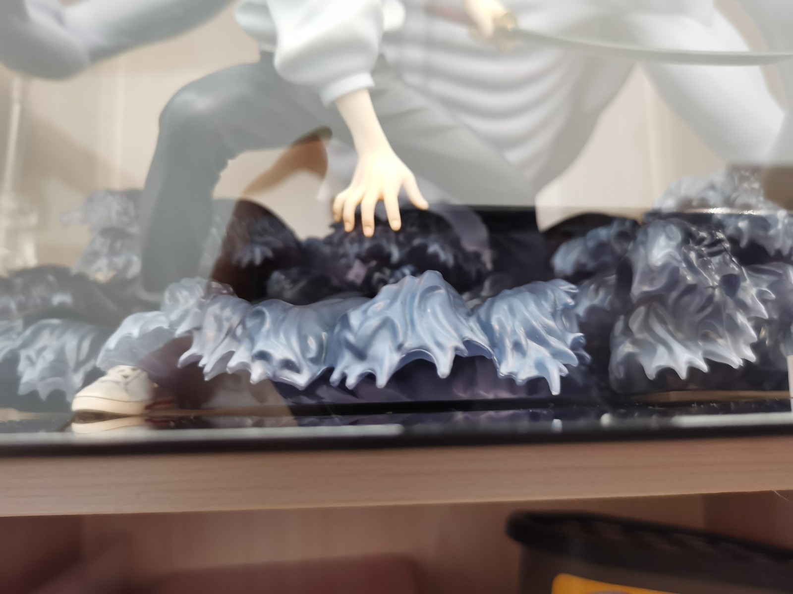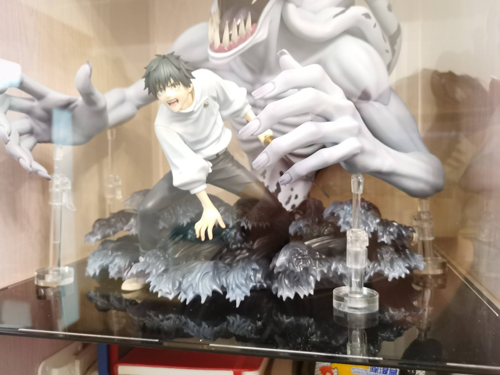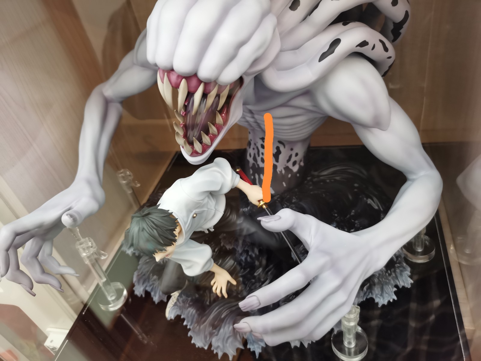 可能是以前就放的偏靠前,然后手办前倒下沉手指刘碰到了亚克力盒前面一面,长时间挤压之下就有了那个痕迹。为了保护手办只能打开盒子把手办整体往后挪了挪,结果就是我前面摆好的支撑点全部都离开原来的位置全得重新摆