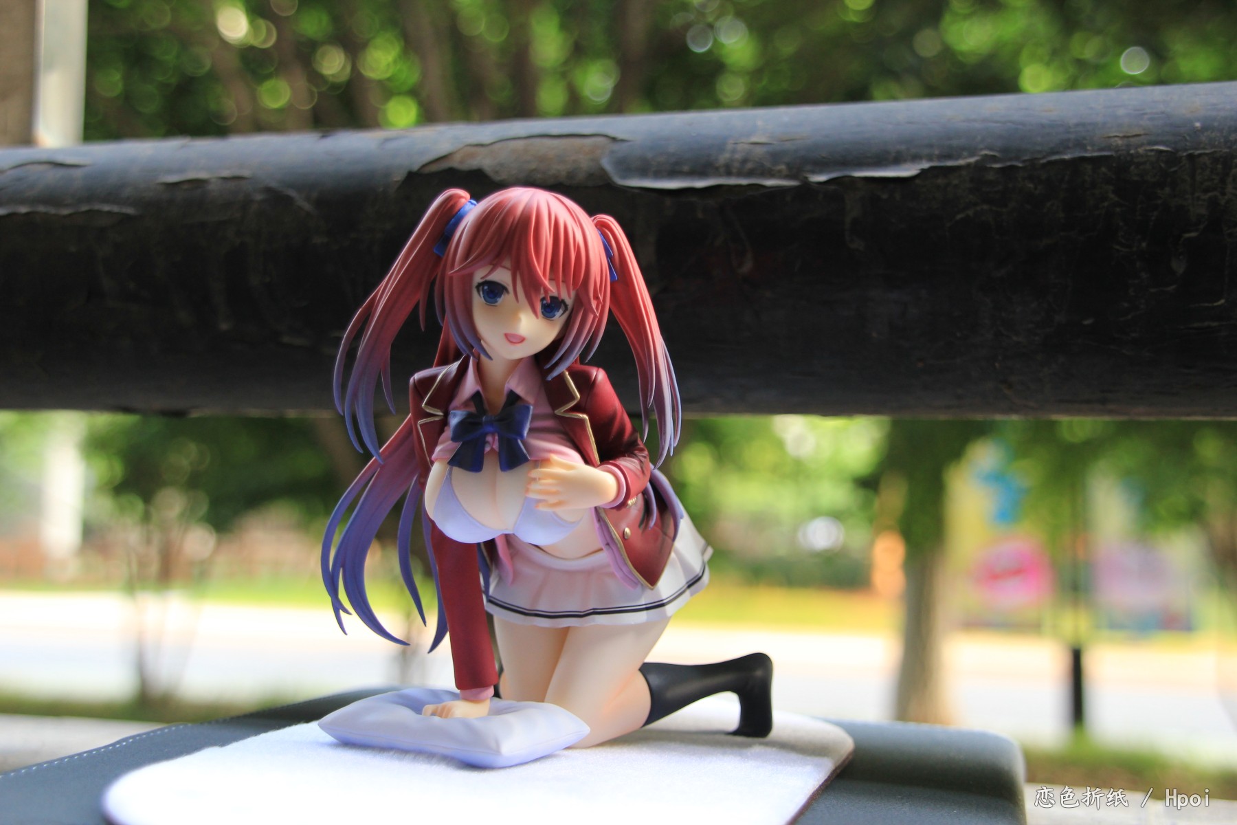 在绿叶的衬托在伴着稀疏的清风,丝丝缕缕飘起的红偏粉色长发令人陶醉。