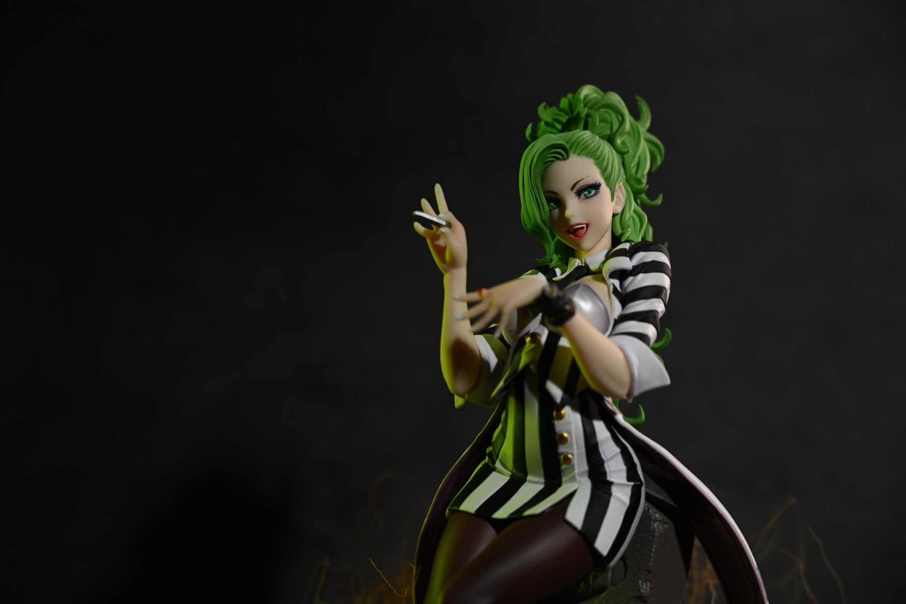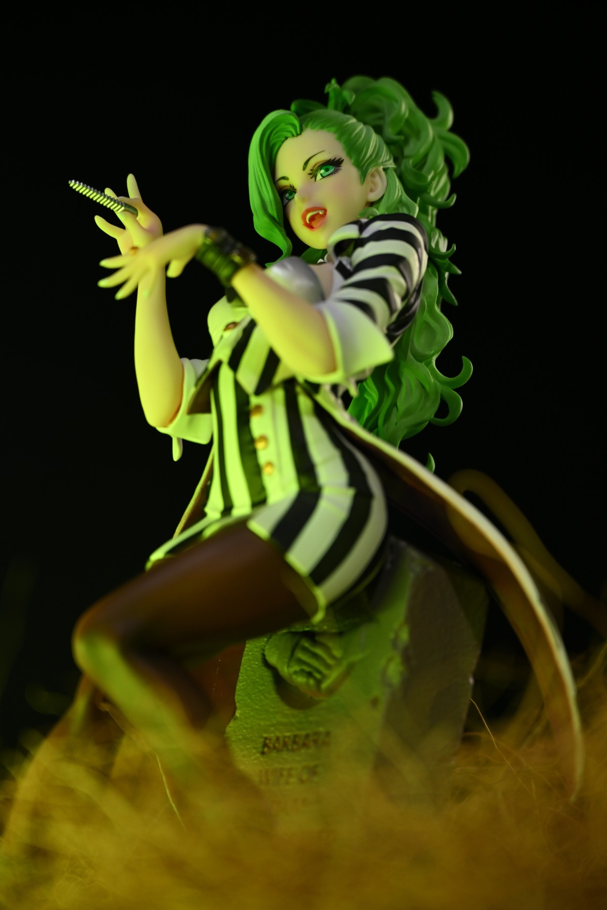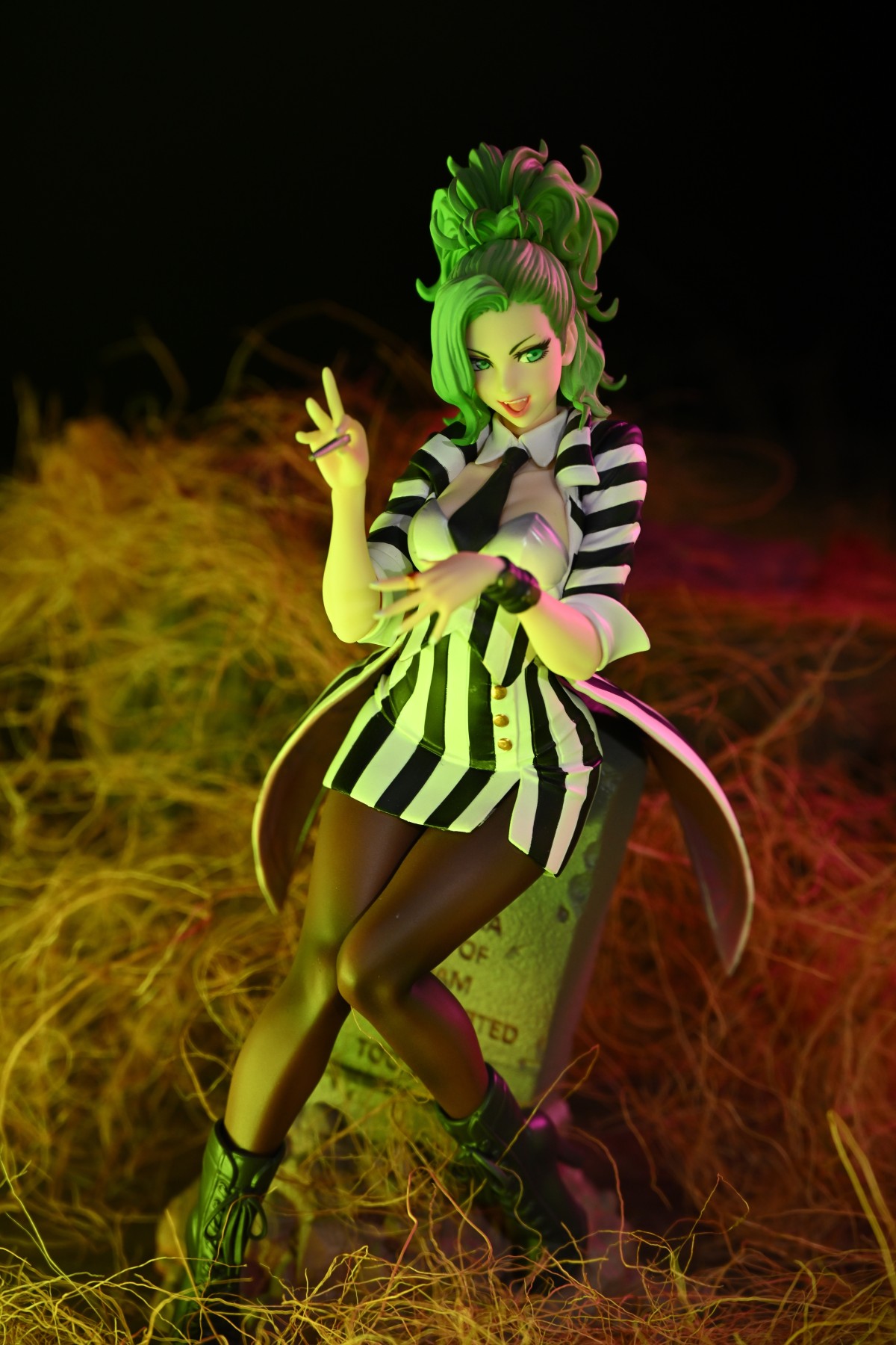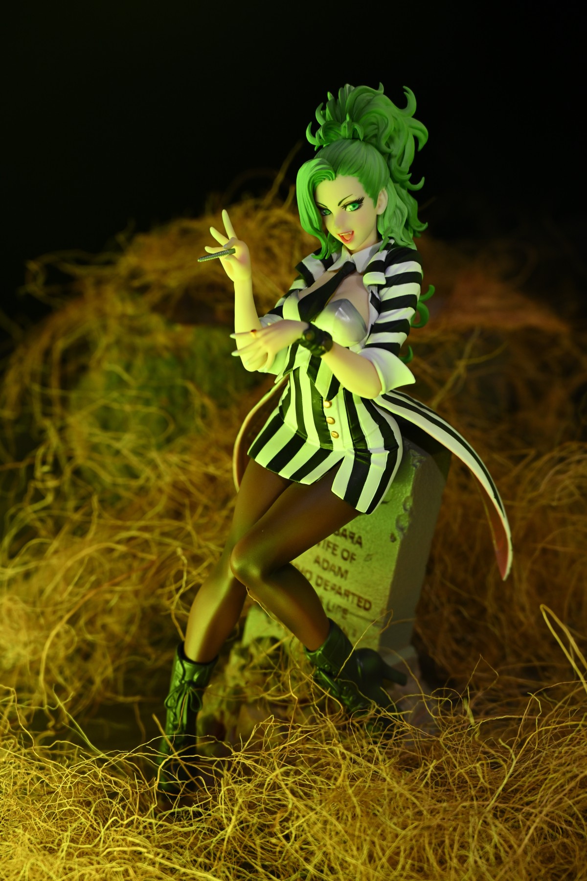 经典恐怖(搞笑)电影阴间大法师里面的搞怪角色甲虫汁,在山下女体化之后俏皮的样貌非常有甲虫汁满肚子坏水的神韵,磨指甲也正好是电影中阴谋得逞的得意时刻,手腕上佩戴剧中装饰诠,下方墓碑的台座也是电影中出现的重要场景,在对原作的二次诠释之余也是完全能勾起粉丝对原作的记忆。
