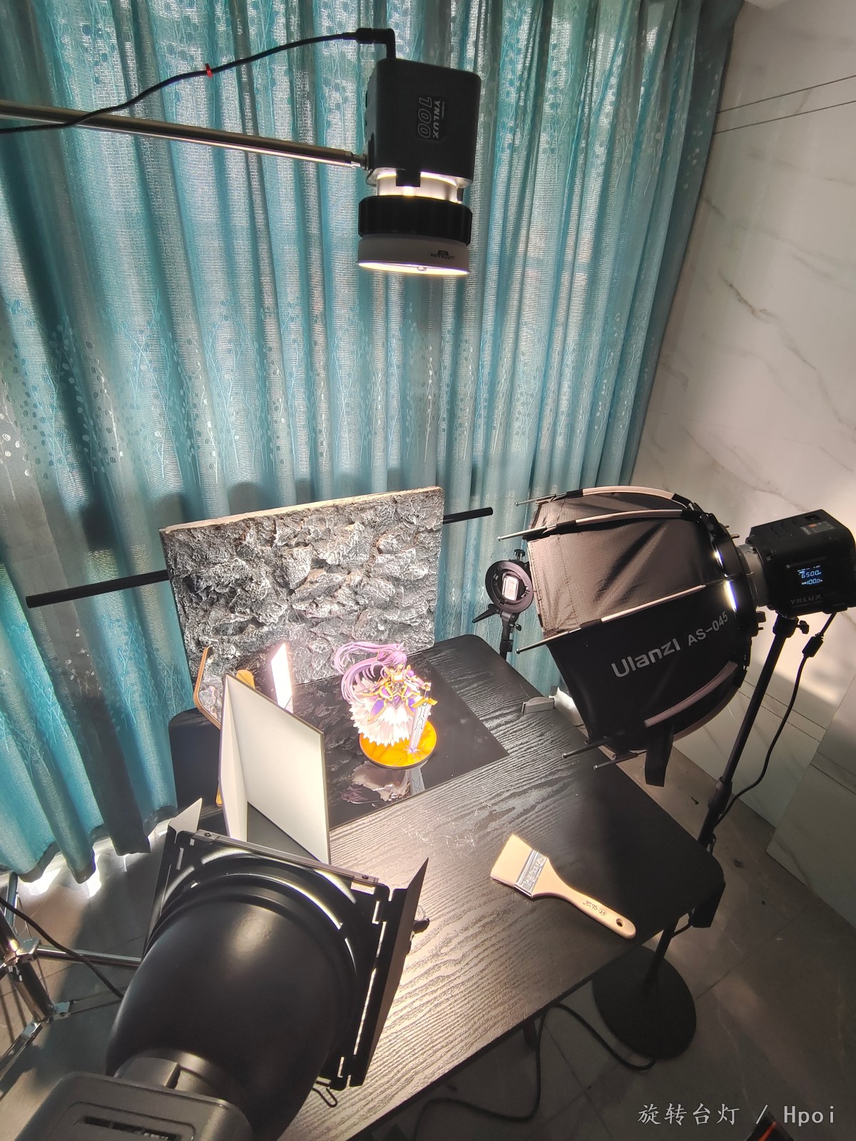 本来昨晚就照着一直以来的布光方案拍好了,今天醒来后想了想还是推倒重来,改成4硬光+1柔光的布局,看来下次得再买个闪光灯了。