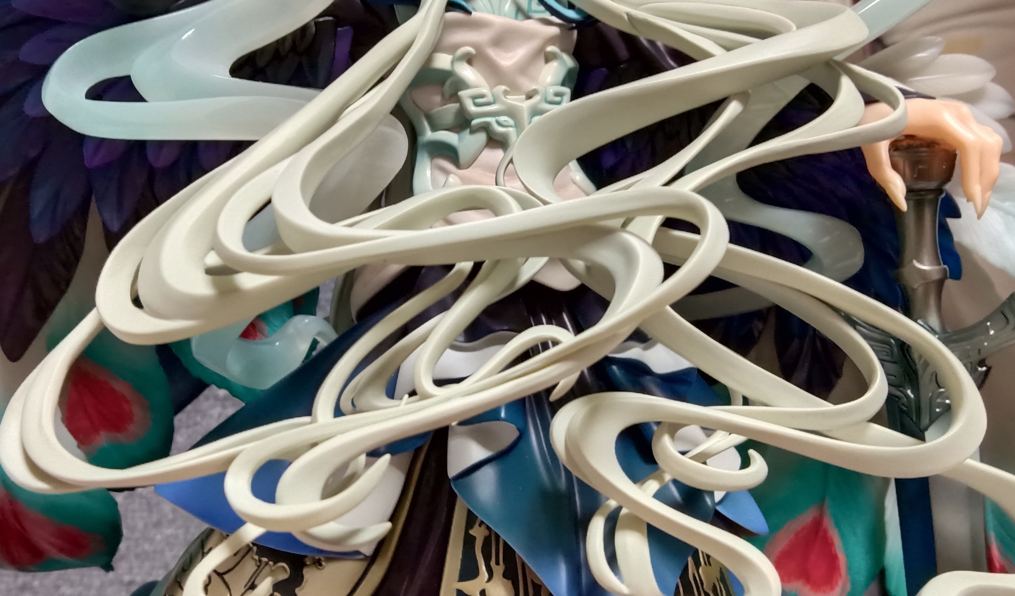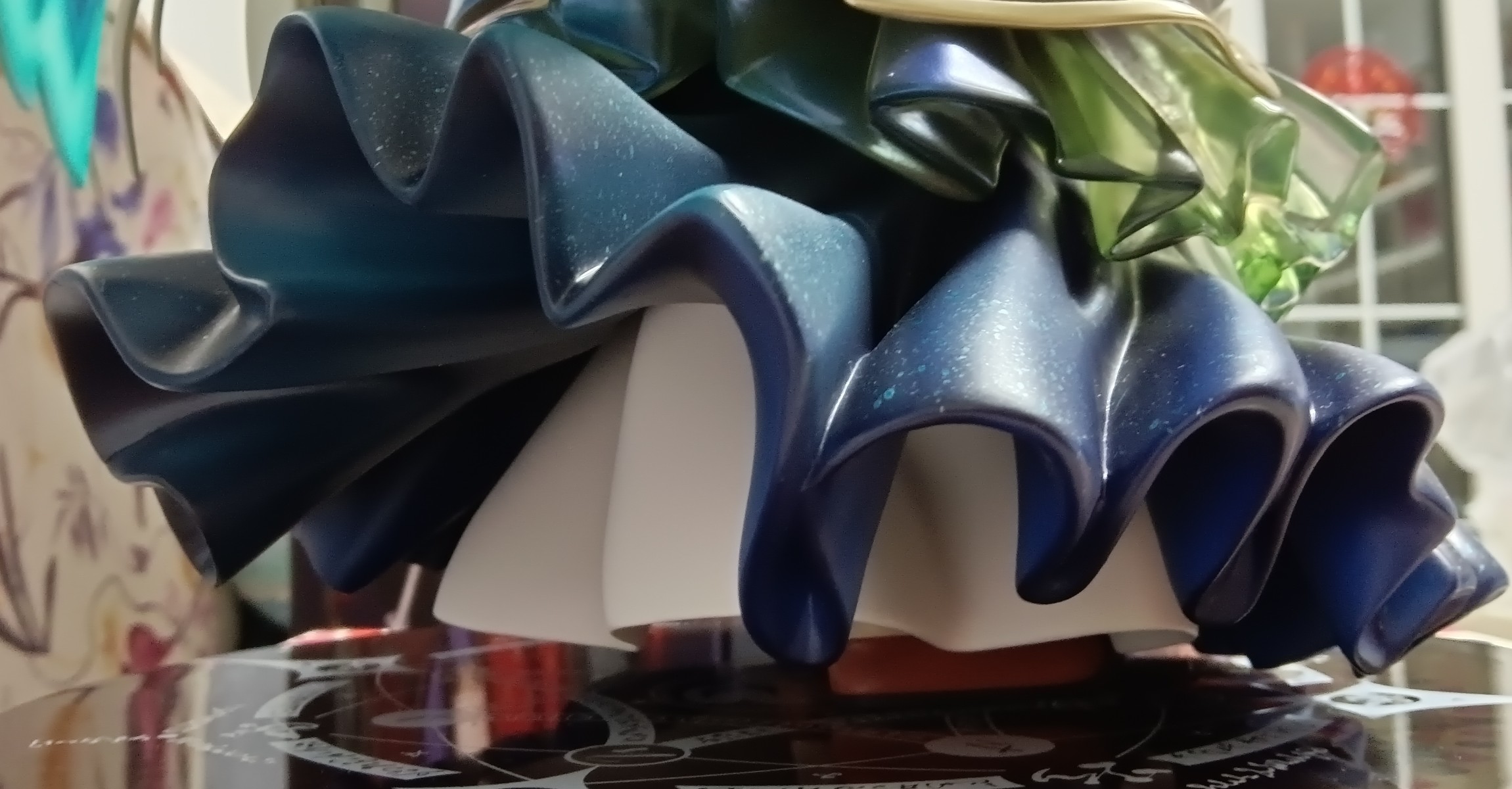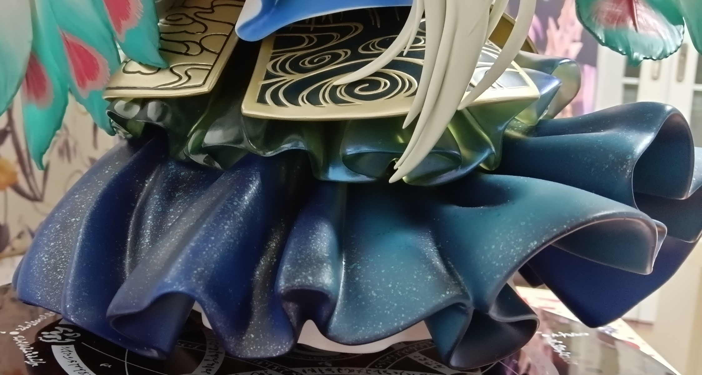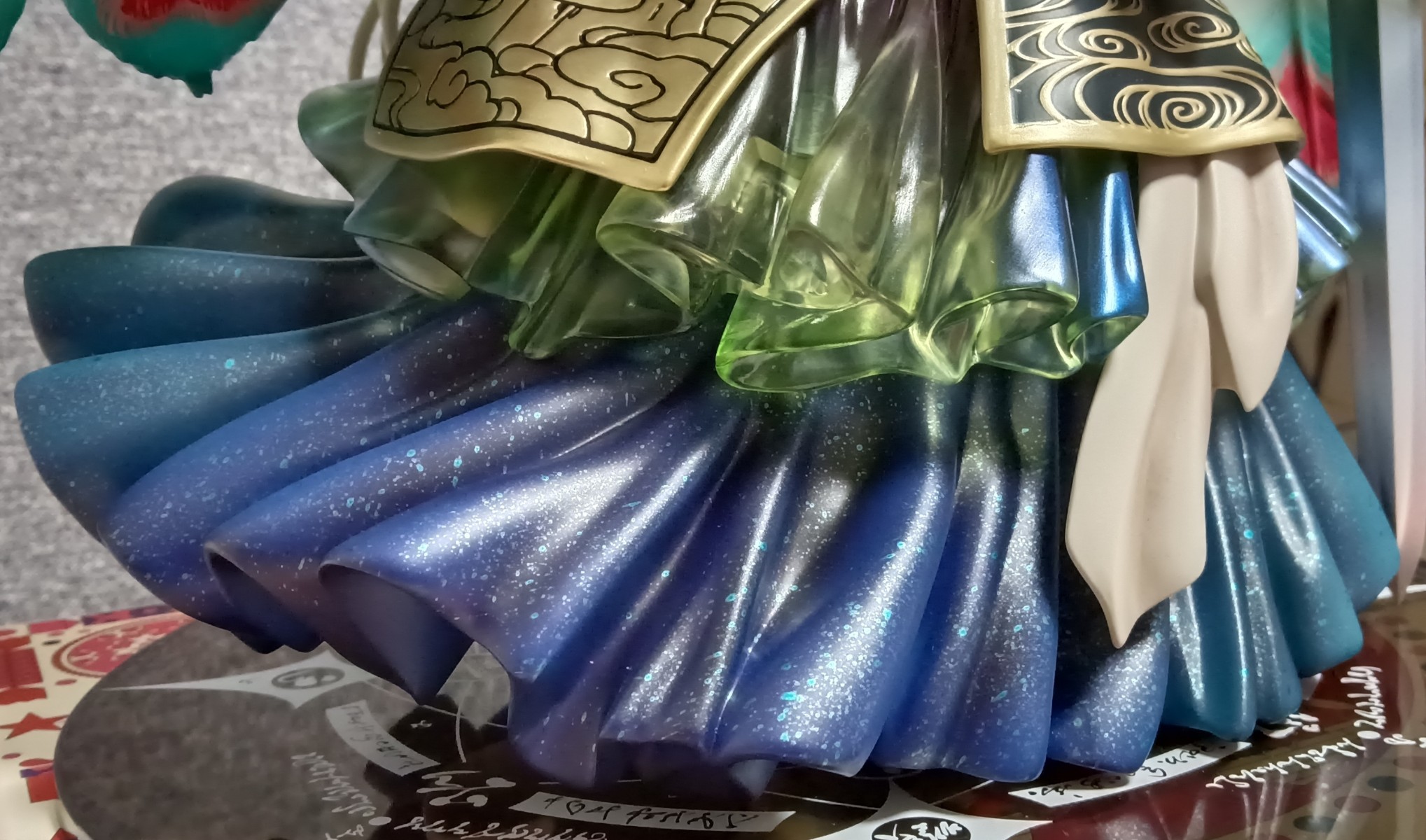当年这款手办当年开售的时候,我还是很迷恋古装手办的,总觉得古装衣服复杂,做出来的手办也好看,如果去掉和服浴衣类的手办,其实市面上中式古装手办真的不算多,尤其是男性角色,刀剑乱舞系列算是古装男手办的扎堆区了。 这一次来看看始皇帝的星空裙摆吧,真的超级超级好看,而且这个裙摆是很厚的塑料做的,本体那么重主要就是这个裙摆。 另外,这个胡子,不,是鬓角出来的头发也是很复杂,按照群友说的拆开,今天终于复位粘上了,就是粘粘卡位太小了,跟牙签棒那么细小,用了5800,很牢固,但多多少少有一点胶痕藏在缝隙里,反正从外面看不见,不管了。