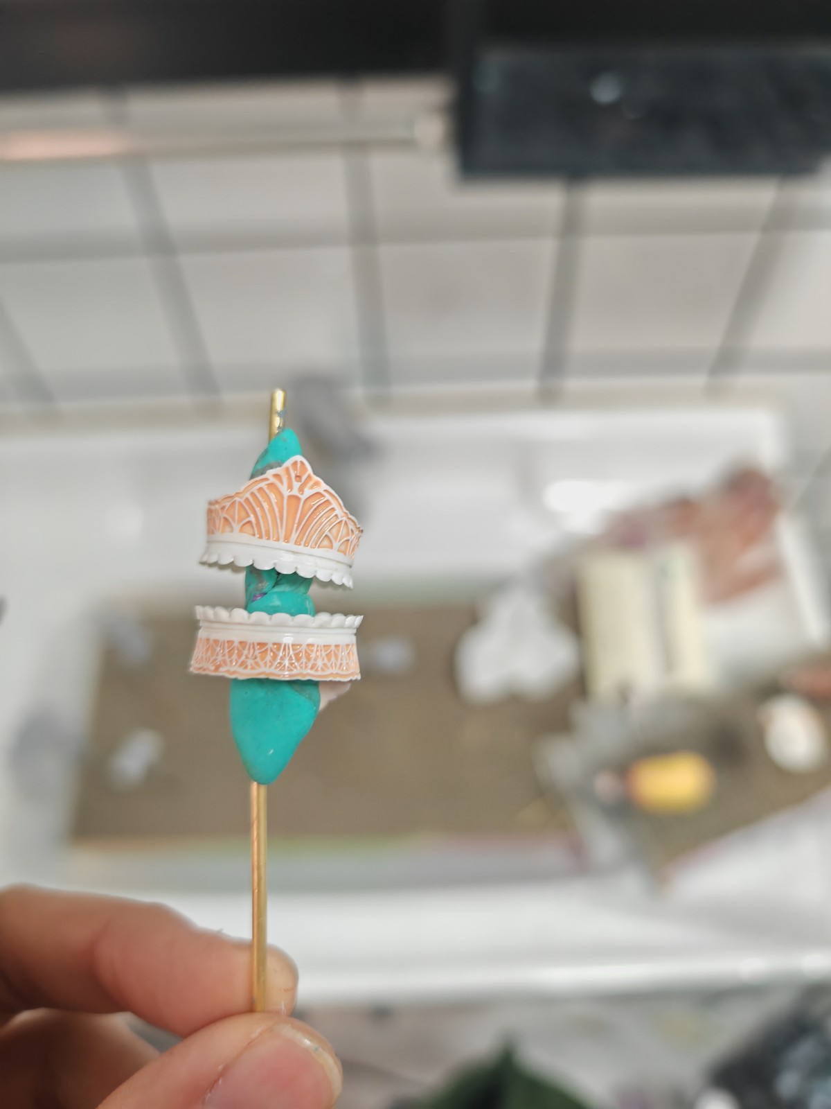 指甲油:颜色是绿色+蓝+白的珐琅调的,这个关键就是像渗线一样,让笔头占满颜料,利用液体张力形成一个指节盖,一点就走,几乎只用擦拭修一点,甚至不修边缘(不修,点的正,效果是最好的)