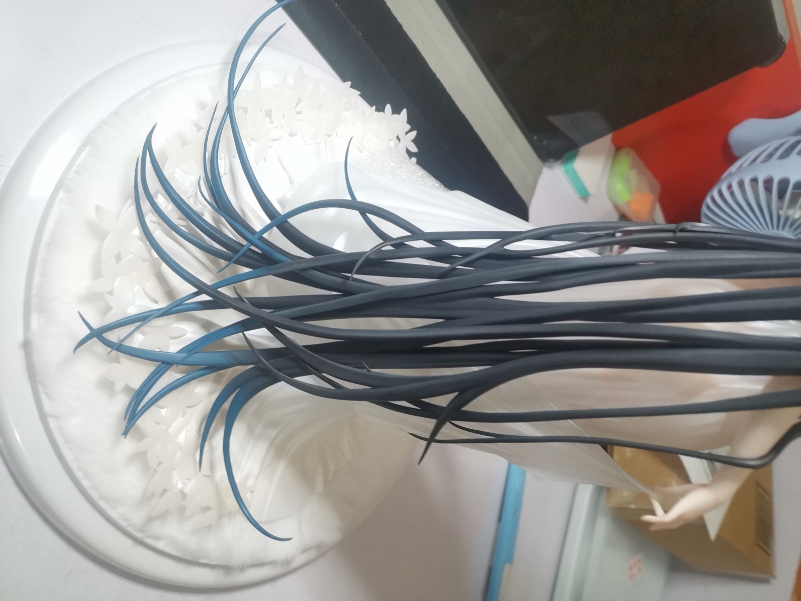 发尾,个人感觉锐度够好,也够翘,一根一根的,由黑灰到蓝(饱和度很低),但是质感一般,像橡皮泥……头发很软,注意别弄断了