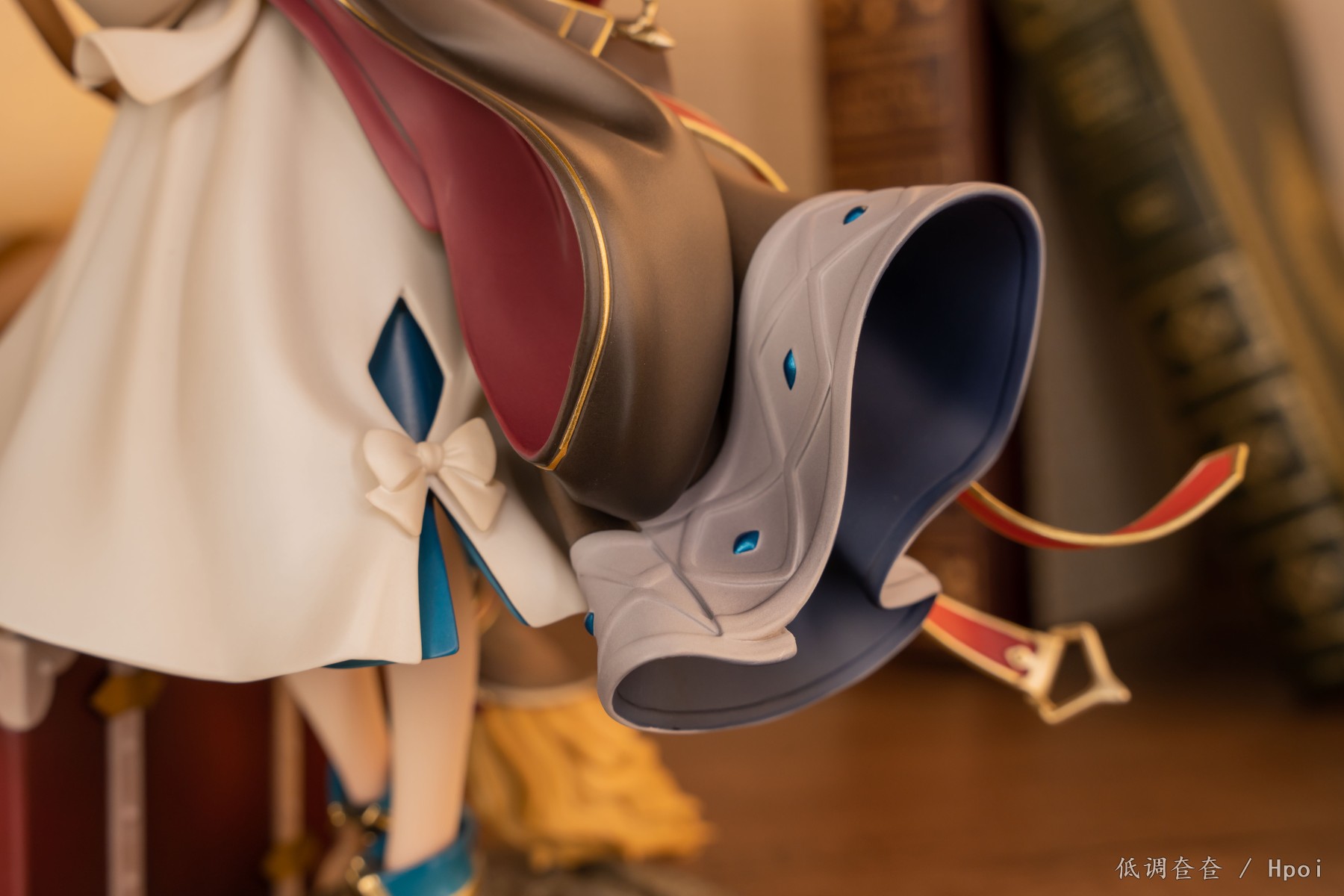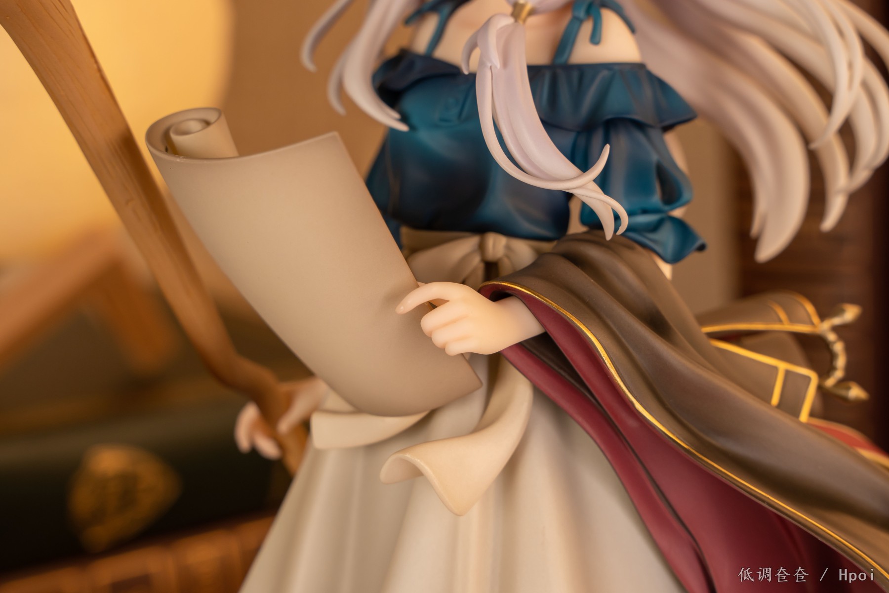 伊蕾娜从造型,面相,做工,涂装,漆面都无可挑剔。腿部有用手感漆,这是最基本的,头发的漆里面加了很细的闪粉,所以光照上去特别有质感,阴影色的运用也是毫不吝啬。衣服上的金属渗线,扣子等等金色的东西全是用的金属漆,质感满分。衣服上的渗线和裙摆的上的宝石涂的非常工整,完全没有出界和飞油,全身上下也找不到一丁点划痕,黑点等瑕疵