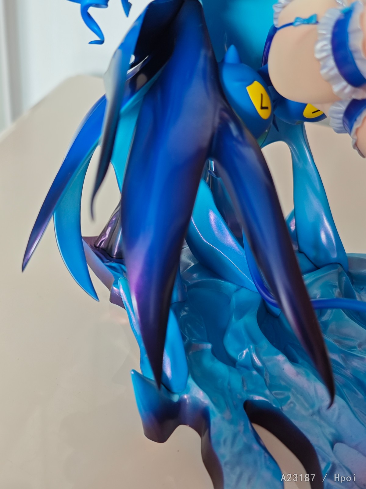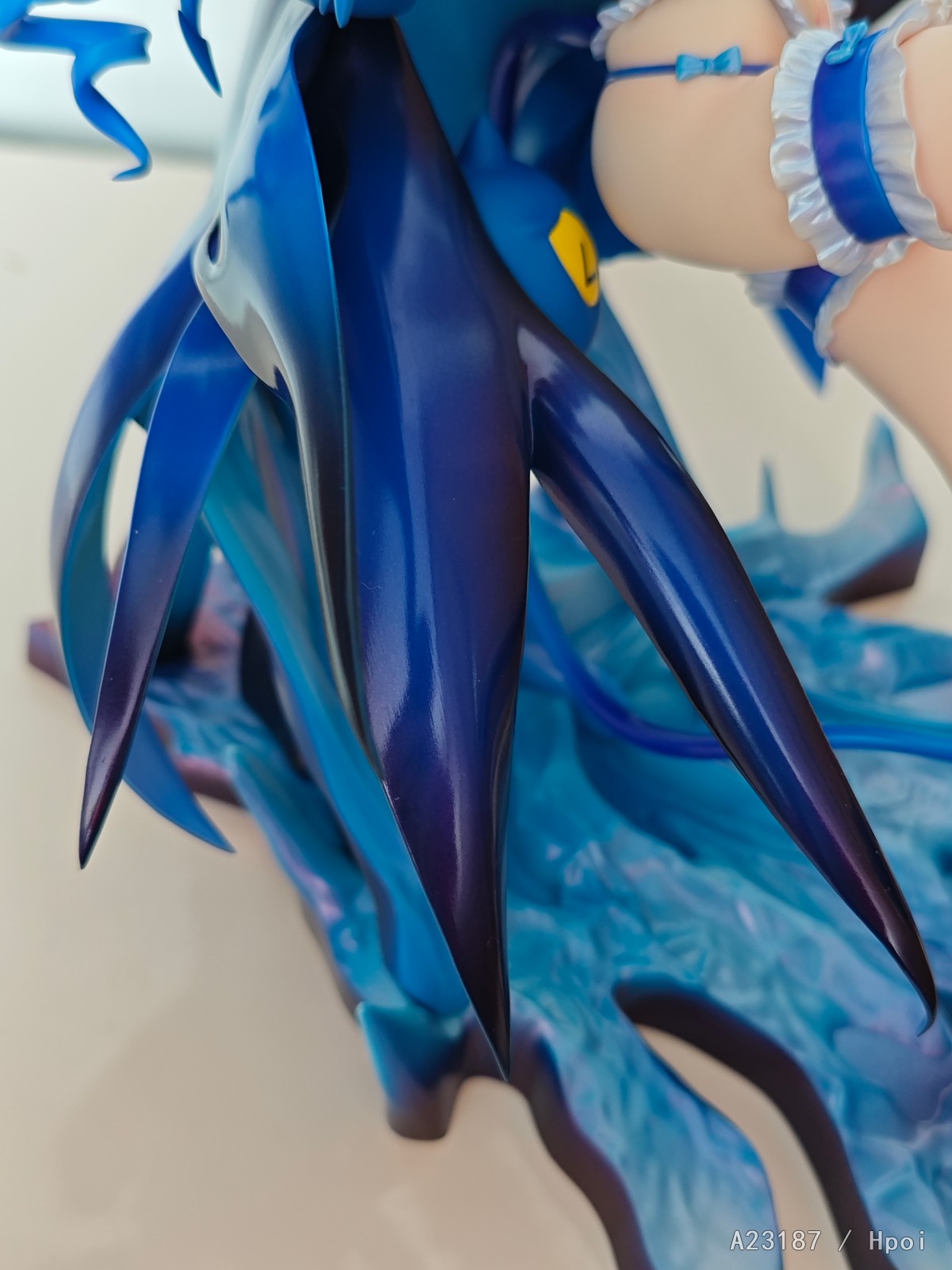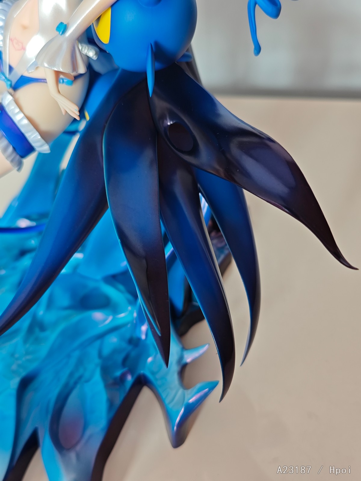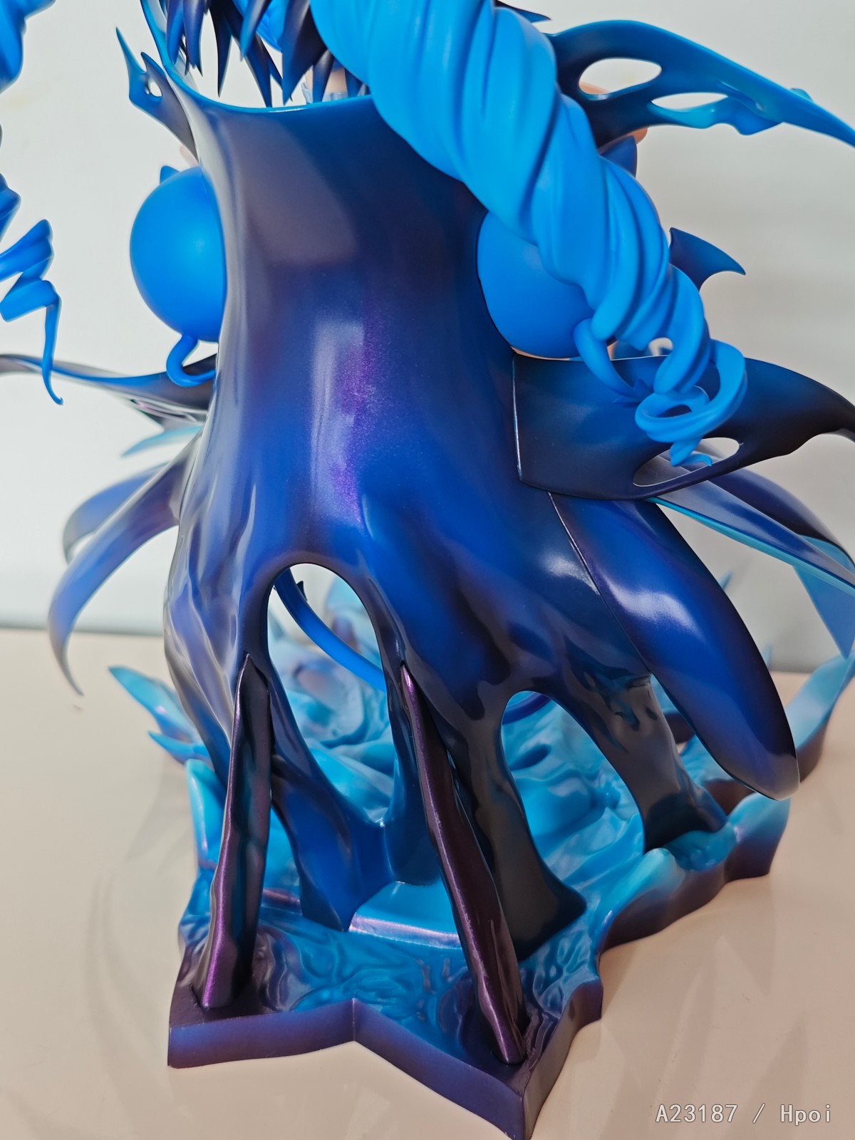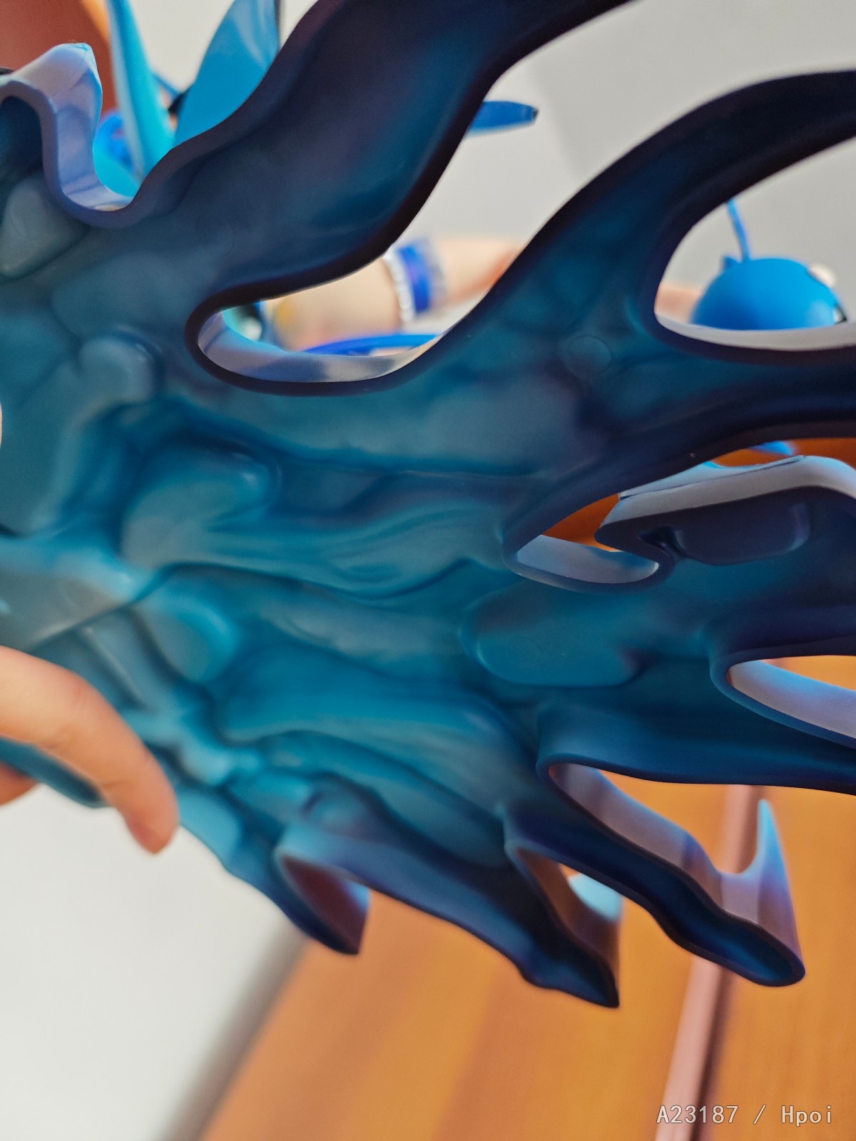 底座做的很棒,像是冰岩又像是张开的手掌,搭配人物完美,可能有人诟病的一点是下面是空的(或者称为偷胶),但也不算薄,就是没有厚实感。后侧几根和披风相连接的支柱是实心的,支撑人物。