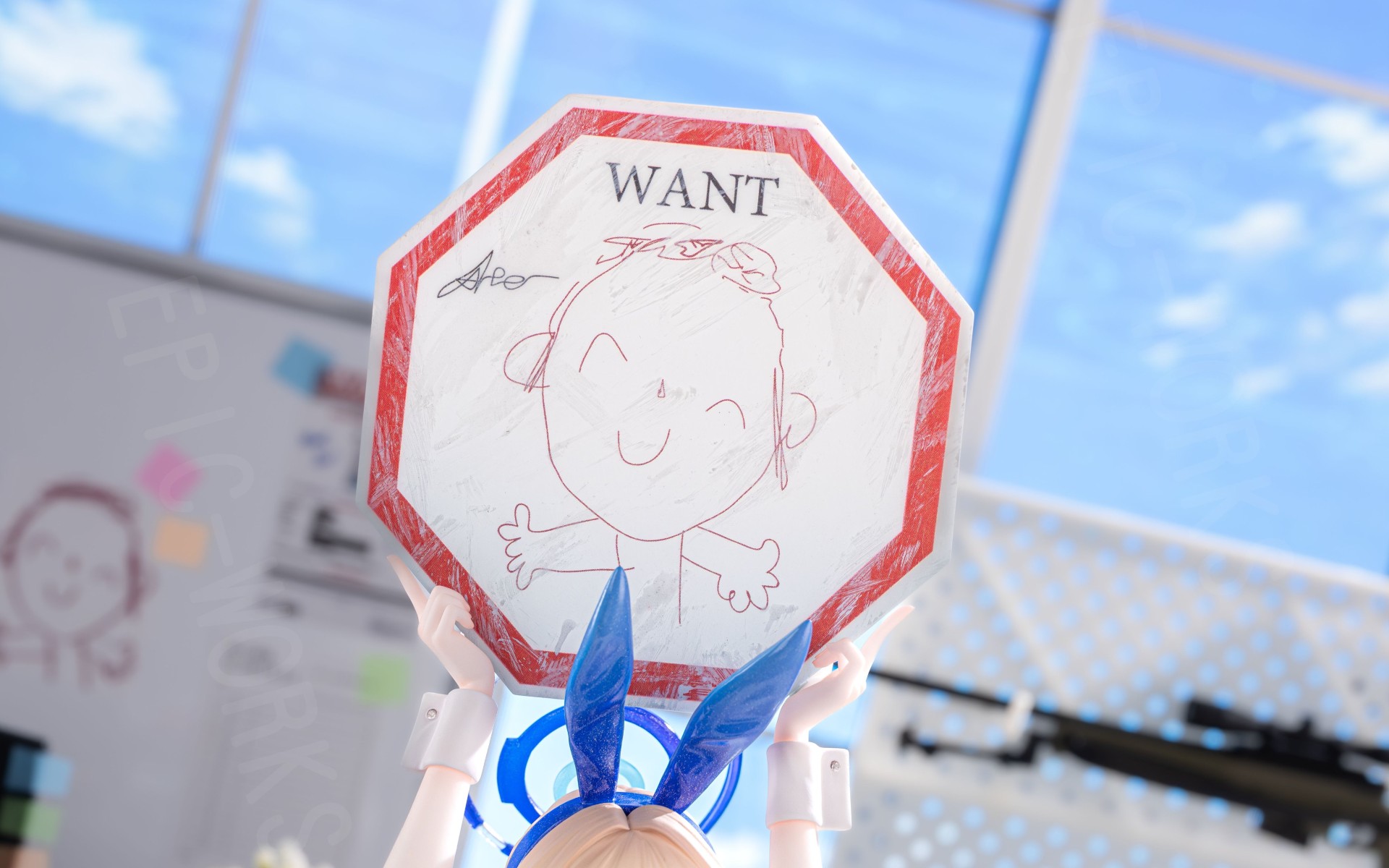 关于这个牌子上写的字,原画上面就只是写的“WANT”,我去问了发现原画就是这样,一开始觉得应该是画师写错了,因为通缉应当写成“WANTED”,但是后来仔细一想,want不就能作为示爱,没毛病(