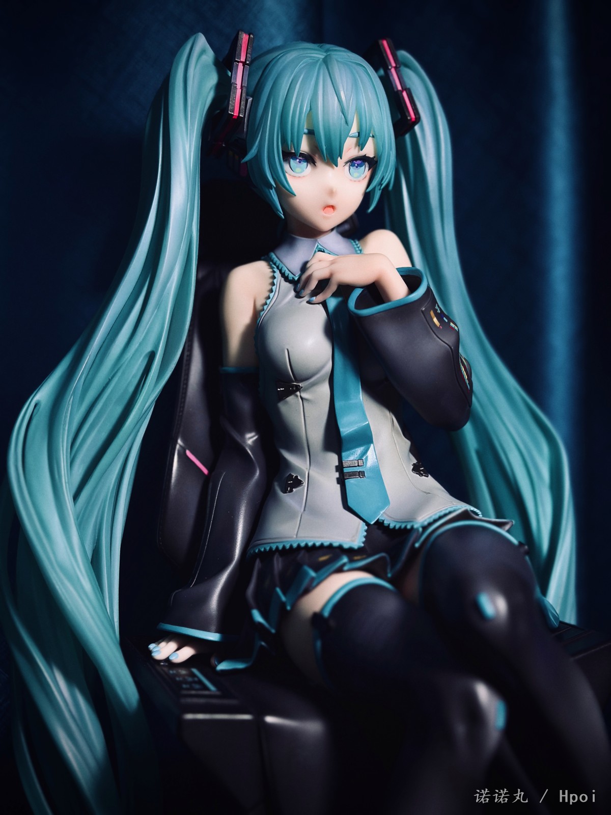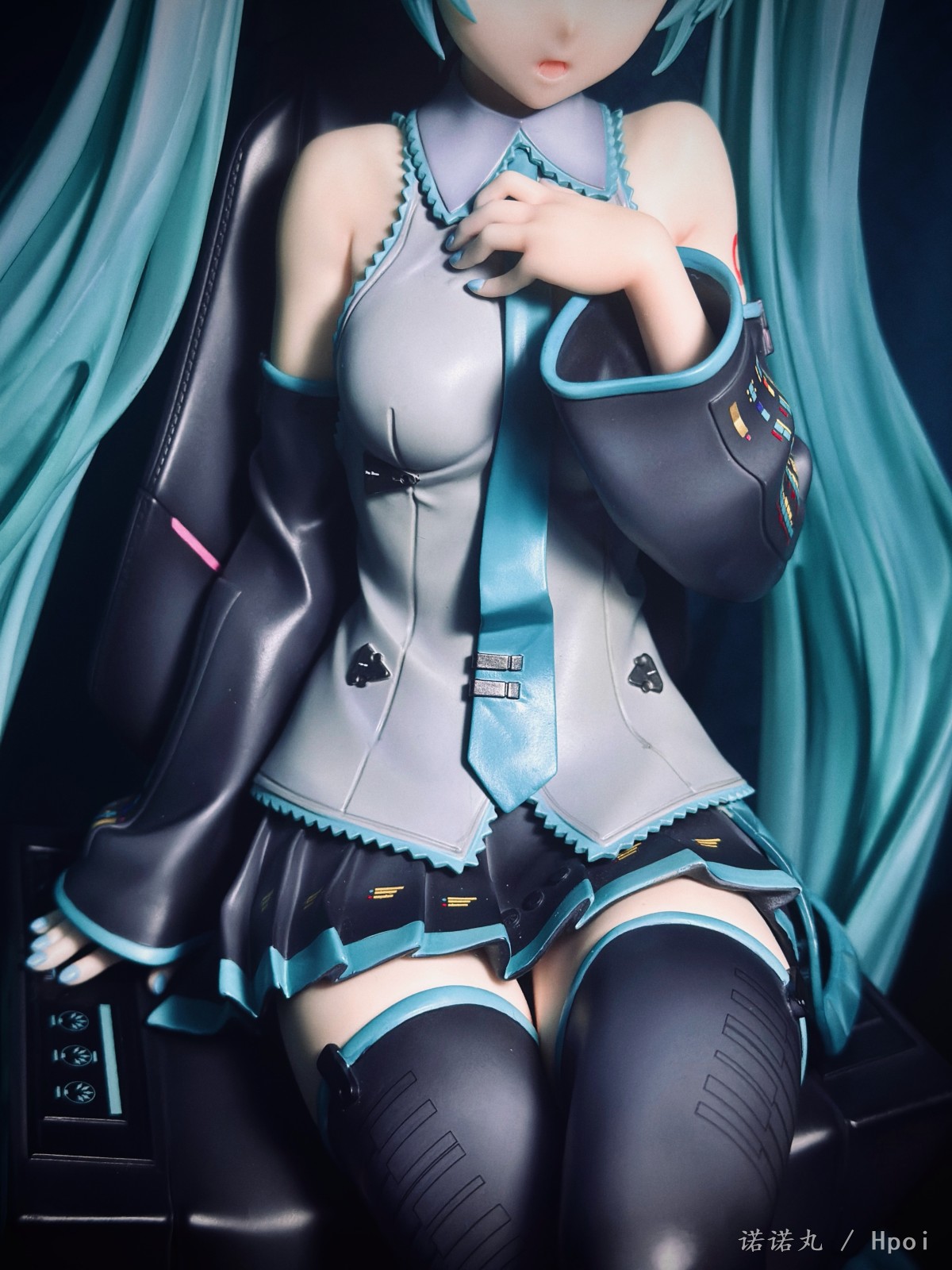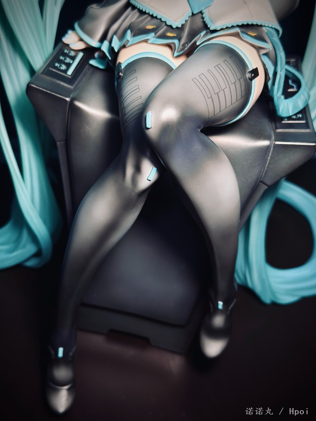 人生第一次买雕像,大概也是肉眼可见的最后一次买,而且抽到了普通版全球80体中的那独一无二的39号,非常幸运,可以说这是我必然可以也一定会带进自己坟墓里的东西。 如果说咬牙买了豪华版,说不定39就不是我了,而且在让我再加4K买一块石头做的假音响,我觉得真没必要,有这钱回头买一套配色相近的真喇叭放后面不好吗。 虽然椅子是宝丽石的,但绿毛本体应该还是轻飘飘的pvc,而且p1s以涂宝丽石雕像的方式涂pvc,在细节上并不考究,肌肤也完全没有手感漆,看起来偏黄。 不过毕竟是雕像厂,型可以说特别好,一双极为漂亮切诱人的美腿,加上恰到好处的姿态与神态,虽然产品介绍说是“成熟的大人的Miku的美感”,但其实更多的还是给人一种楚楚可人,想要犯罪的极具诱惑力的清纯与性感相融合的气质,neco在搞不色但很色的风格上确实很有造诣。 虽然衣服加了一些neco风格的东西【其实说的就是意义不明的三角配饰】,但确实还是难得的公式服产品,希望大家都能感受到Miku公式服最原汁原味的美,在未来推出更多好看的公式服Miku。
