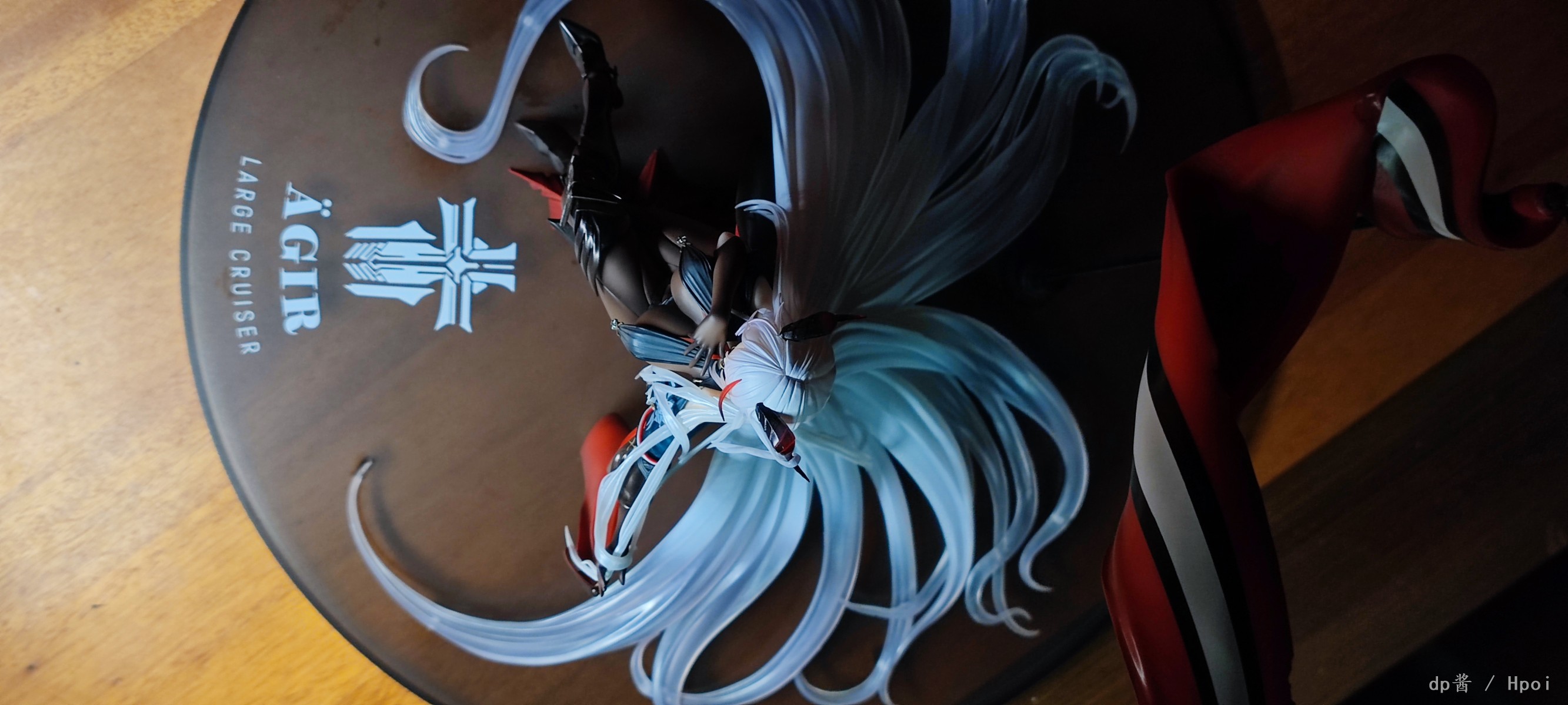 俯视角,能看出大圆盘的面积及其作用,头发是做了渐变的效果,发尾处的固定桩位很多,此外披风和脚板底都各有一个桩位,在底座上稳定是稳定了,但是要拔出来的话会相当麻烦,所以建议不要用手直接拔,而是用开模器这样的工具更不容易损坏手办