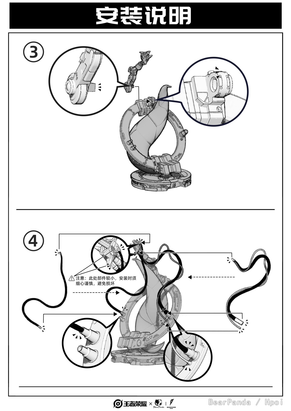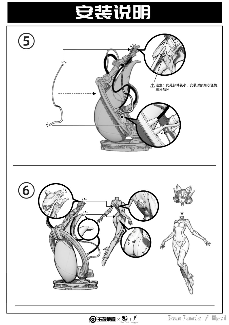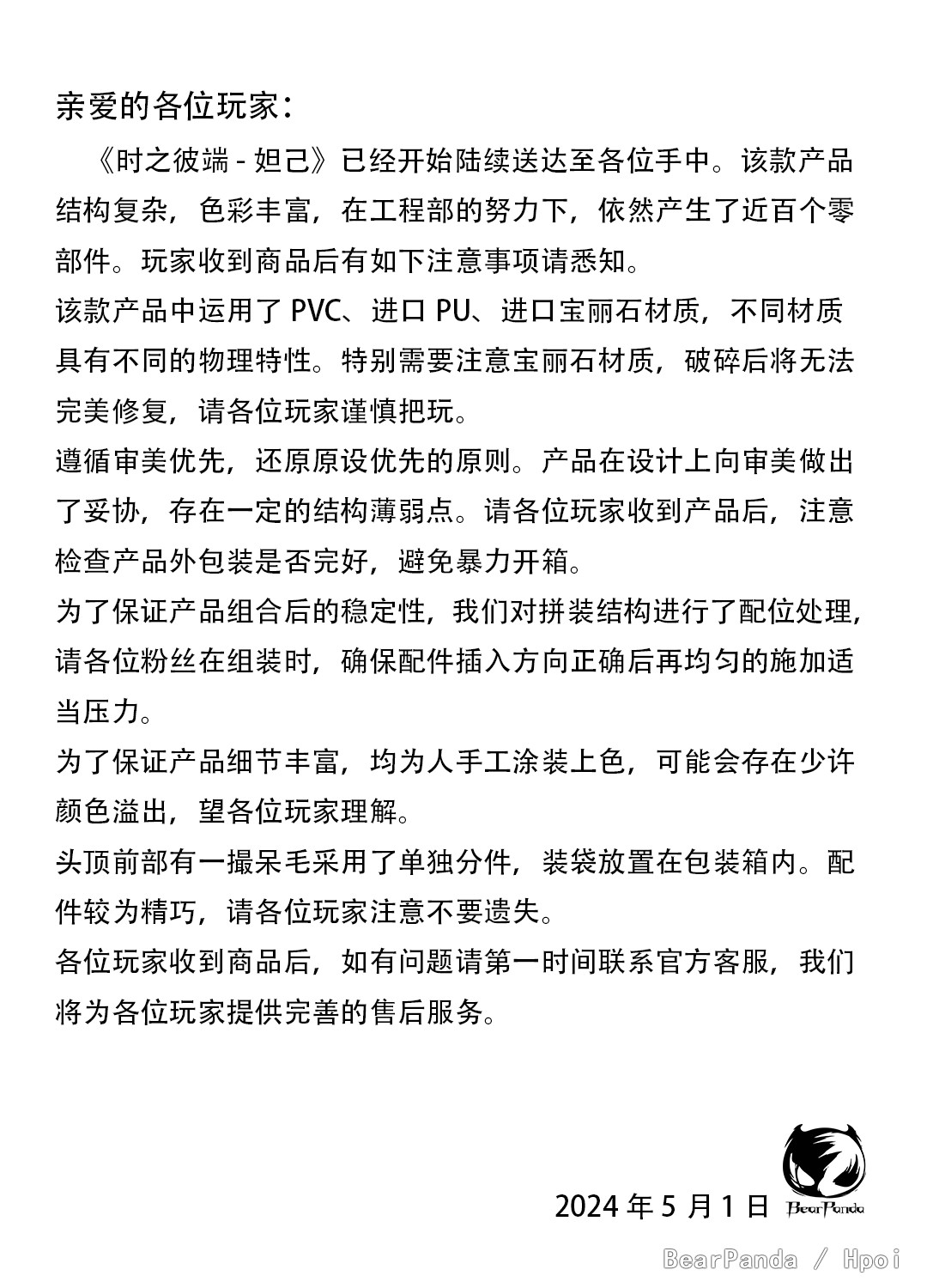 亲爱的各位玩家,《时之彼端-妲己》已经开始陆续送达至各位手中。该款产品结构复杂,色彩丰富,在工程部的努力下,依然产生了近百个零部件。玩家收到商品后有如下注意事项请悉知。 该款产品中运用了PVC、进口PU、进口宝丽石材质,不同材质具有不同的物理特性。特别需要注意宝丽石材质,破碎后将无法完美修复,请各位玩家谨慎把玩。 遵循审美优先,还原原设优先的原则。产品在设计上向审美做出了妥协,存在一定的结构薄弱点。请各位玩家收到产品后,注意检查产品外包装是否完好,避免暴力开箱。 为了保证产品组合后的稳定性,我们对拼装结构进行了配位处理,请各位粉丝在组装时,确保配件插入方向正确后再均匀的施加适当压力。 为了保证产品细节丰富,均为人手工涂装上色,可能会存在少许颜色溢出,望各位玩家理解。 头顶前部有一撮呆毛采用了单独分件,装袋放置在包装箱内。配件较为精巧,请各位玩家注意不要遗失。 各位玩家收到商品后,如有问题请第一时间联系官方客服,我们将为各位玩家提供完善的售后服务。