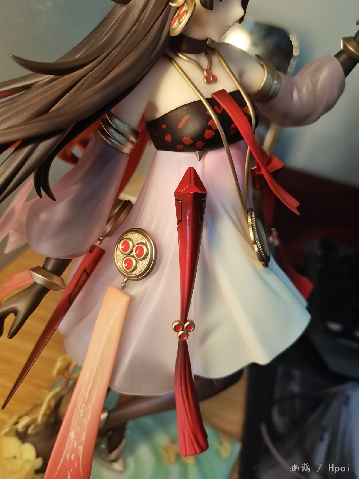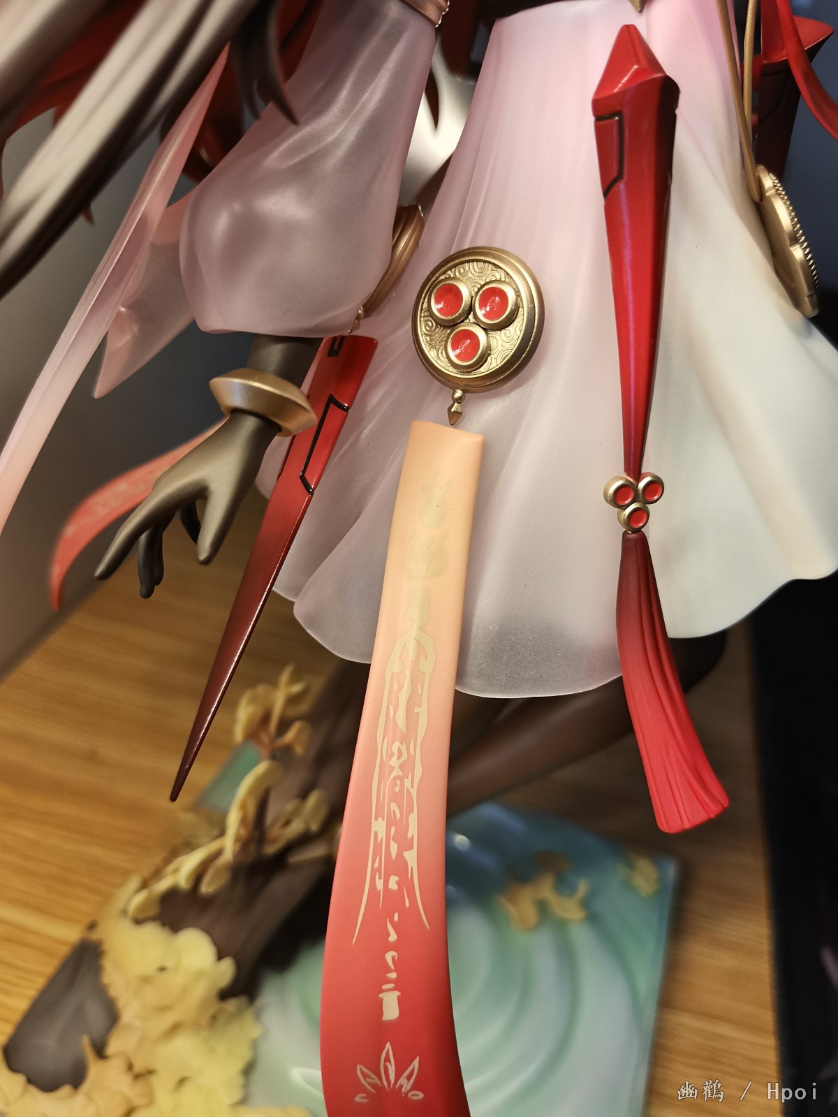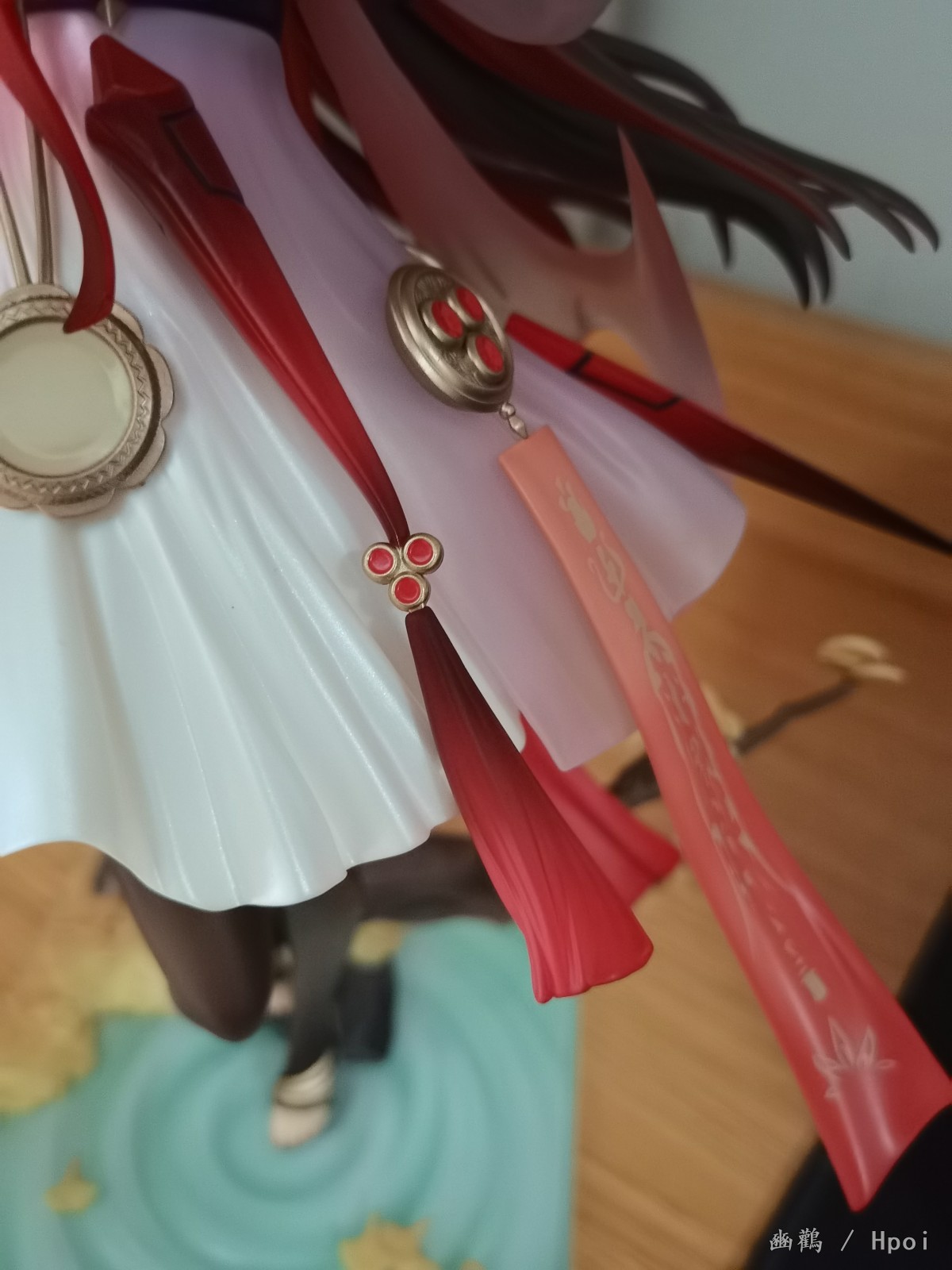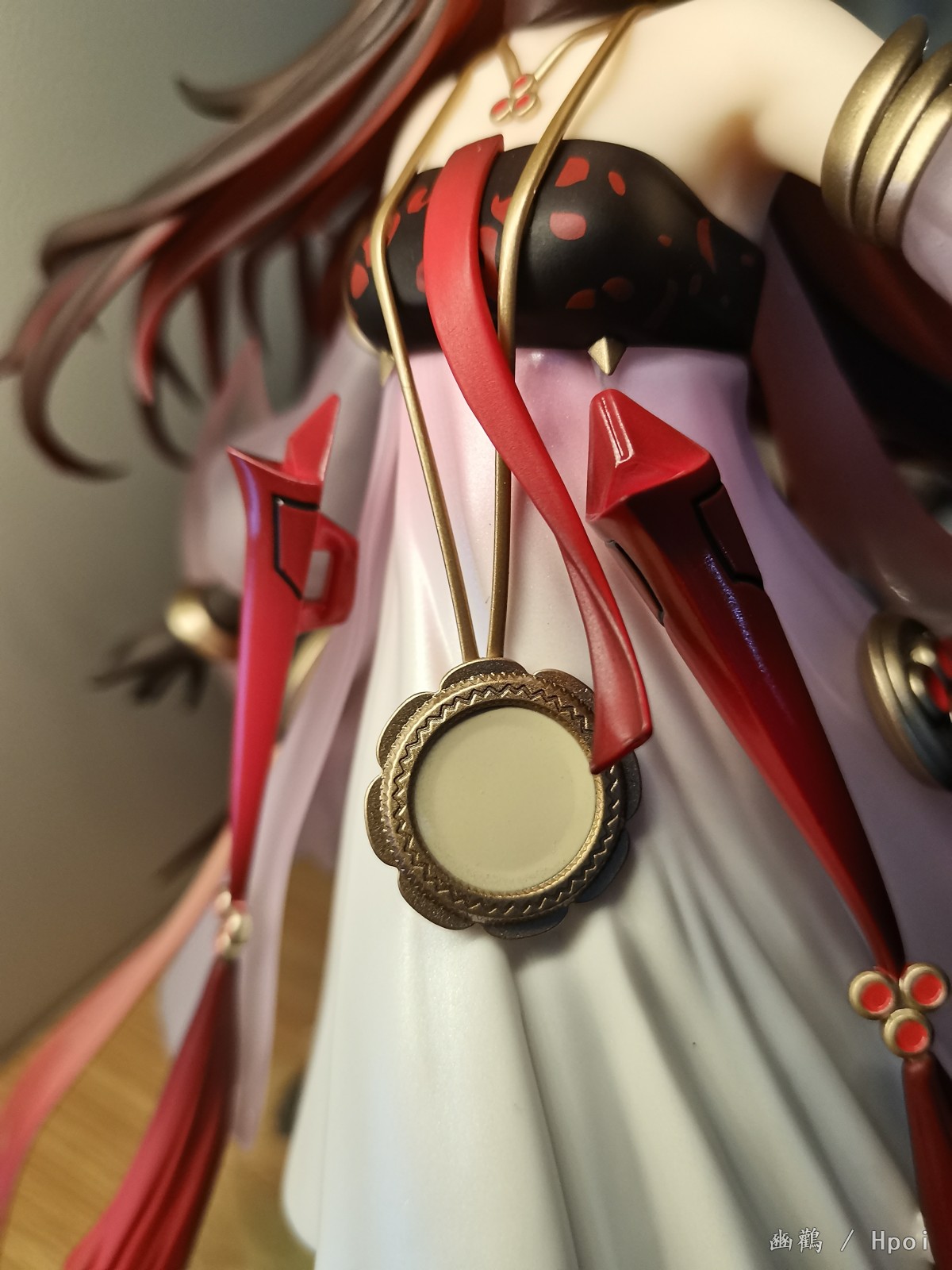 衣服外层是半透明渐变的朱红色,有种琉璃感,内层就是那种乳白色的裙子,手办的褶皱做的还行。还有就是身上的金属圆盘做的细节也ok