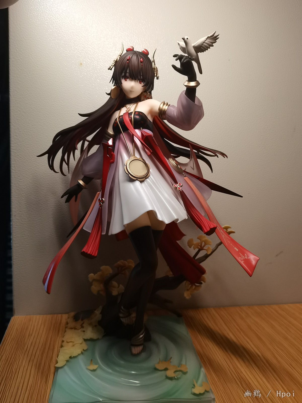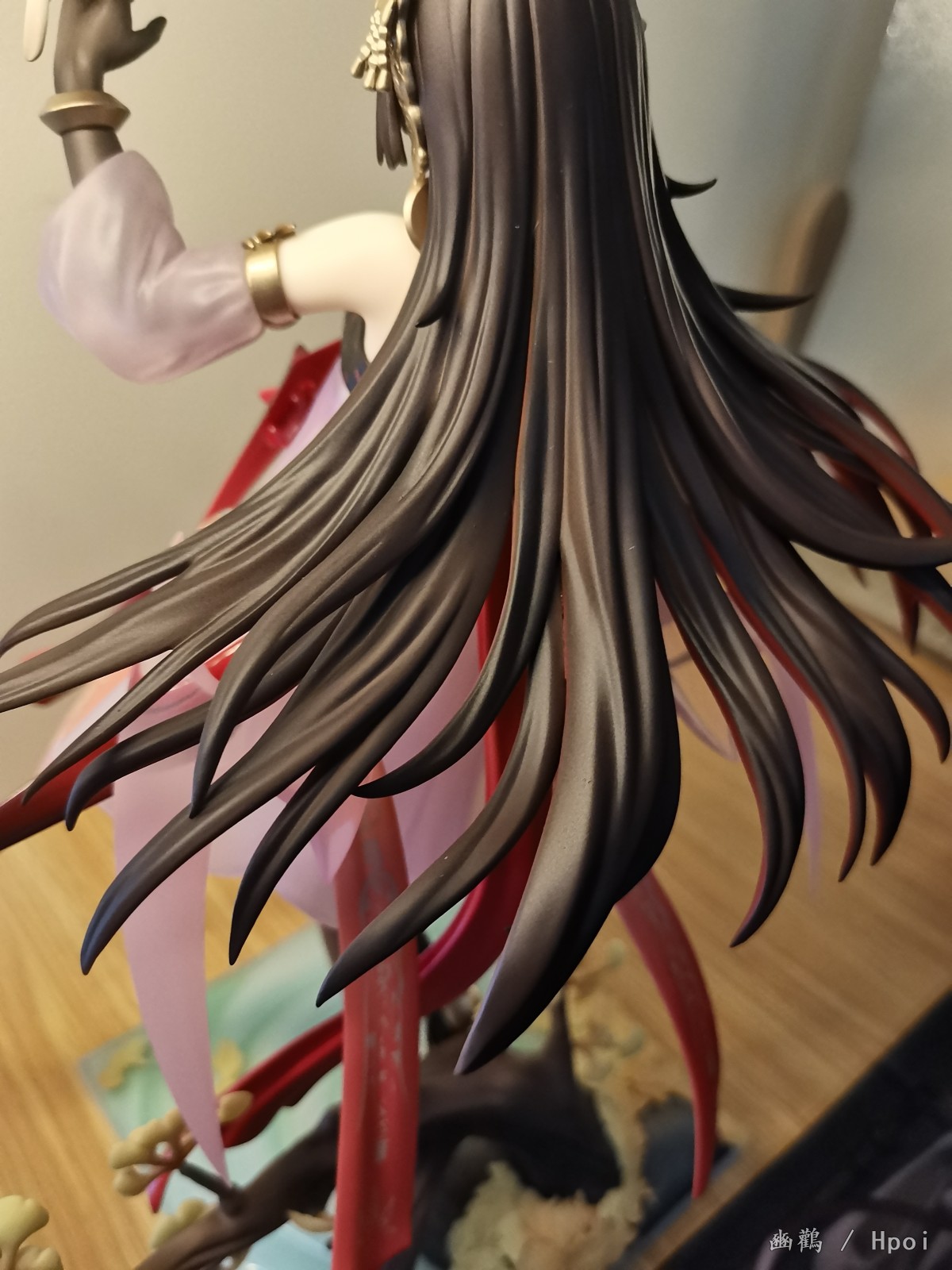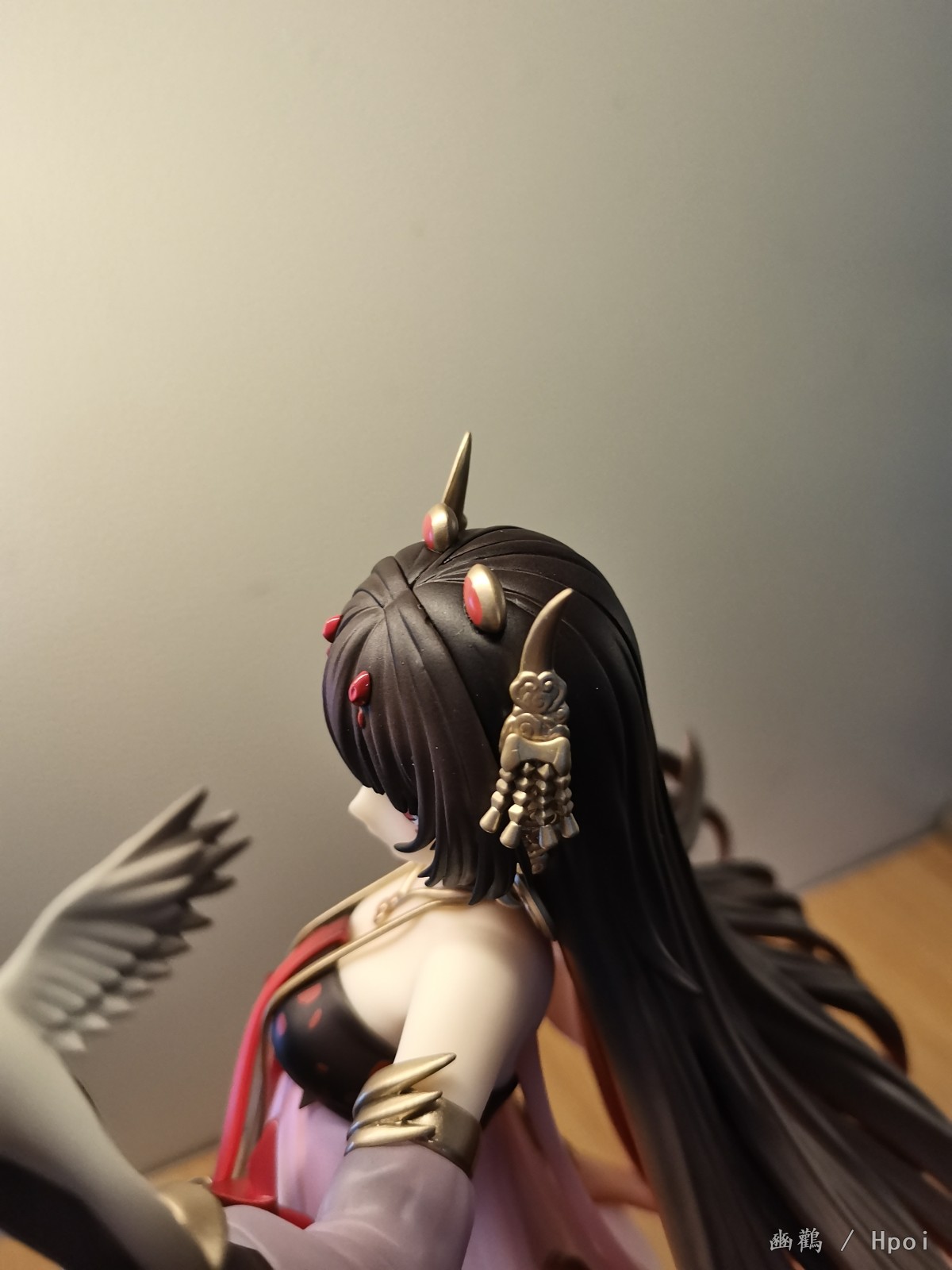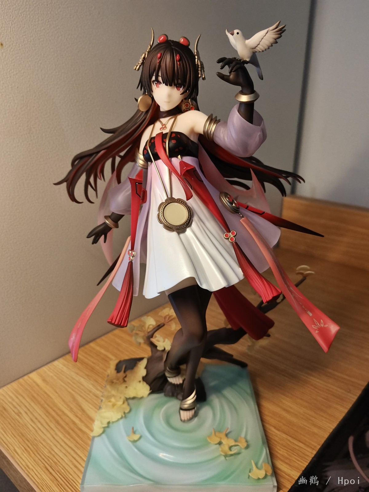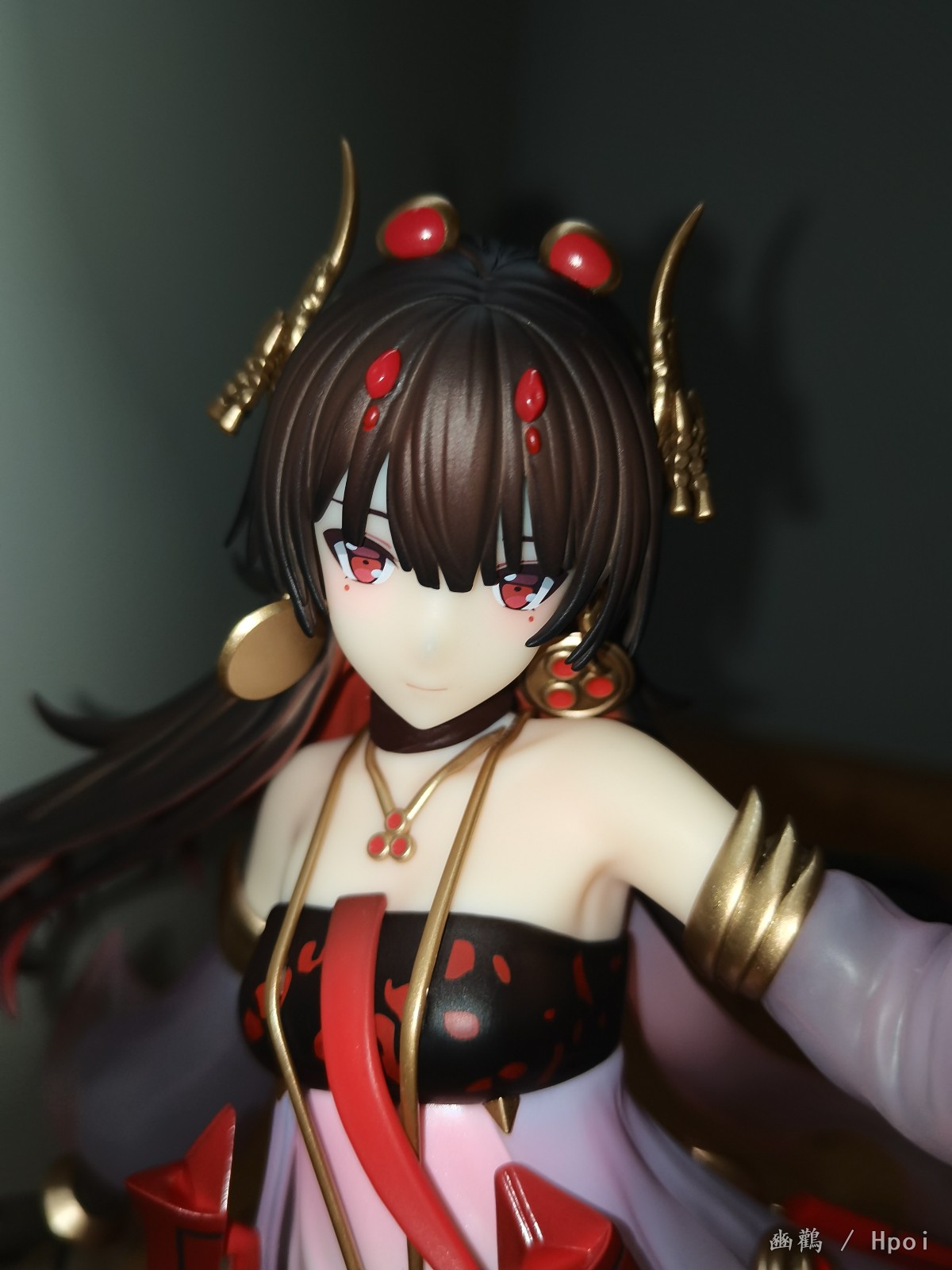 衣服外层是半透明渐变的朱红色,有种琉璃感,内层就是那种乳白色的裙子,手办的褶皱做的还行。还有就是身上的金属圆盘做的细节也ok