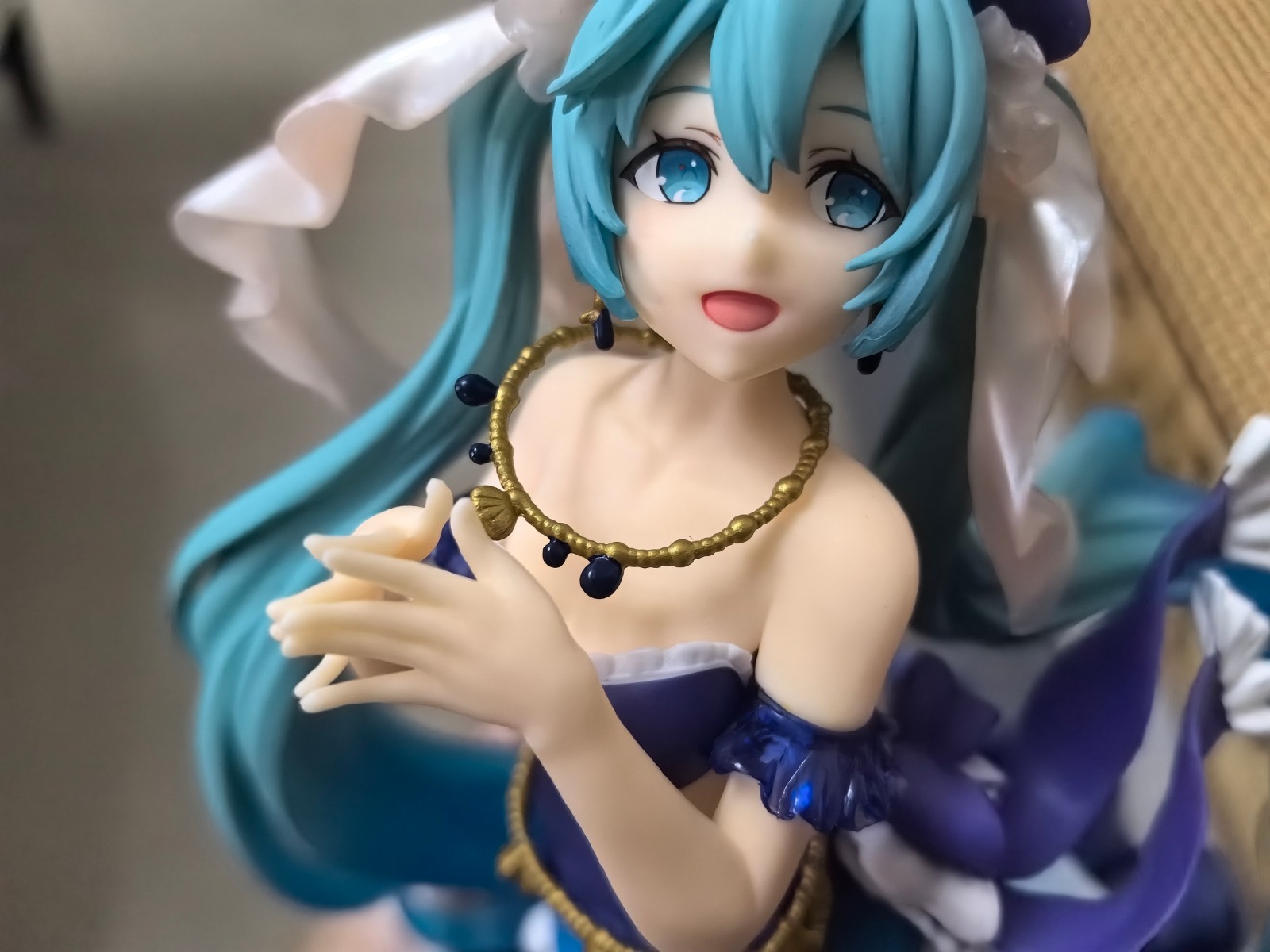 脖子上面是一个有金贝壳的挂链。这个虽然有金色和深蓝色的涂装,但是整个挂件看起来稍显粗糙和廉价。同时也可以看到初音的锁骨以及身体肌肤的一些刻画也展现了出来。