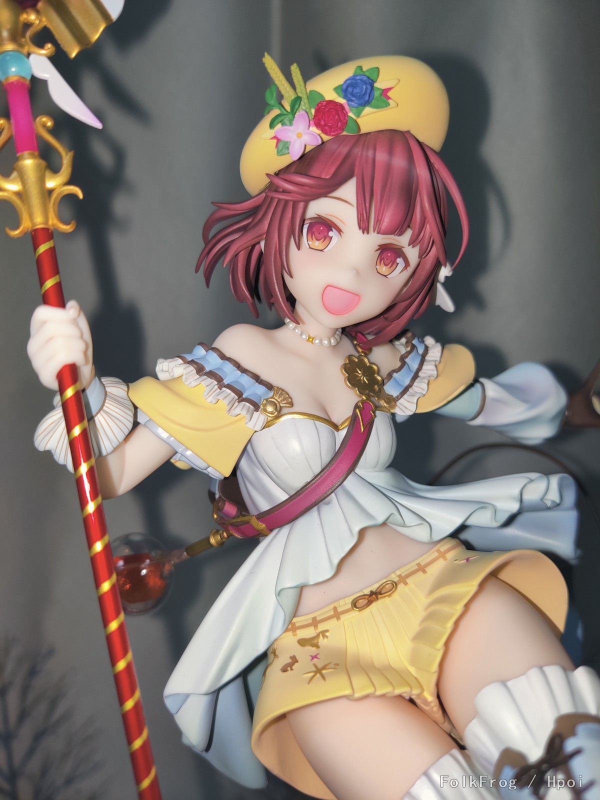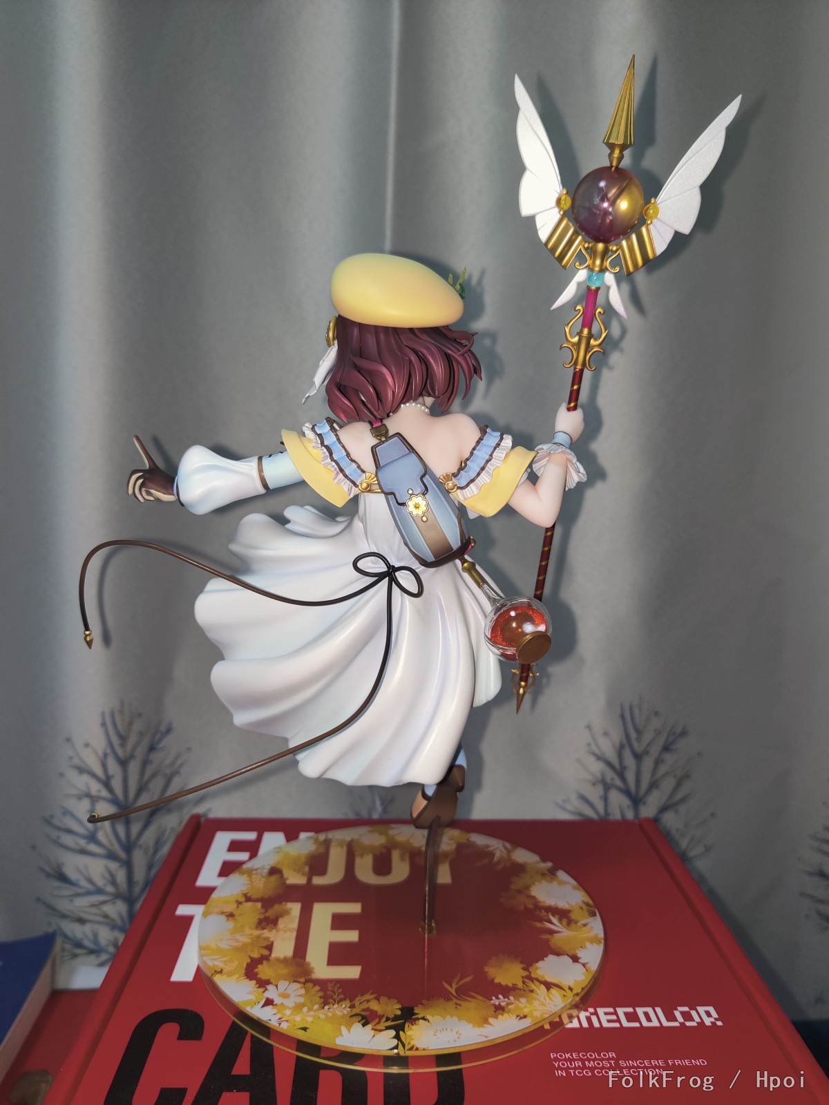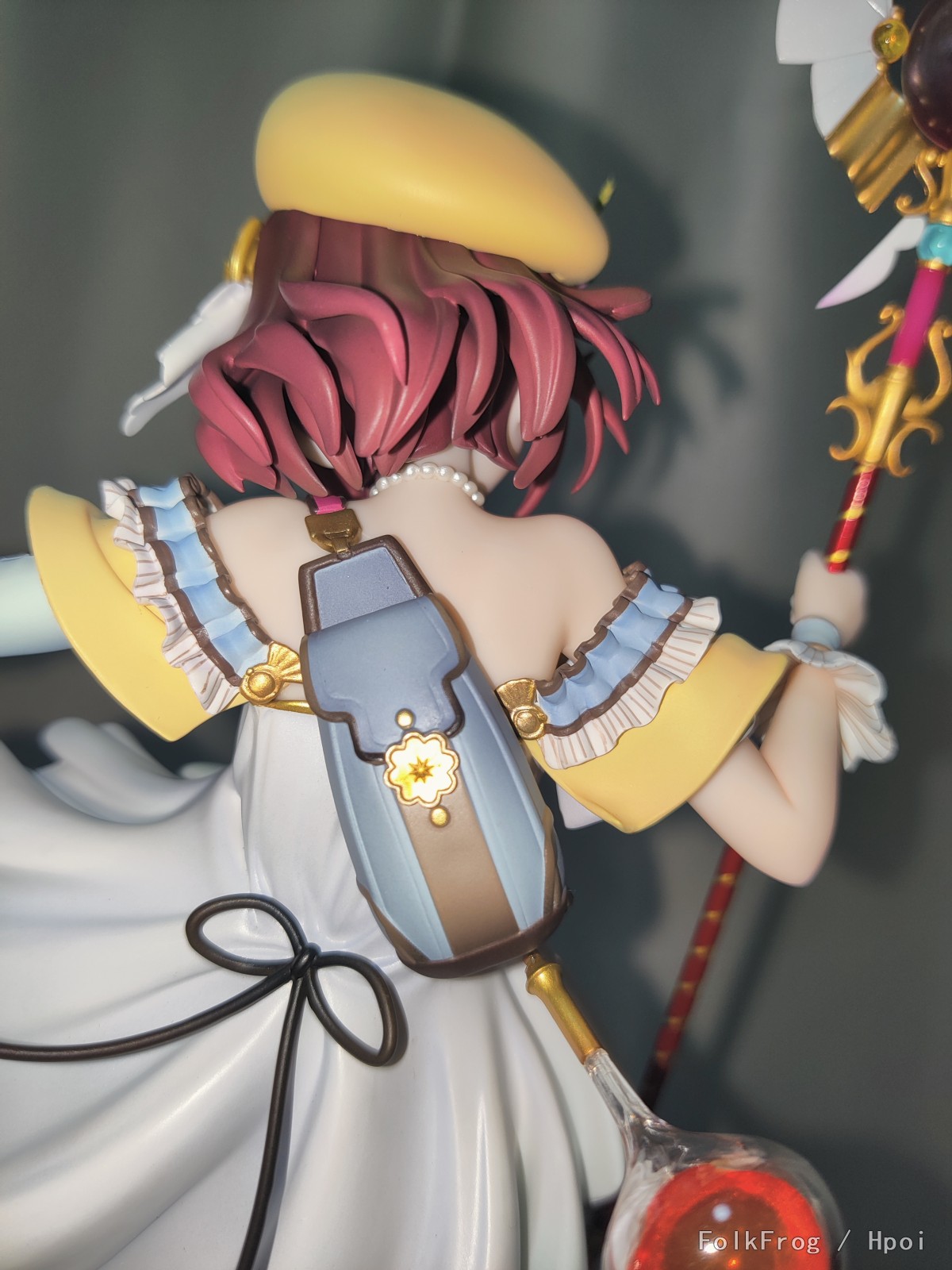 涂装看着很舒服,该金属漆就金属漆,裙子阴影过渡很好,不糊非常自然,本体的小装饰很多,帽子上的花朵也没有糊弄,开模精度确实是高,脖子上的小珍珠也很分明,头发处理也花了很多心思,后面是两层,另外吐槽一句这个桩位安装真是非常特别。