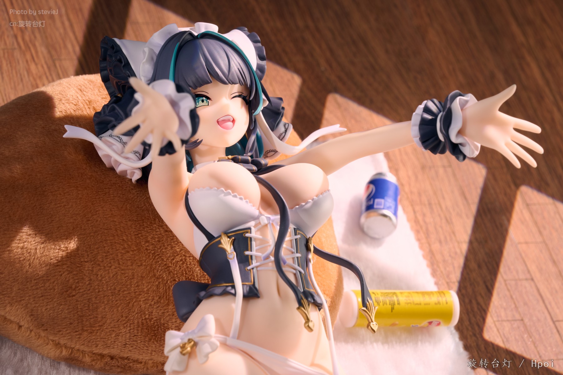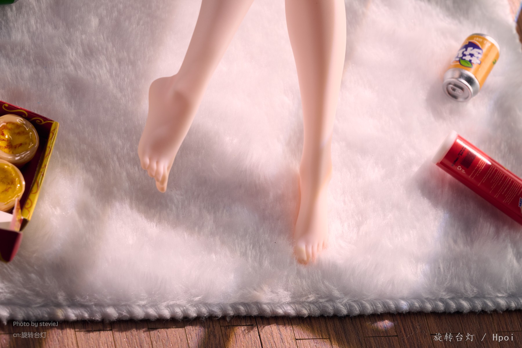 做工和涂装看着都非常的涩气,但是躺姿是真的不好拍啊,场景上也没什么思路,奇奇怪怪地摆了一些食玩和一个鸡腿枕头上去。