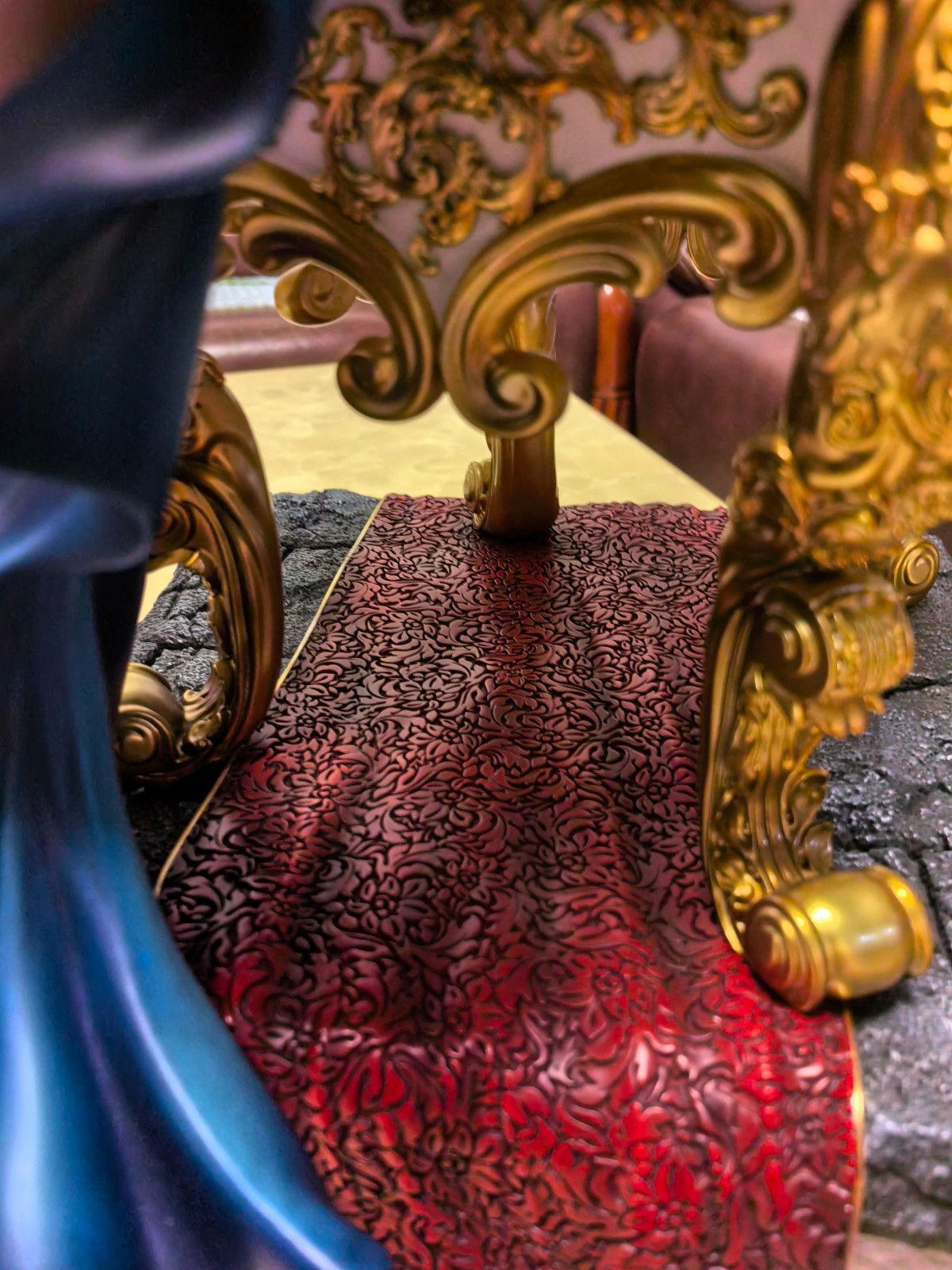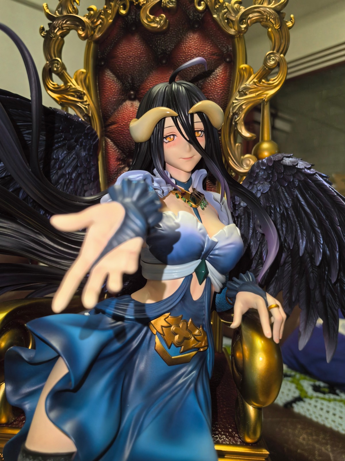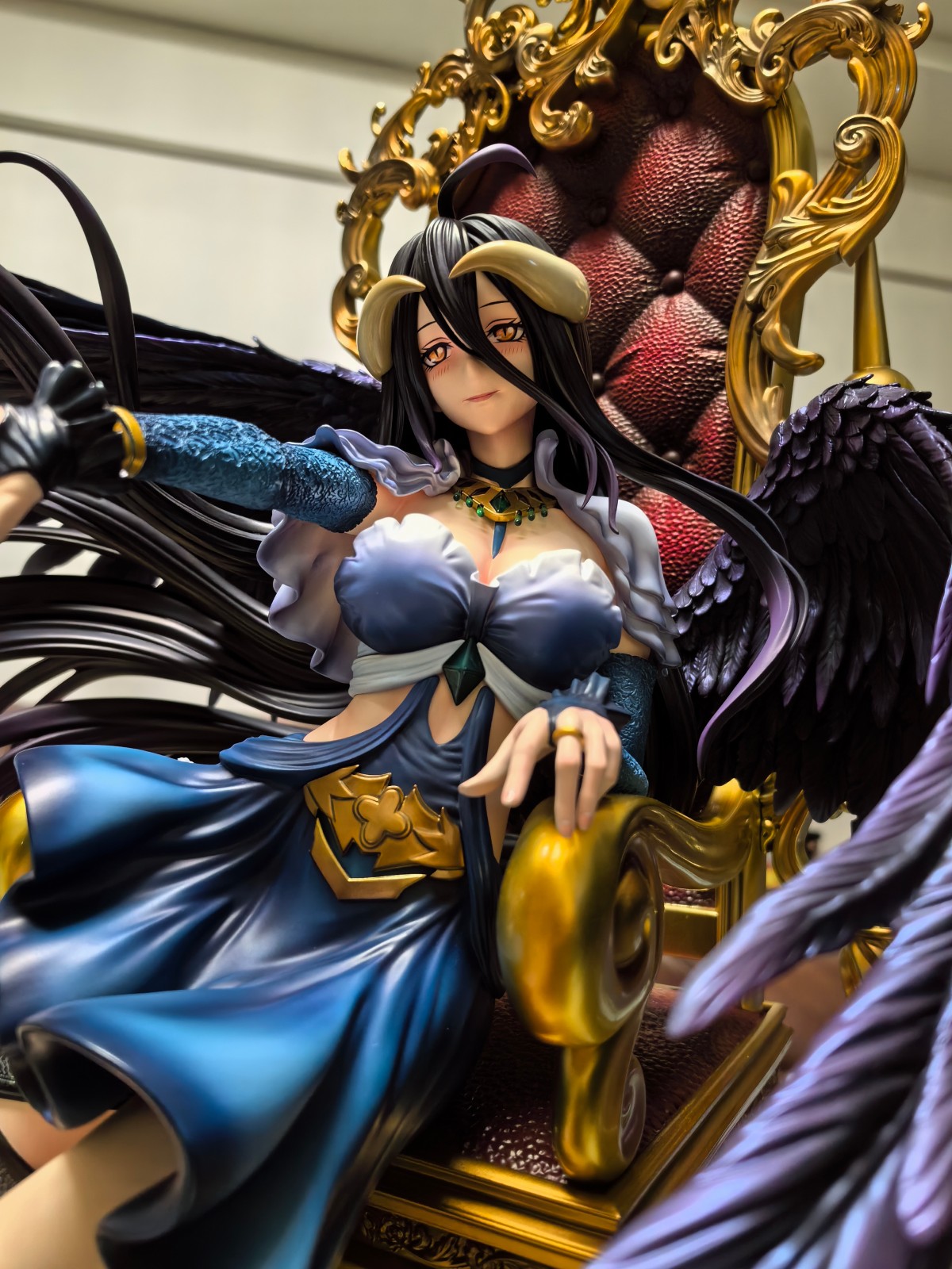 人物整体的蓝紫色和座椅的金红色撞色很有视觉效果。面雕部分还是做得很好的,羚邦给的应该是TV动画的授权,还原度方面面相是往动画的形象靠的,虽然没办法达到小说插画里雅儿贝德的绝世美颜,但个人来说还是比较满意的。服装造型没啥挑的,单侧腿环很涩_(:з」∠)_