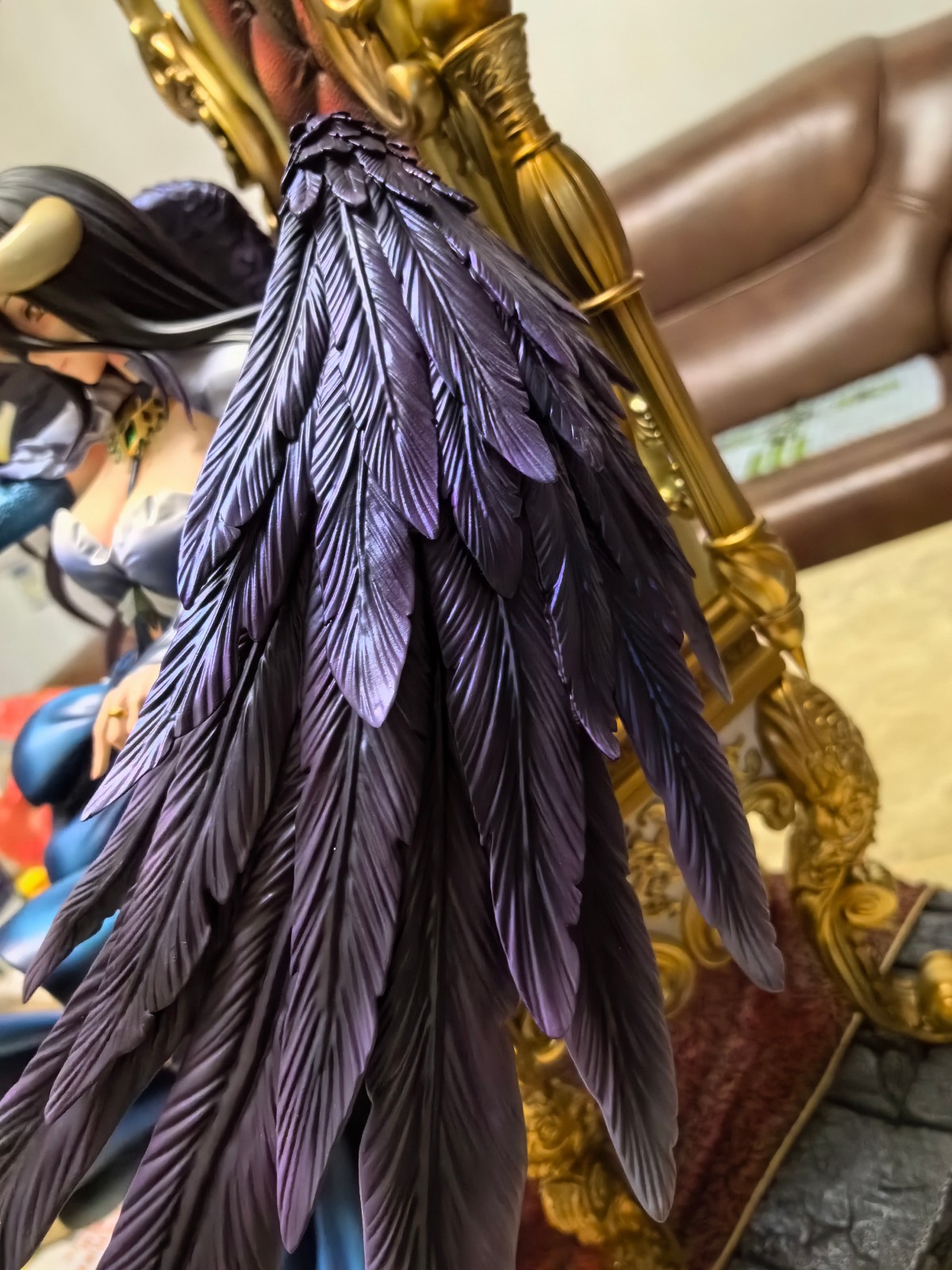 细节方面翅膀、座椅和地台的纹路都做的很细致(请无视拍照时忘记拿掉的底座泡沫纸),该有的阴影和金属色涂装也没有偷懒,手上的指甲也做了涂装,两个大翅膀非常具有视觉冲击力,没有像某些作品一股子海带和塑料感我认为已经是成功了。
