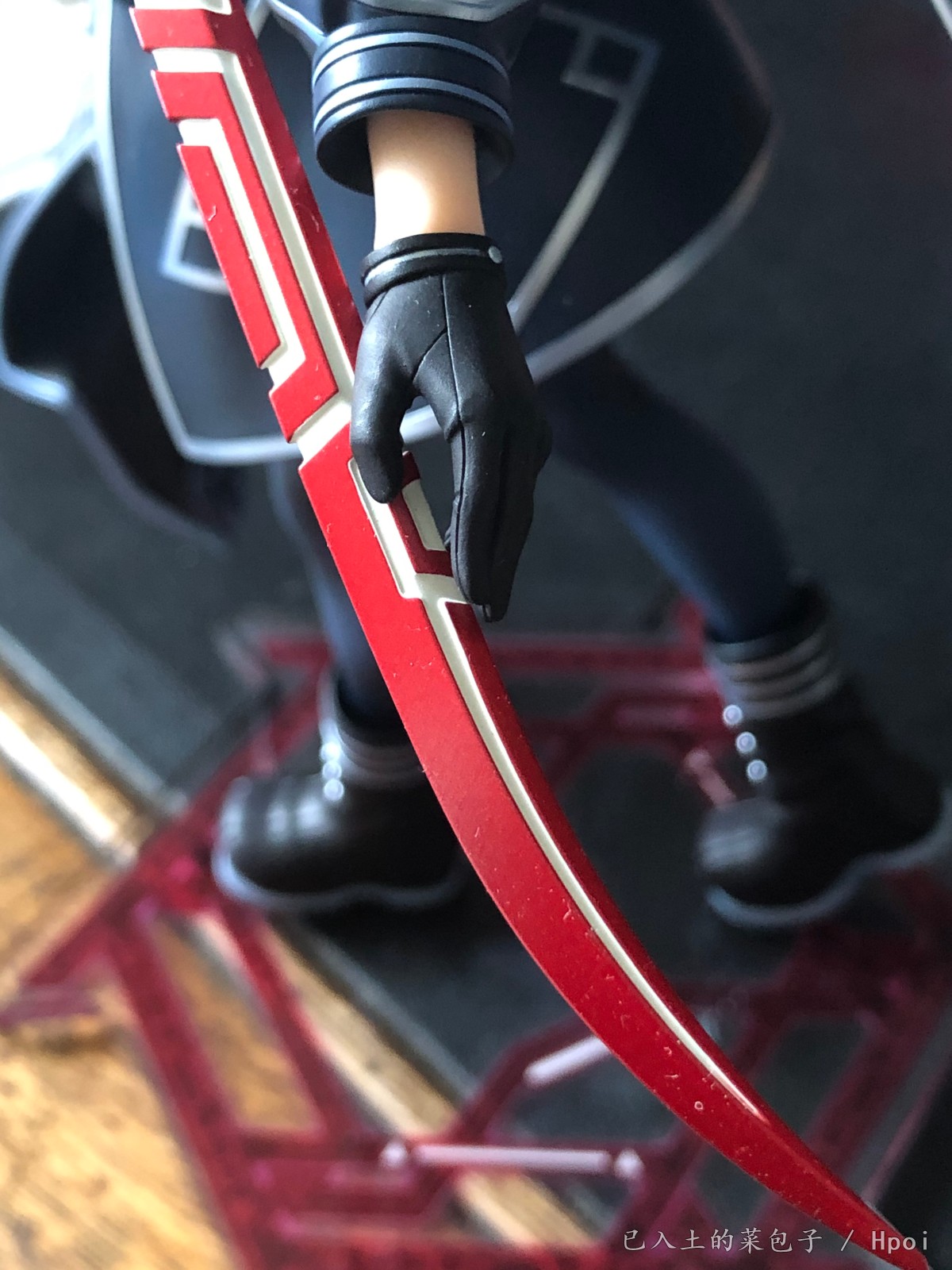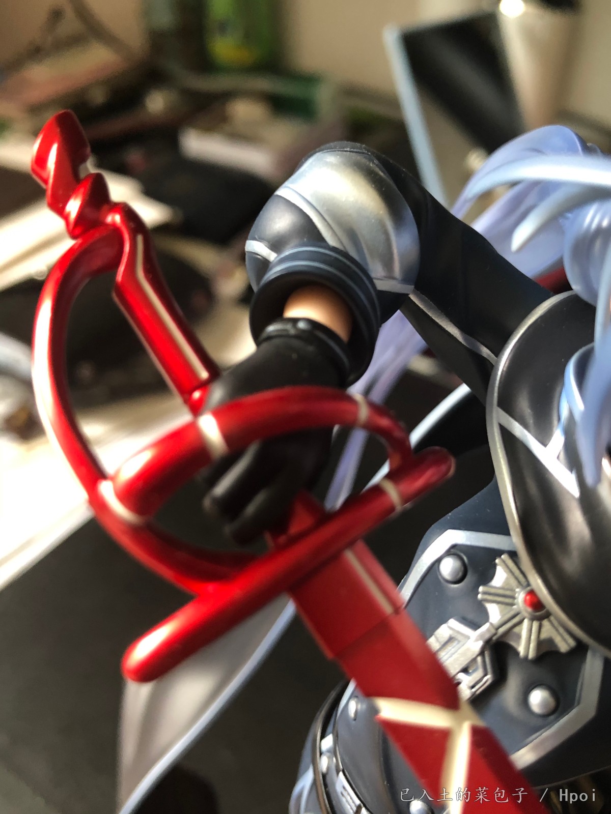 武器:有金属亮油涂装,配上白色纹路。剑把尾部卡榫可以打开,插到手上再按回去