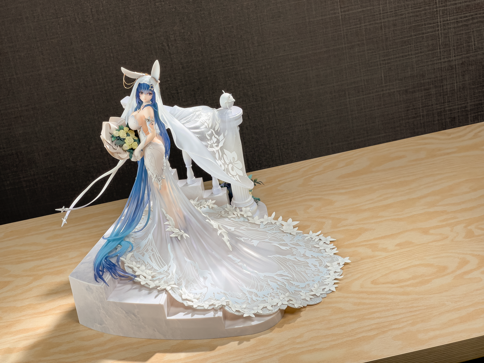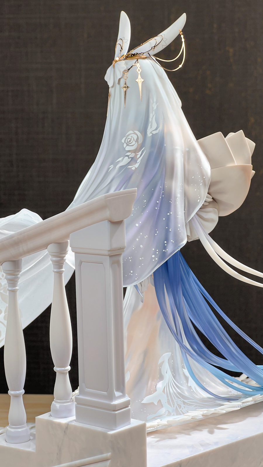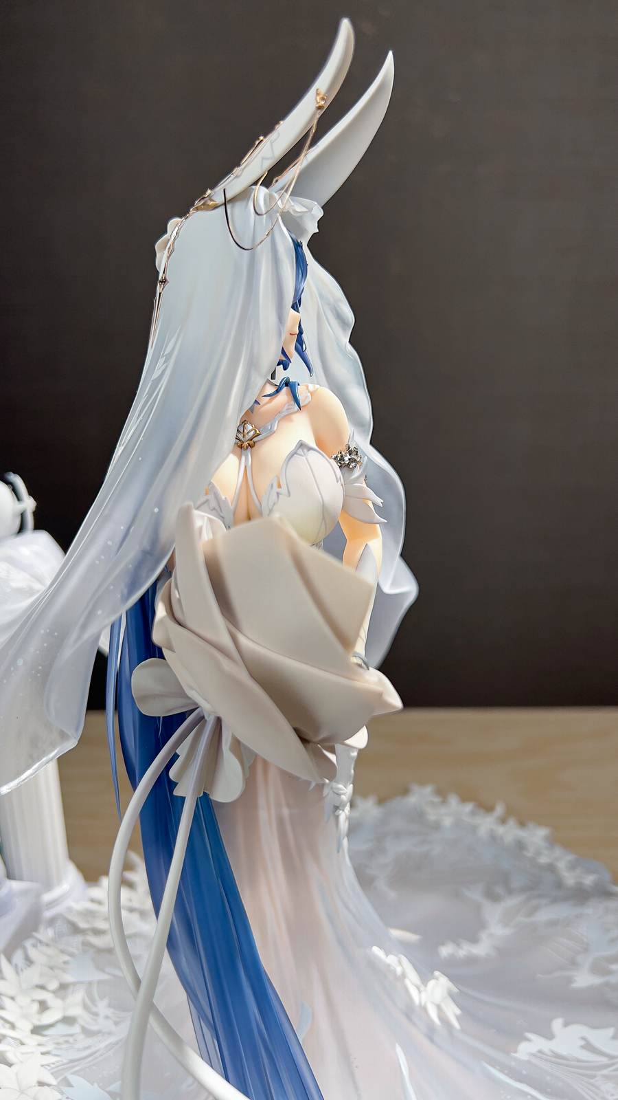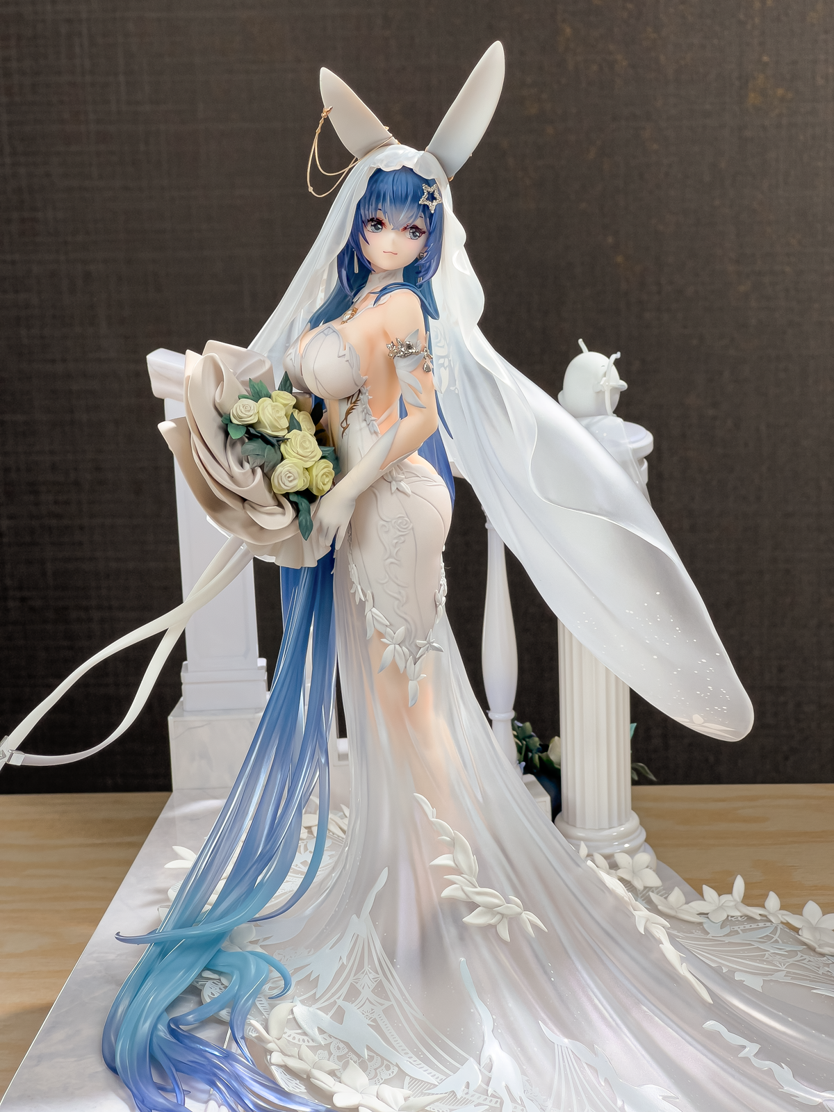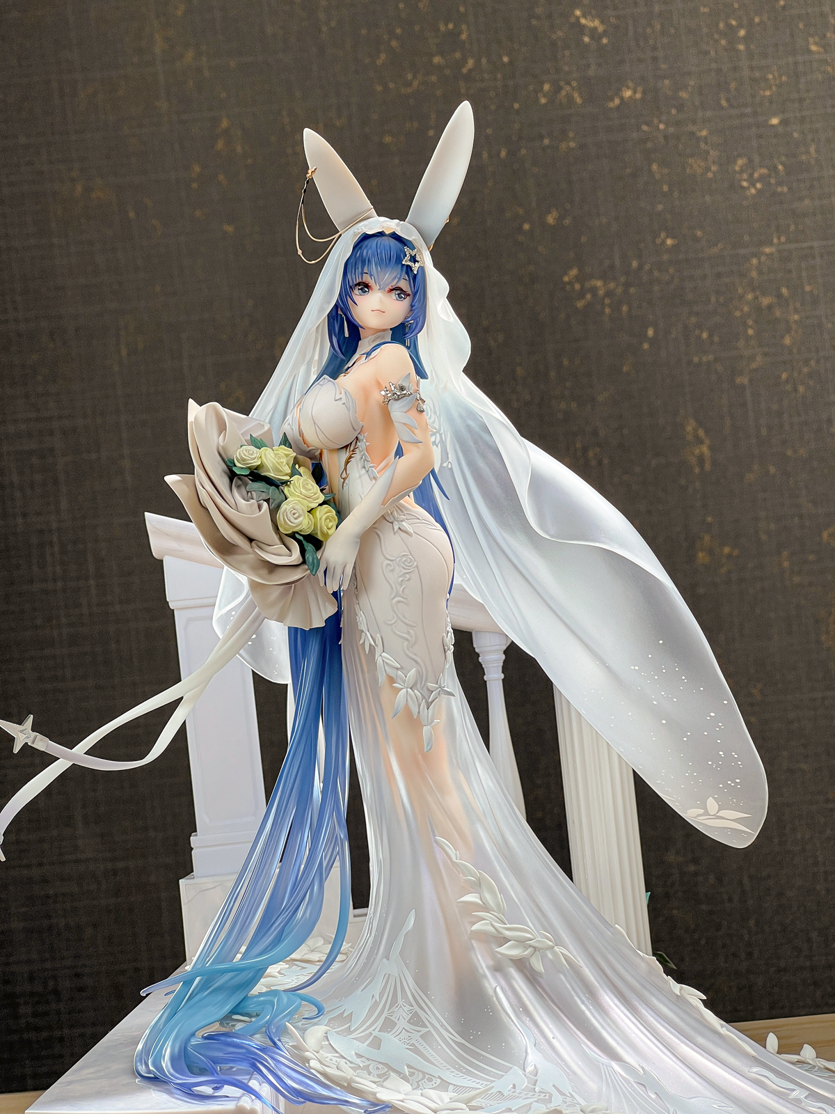 没相机,拍了几张可以直观看看大小,虽然只是1/7的比例但加了地台一下子变大了好多,观感也不错。装头纱的时候可以把黄鸡雕塑拔了,方便把头纱卡在栏杆上,over。