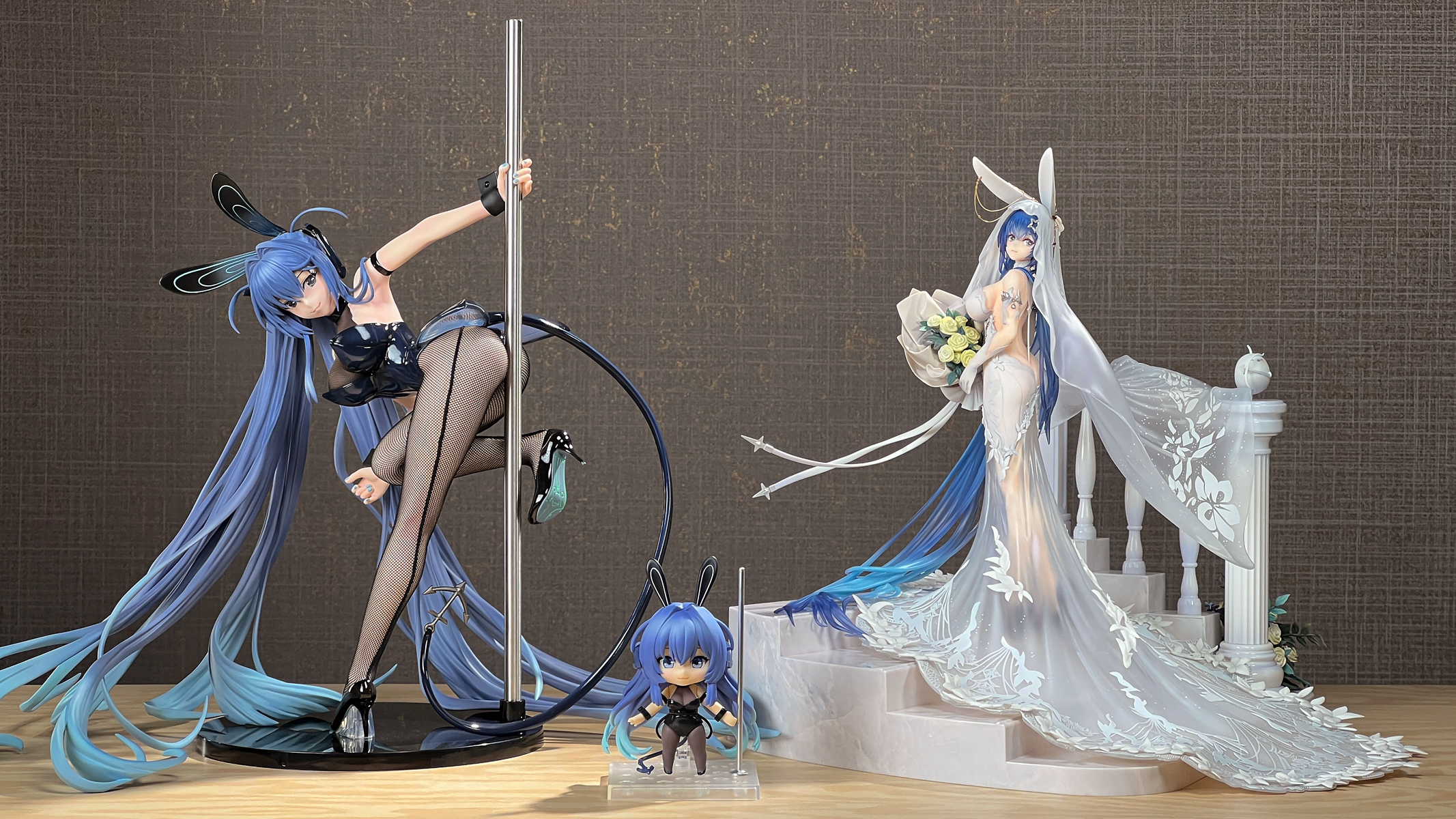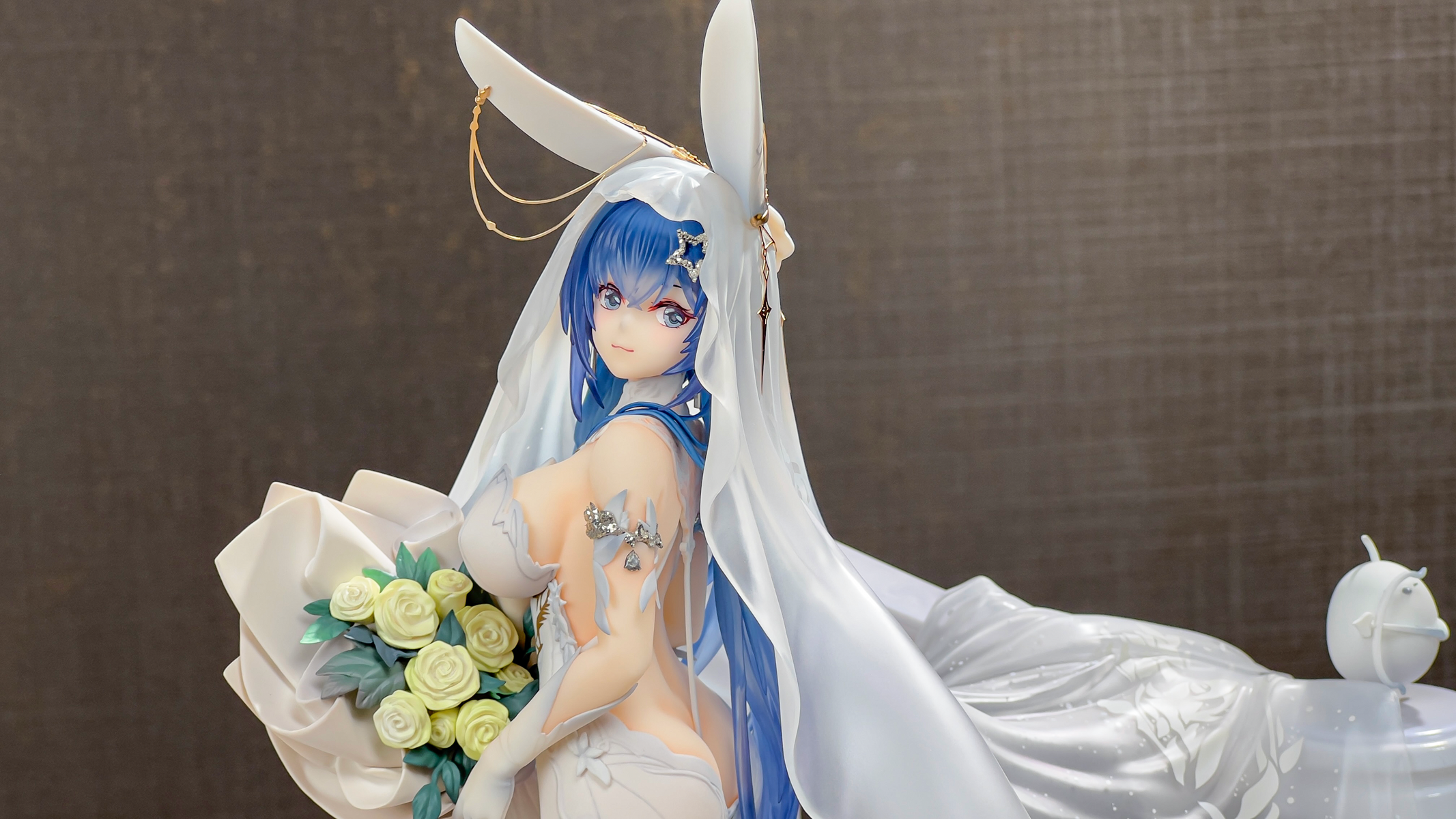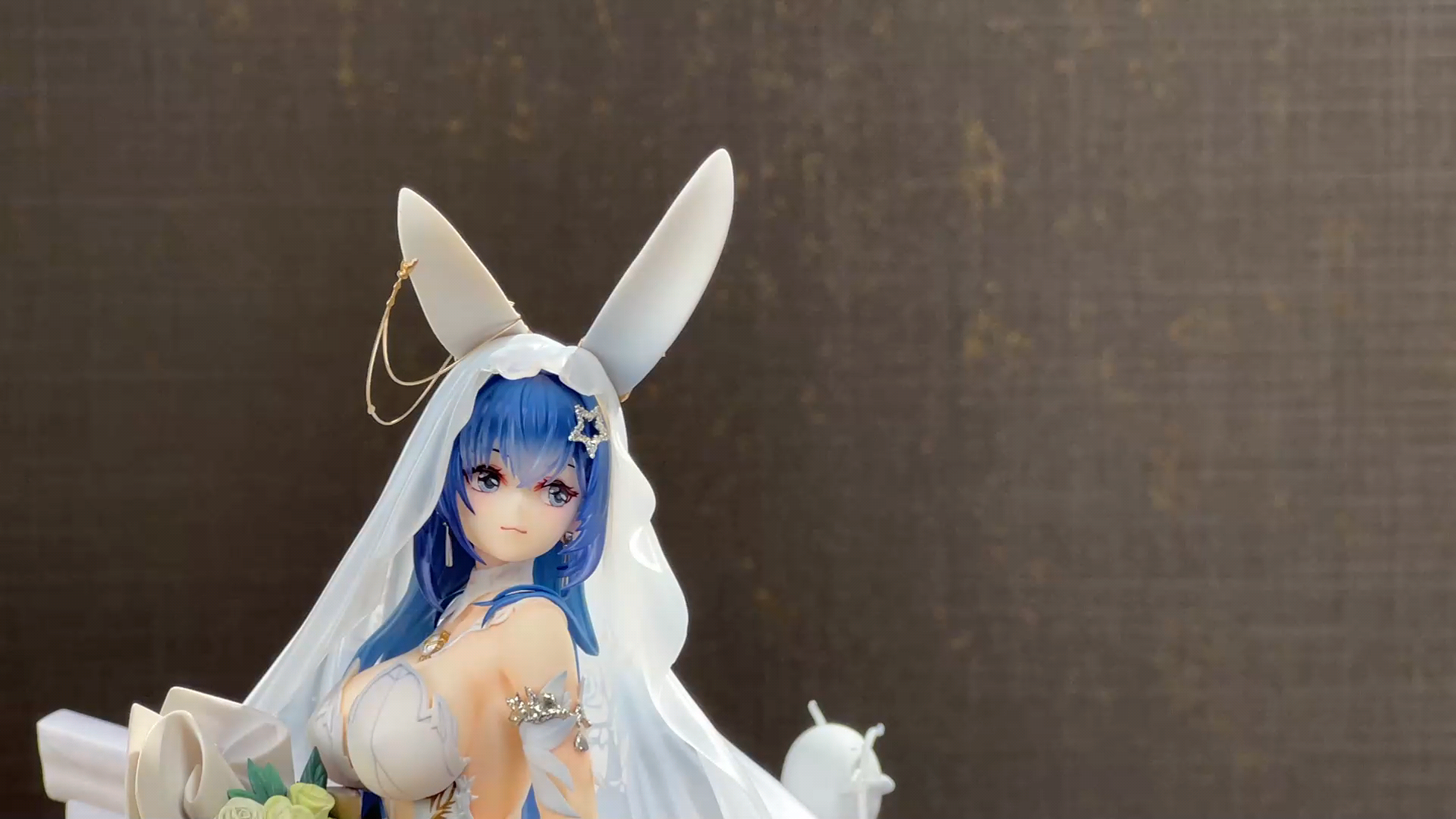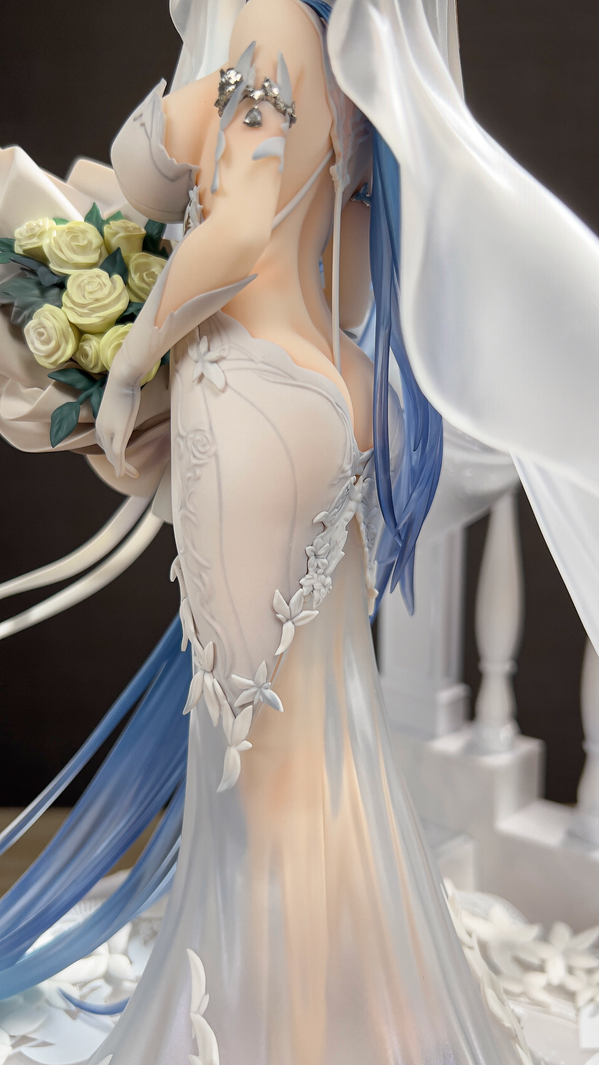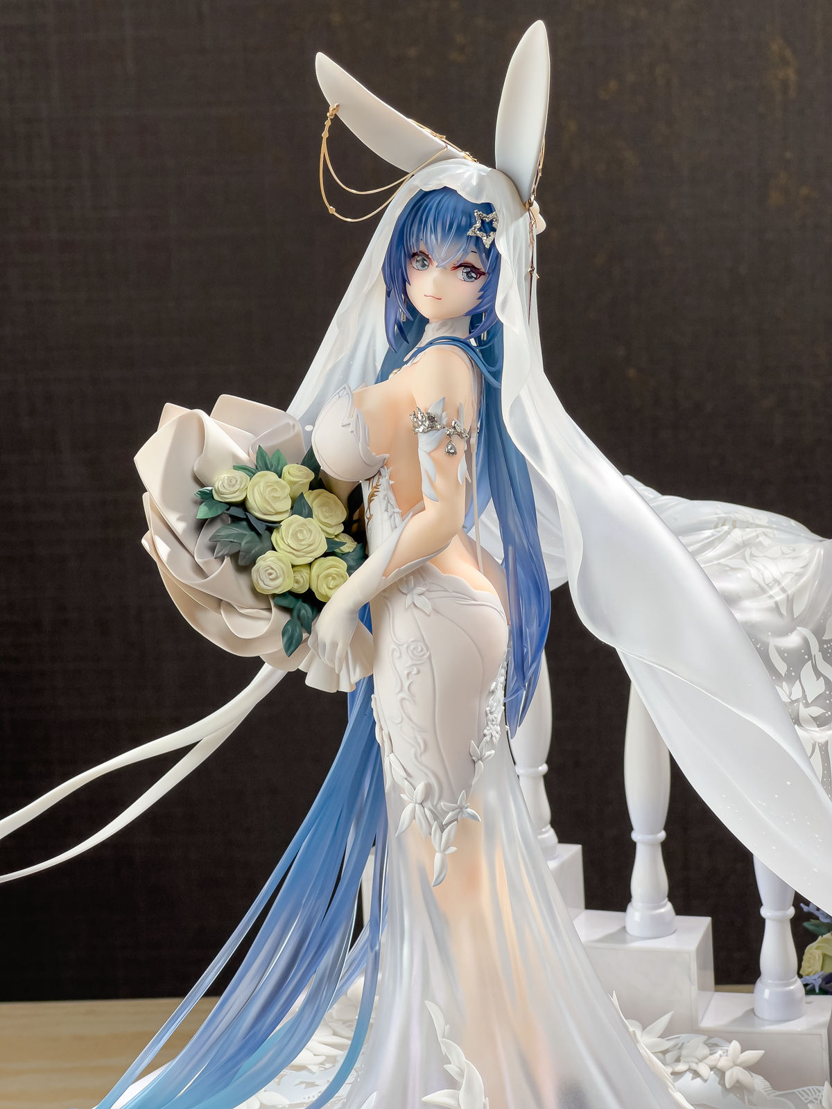 没相机,拍了几张可以直观看看大小,虽然只是1/7的比例但加了地台一下子变大了好多,观感也不错。装头纱的时候可以把黄鸡雕塑拔了,方便把头纱卡在栏杆上,over。