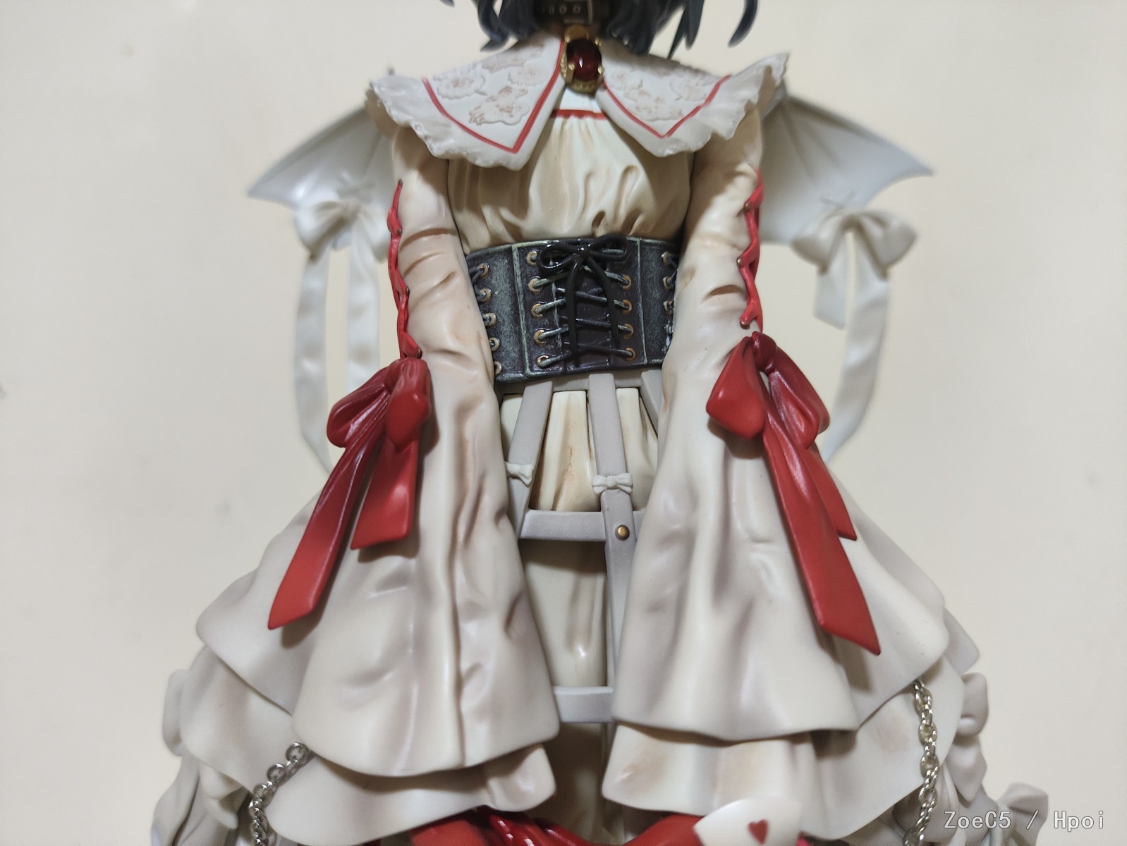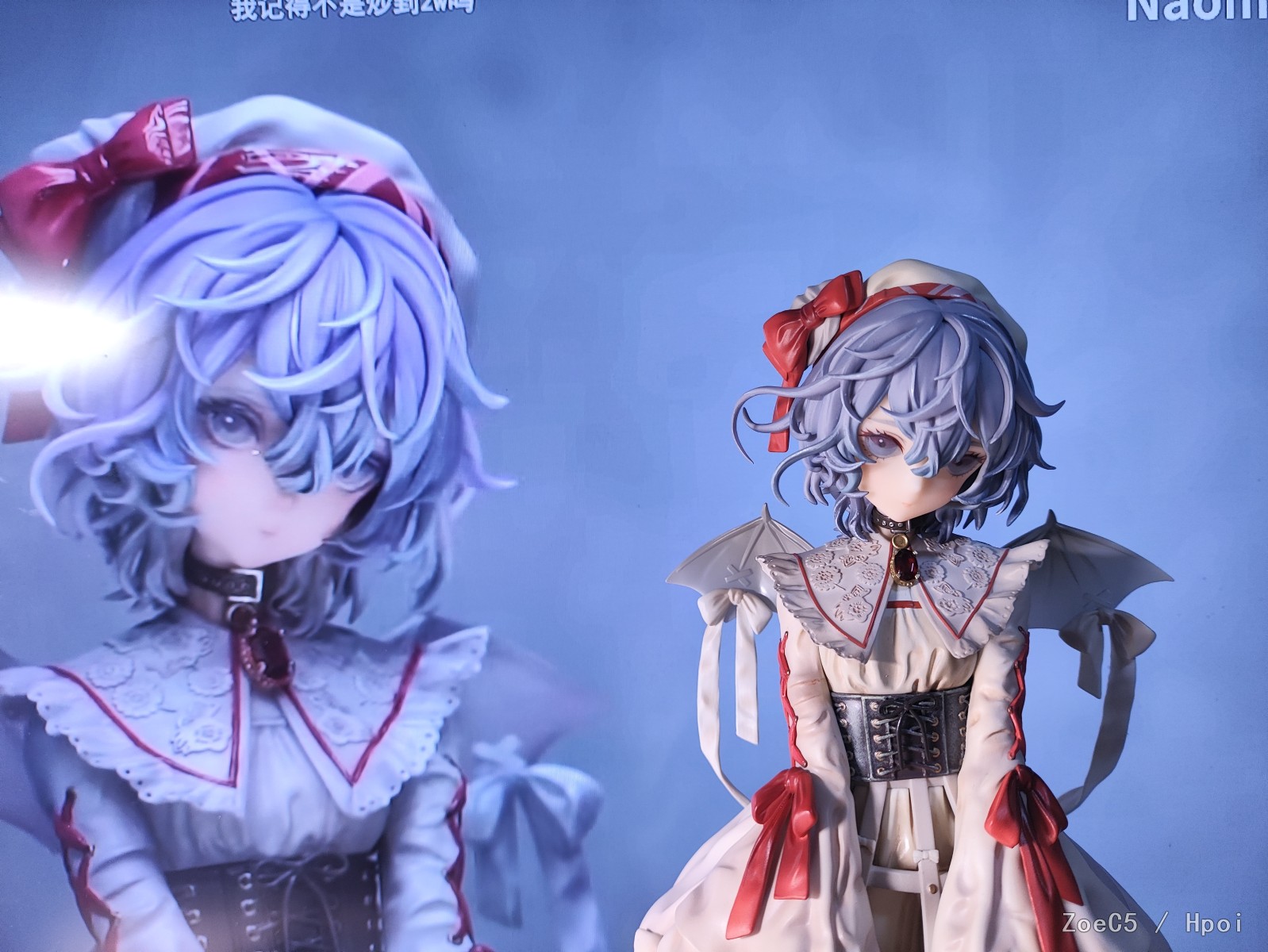 然后很多人喷的头发白色笔刷涂装,我这个肉眼在亮光下看起来倒也不算扎眼,不怼脸拍远看没啥问题。但是又肉又糊又糙这个实在是硬伤,加上这个发型就比较复杂,现在这个表现不是乱,而是像章鱼✘。。。我更在意的还是眼睛,原本的是带光油水灵灵的,大货专门做成了失神放大的效果,而且眼睛这块面雕是有点往外凸的,角度限定有些恐怖谷效应,gk没有这个问题。