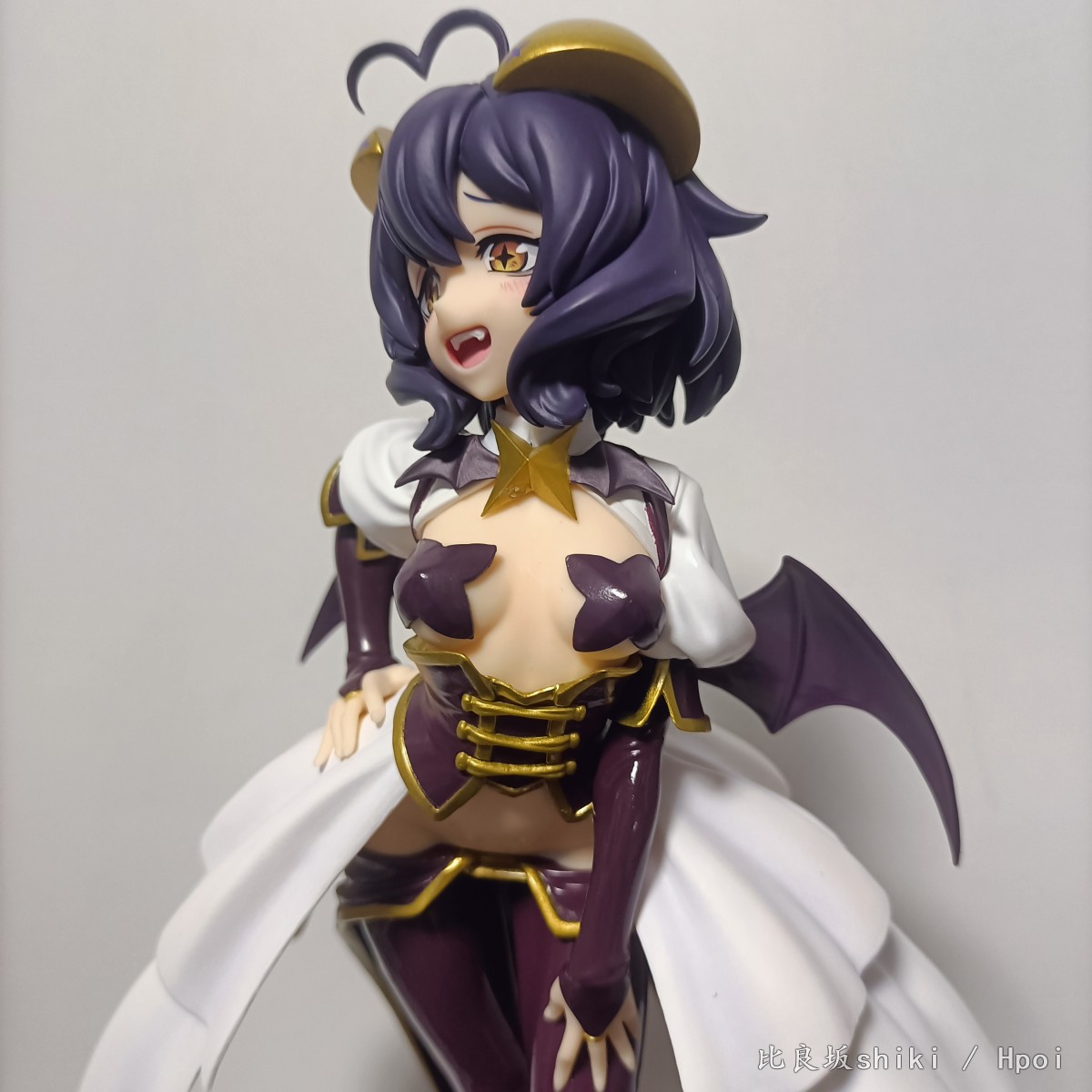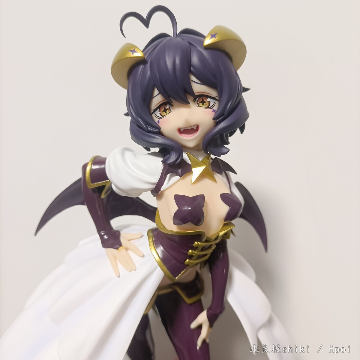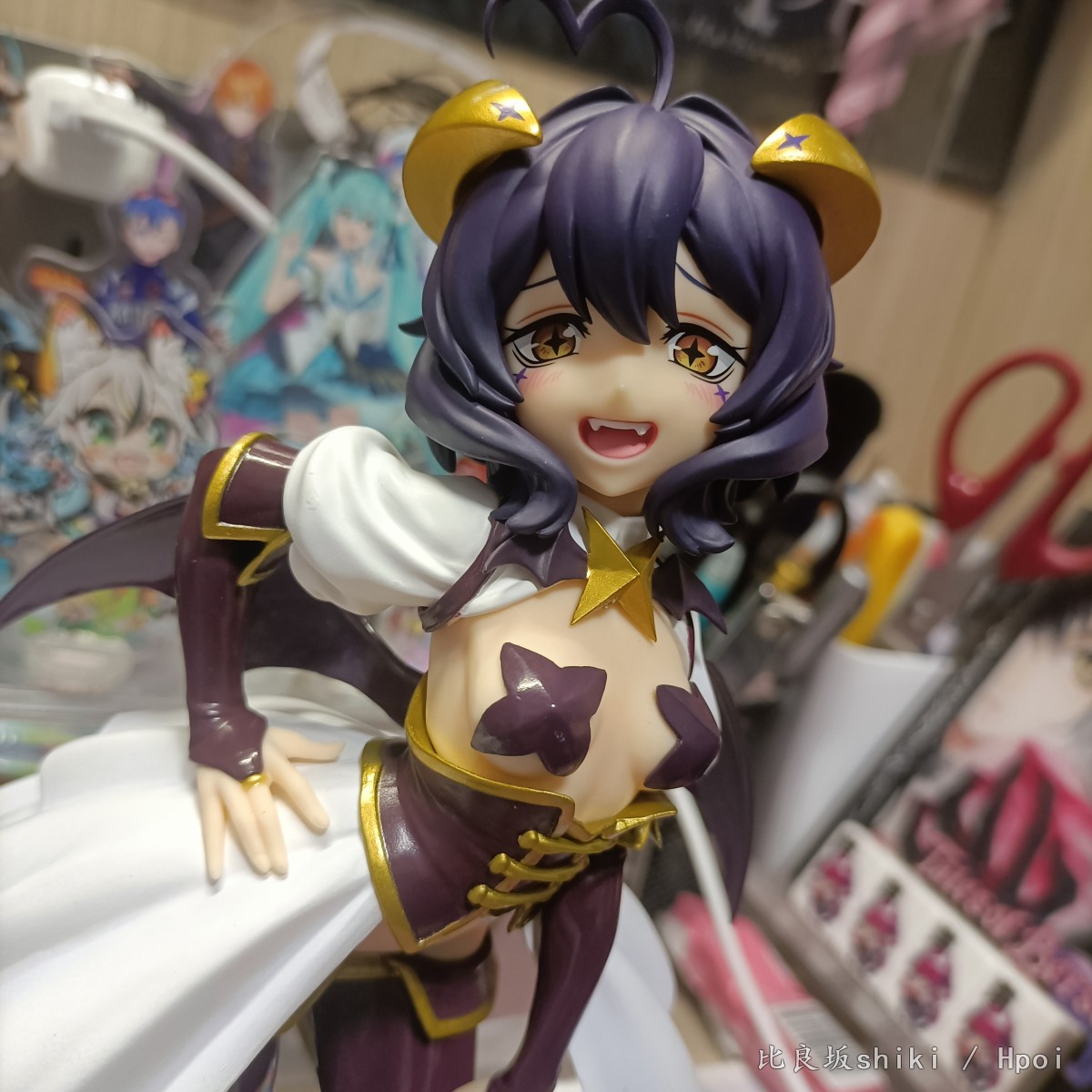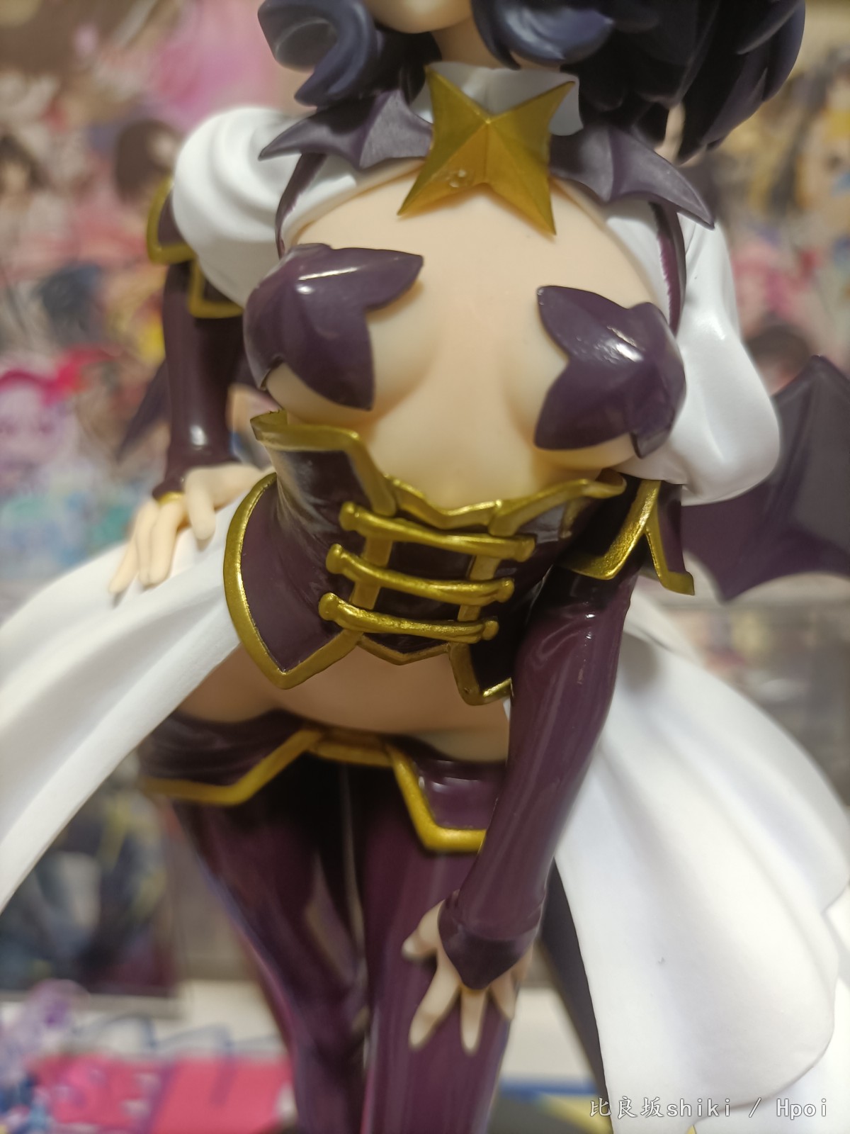 原图直出,灯光原因有点偏黄,不过问题不大 这款舞缇娜可以说做到了90%还原官图,除了脸部稍显圆润,眼距稍近以外可以说完美 。 L size还算比较大,地台是简约小盘子,脚桩为透明塑料,这个姿势总感觉会重心偏移,脖子上的星星有水口,老惯犯了 服装茄子紫皮衣部分质感略显廉价,感觉世嘉很多景品就用的这种漆,但是头发消光,犄角金色质感还可以,这个金漆让人有点担心时间长了会不会色移…… 看官图觉得欧派上海星略大,实际看并不违和,毕竟是全年龄向的,欧派形状很完美,略微凸显的鲨鱼腹也非常色气,还有这个完美的低腰凸显胯部线条 喜欢的可以闭眼入了,总而言之一本满足
