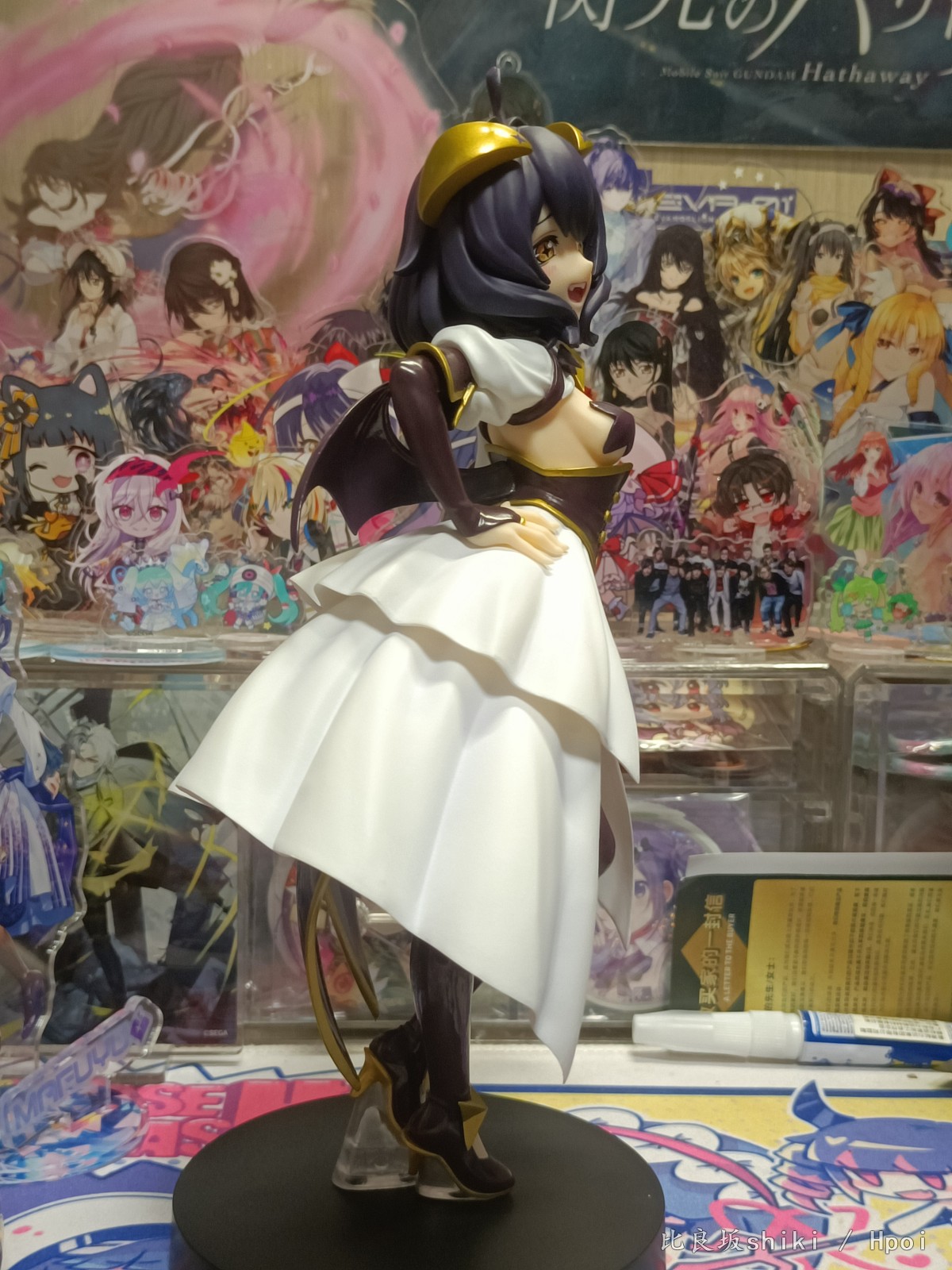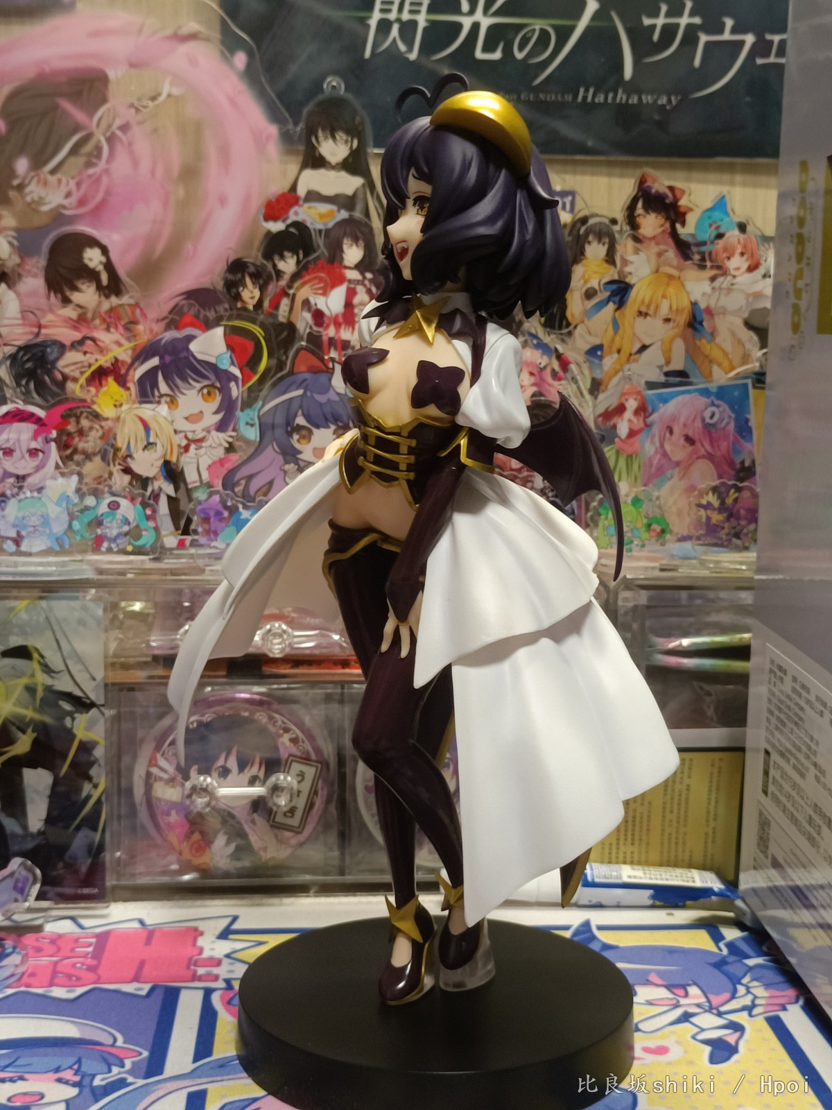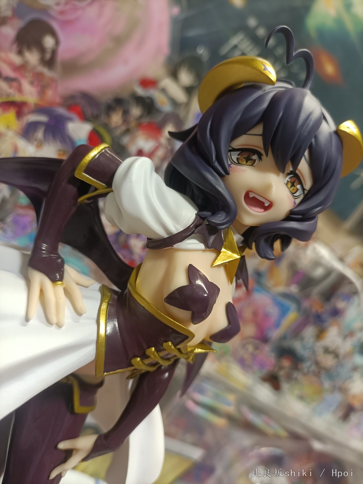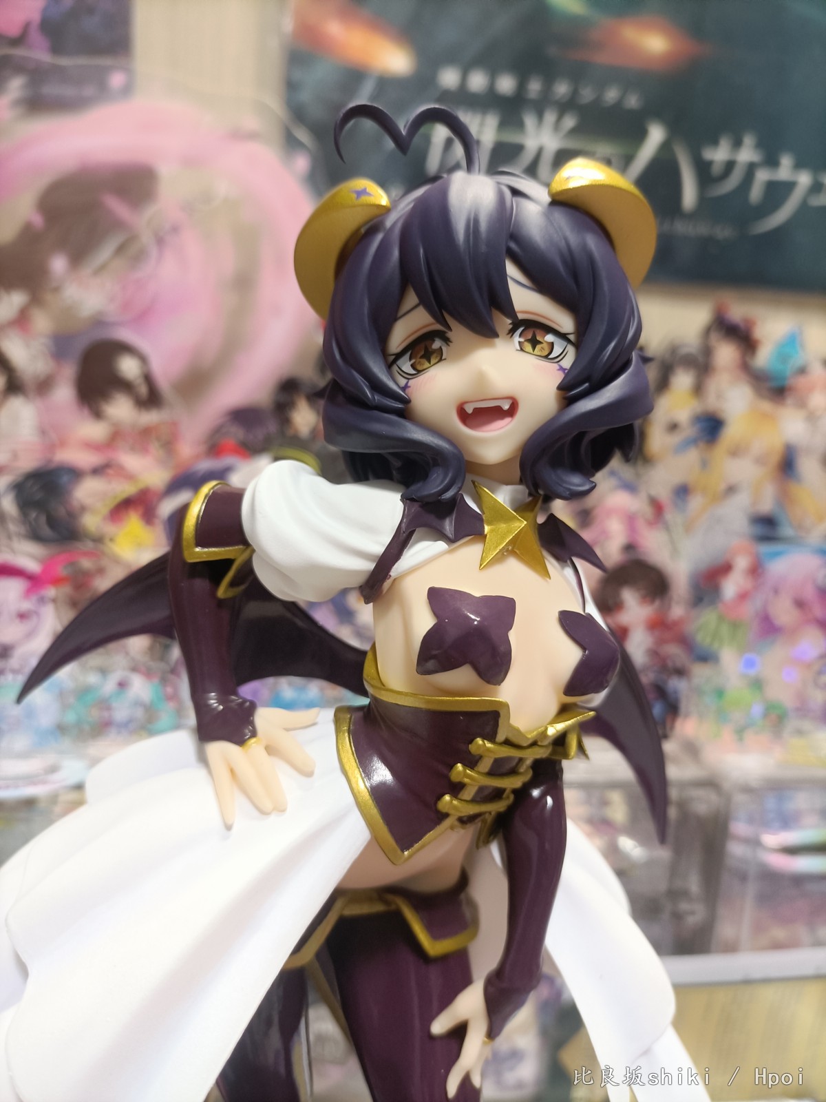 原图直出,灯光原因有点偏黄,不过问题不大 这款舞缇娜可以说做到了90%还原官图,除了脸部稍显圆润,眼距稍近以外可以说完美 。 L size还算比较大,地台是简约小盘子,脚桩为透明塑料,这个姿势总感觉会重心偏移,脖子上的星星有水口,老惯犯了 服装茄子紫皮衣部分质感略显廉价,感觉世嘉很多景品就用的这种漆,但是头发消光,犄角金色质感还可以,这个金漆让人有点担心时间长了会不会色移…… 看官图觉得欧派上海星略大,实际看并不违和,毕竟是全年龄向的,欧派形状很完美,略微凸显的鲨鱼腹也非常色气,还有这个完美的低腰凸显胯部线条 喜欢的可以闭眼入了,总而言之一本满足