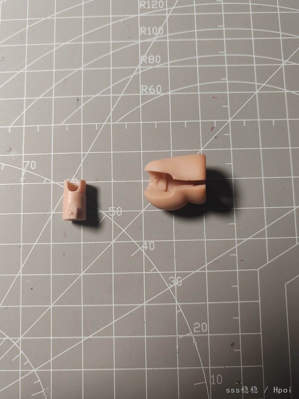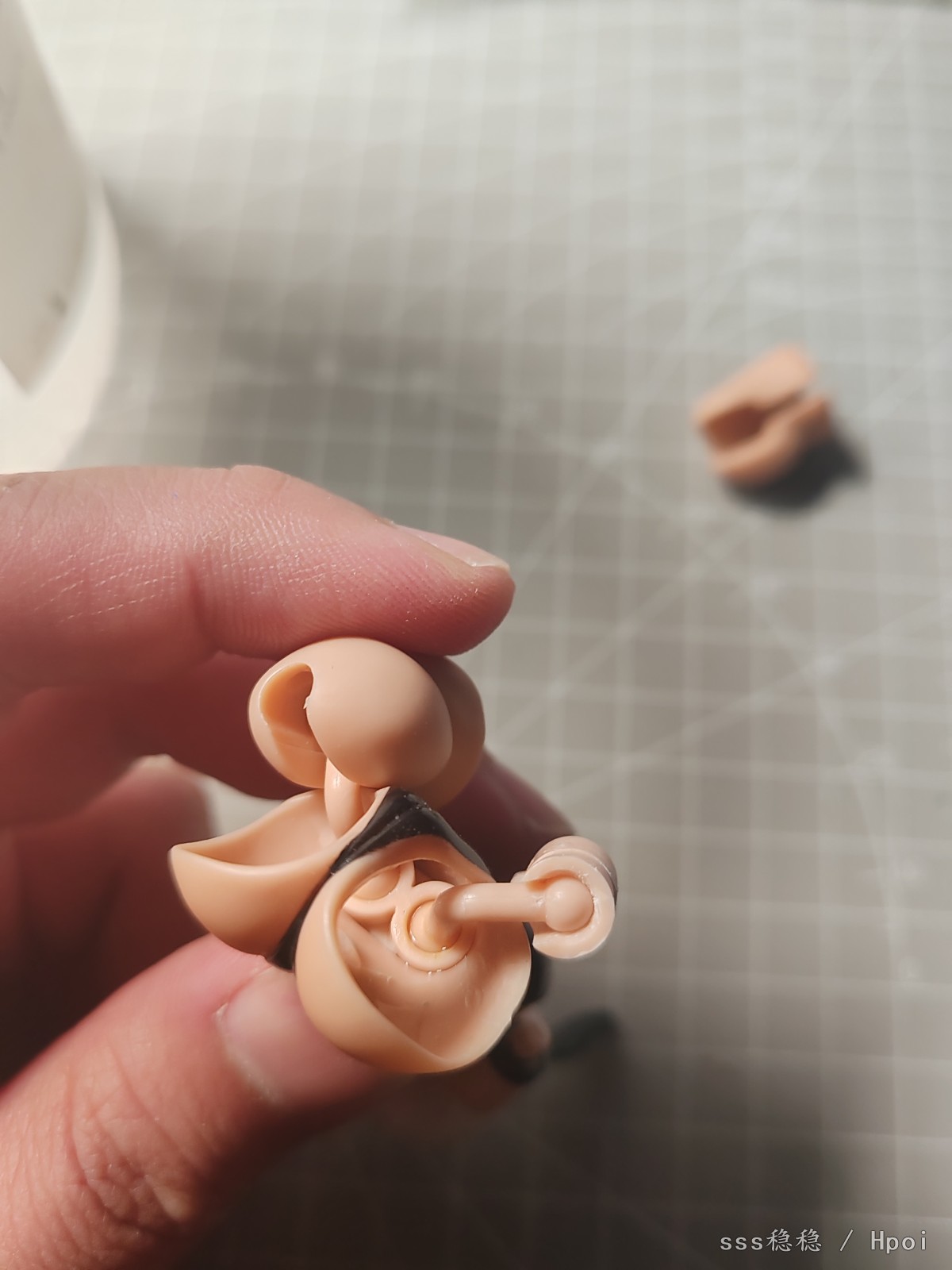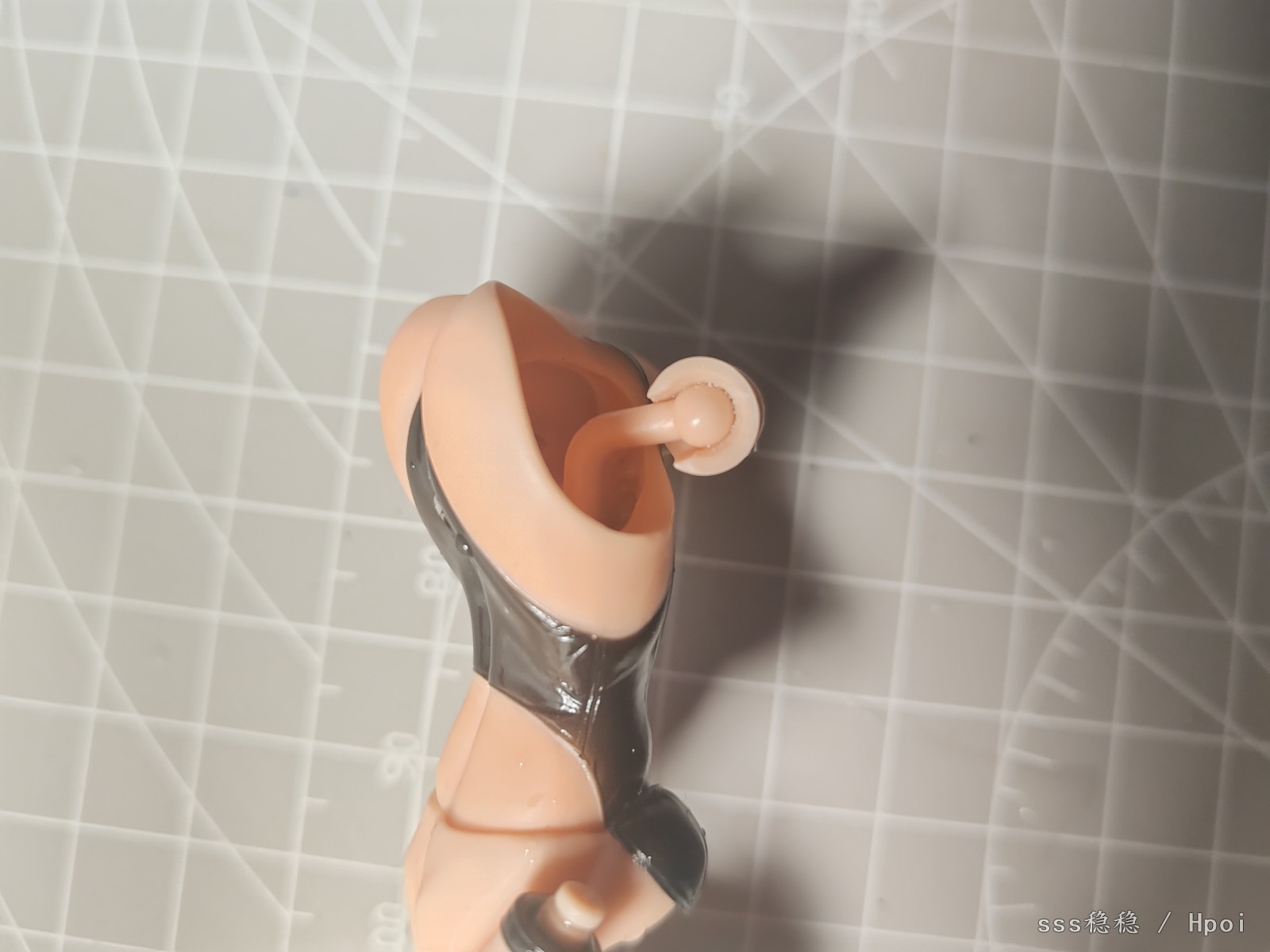 为了方便确定问题,直接沿着合模线切开大腿取出球窝。个人认为可动玩具的可动性大于美观性,并且大腿内侧粘合后不太明显。