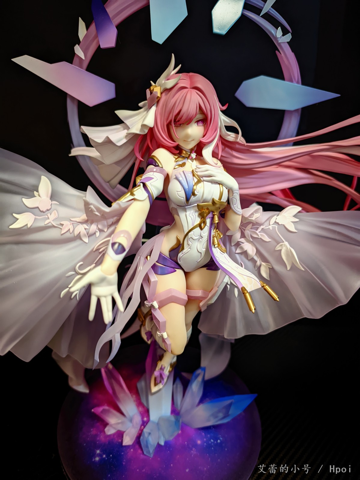 我觉得还挺还原的,没打光怼脸拍也好看,没什么死亡角度 // 和当今1200左右价位横向对比,大概算中上游水平;但纵向对比以前的女王雷律,进步挺大的 // 优点挺多的略过,说几个缺点: 人律身上标志性的紫水晶不够亮不够透; 游戏内裙摆是白粉紫的渐变+两飞行铃铛,可惜太复杂没法还原; 没努力抠细节,例如领口饰品简化为三角形,