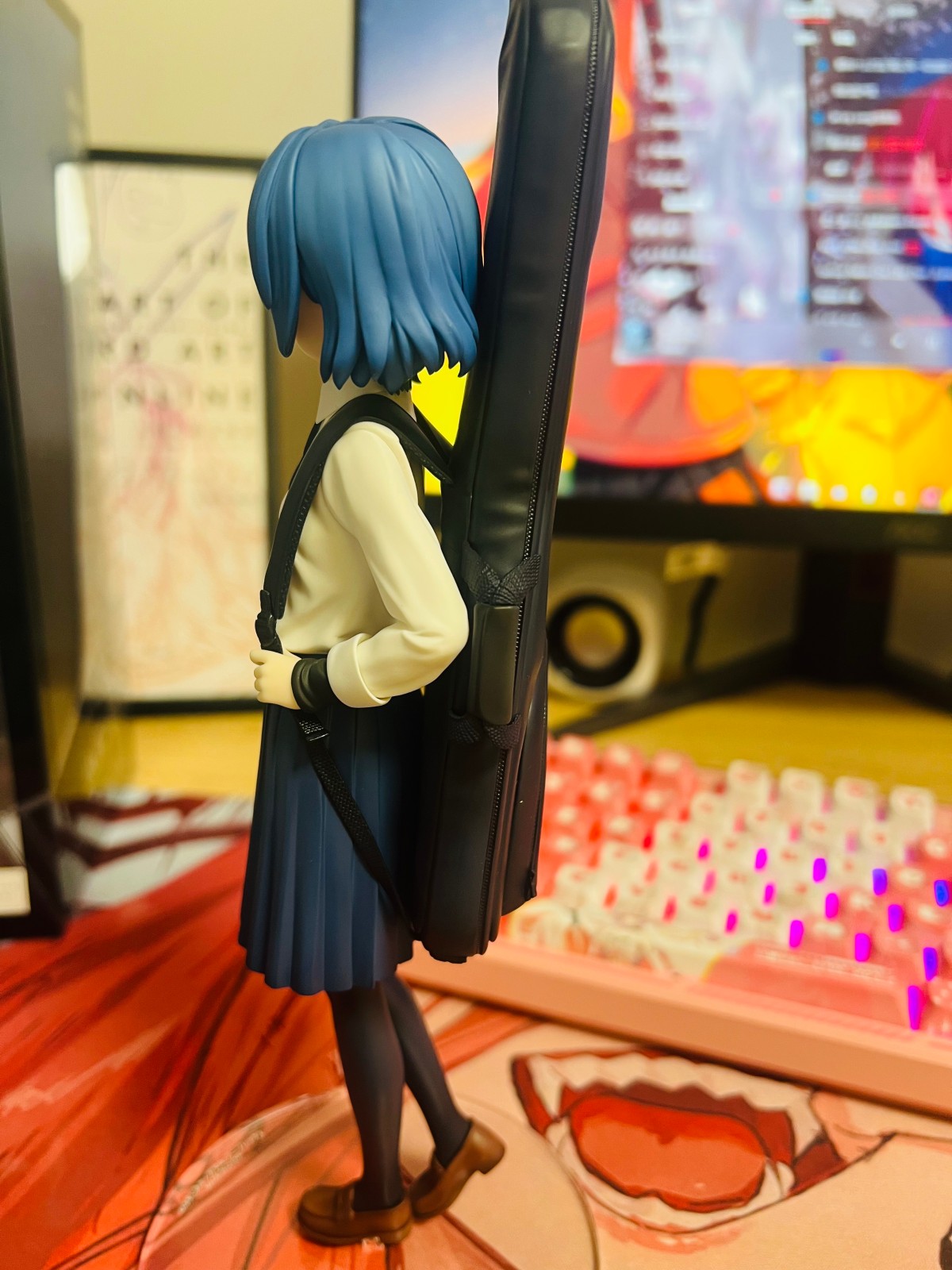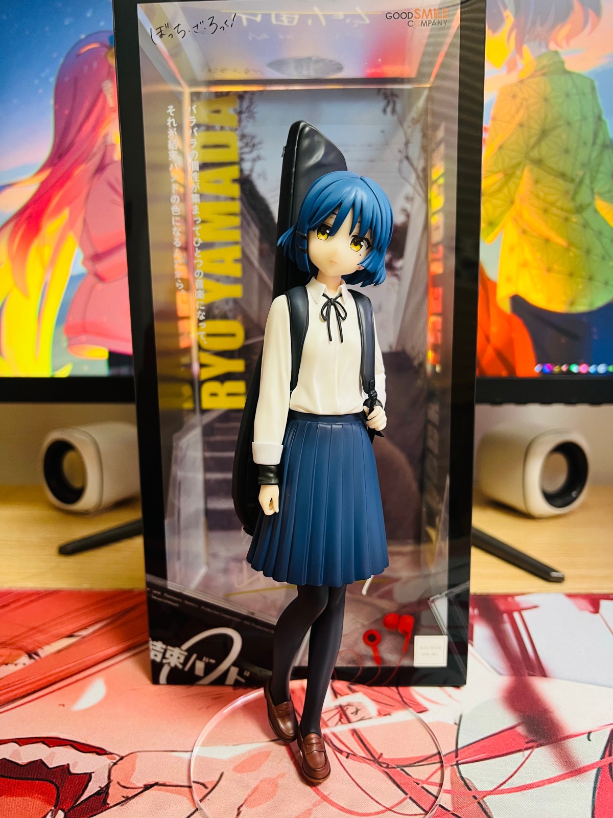 正面看其实就三个色 蓝白黑单调了些 造型简单 短发加上制服更简单 装饰物少 反而让观感上会有这角色力气没多大的心理 从后面一看却背了好笨重的贝斯包 如果不是盒子可以充当展示盒 跟波奇的差距还是挺大的 姿势应该要做得稍微酷一点才更符合凉的人设