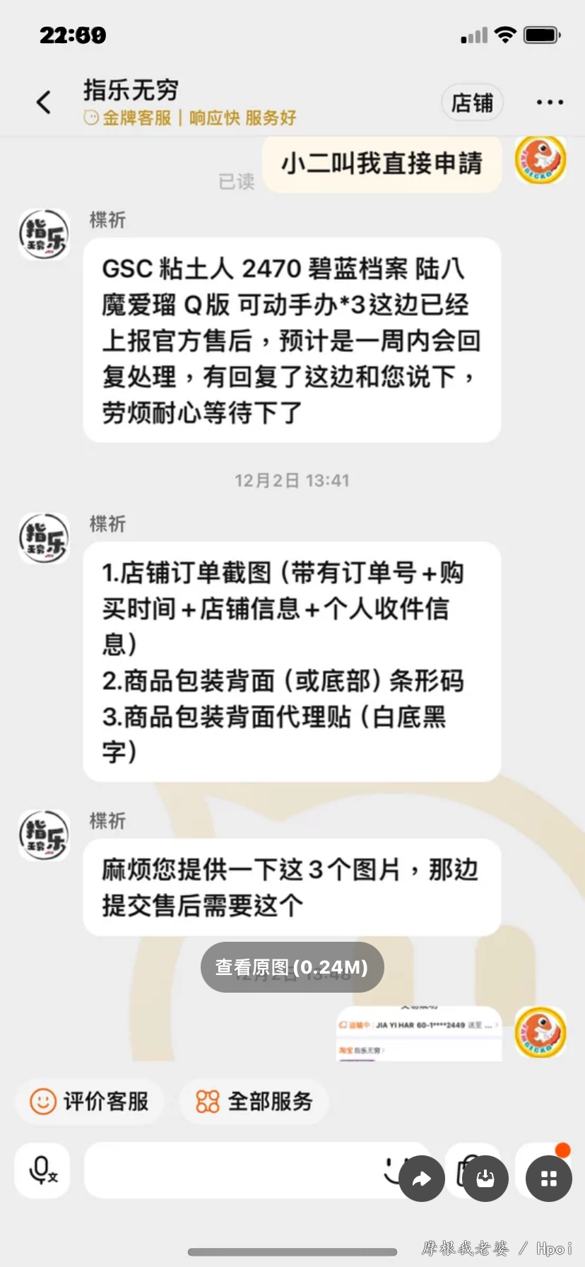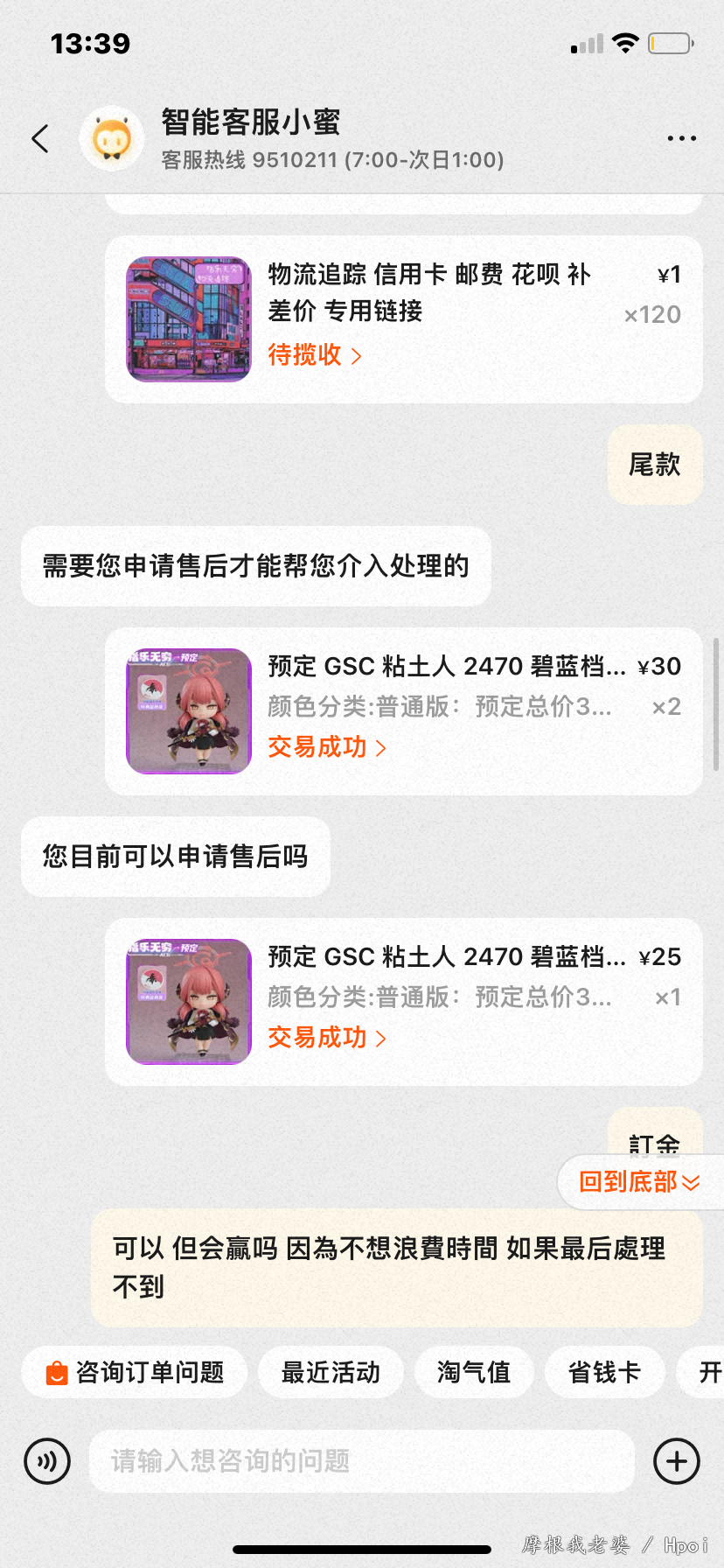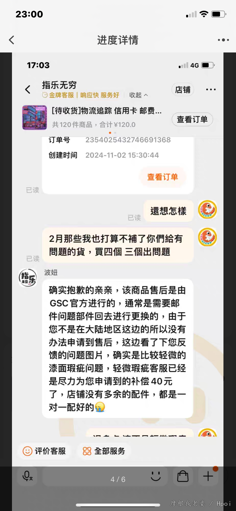 (前面几张是Fgo粘土人收藏,因为有个指X无穷水军以为我是第一次买粘土人一直护主,更新:隔天晚上发现他刪除留言了)预订了三个阿露,收到時三个披风都蹭色,找指X售后已读不回 因为卖家不回复,x宝叫我申请退款我就申请了,我也有在退款页面声明我只要三个披风补件售后而已因为指x已读不回我才申请退款,不会贪商品全款 指X一开始答应会找售后(还要了些资料)一直要求我取消退款 过一天就说因为我是海外的所以不会給我任何售后,只会给40元补偿 给我的結果是要我退货退款,我之前那些订金和运費他们都不会负责 打了热线也一样 现在最后就傻傻拿了40元补偿和三个有瑕疵的阿露粘土人 另外我是马来西亚的