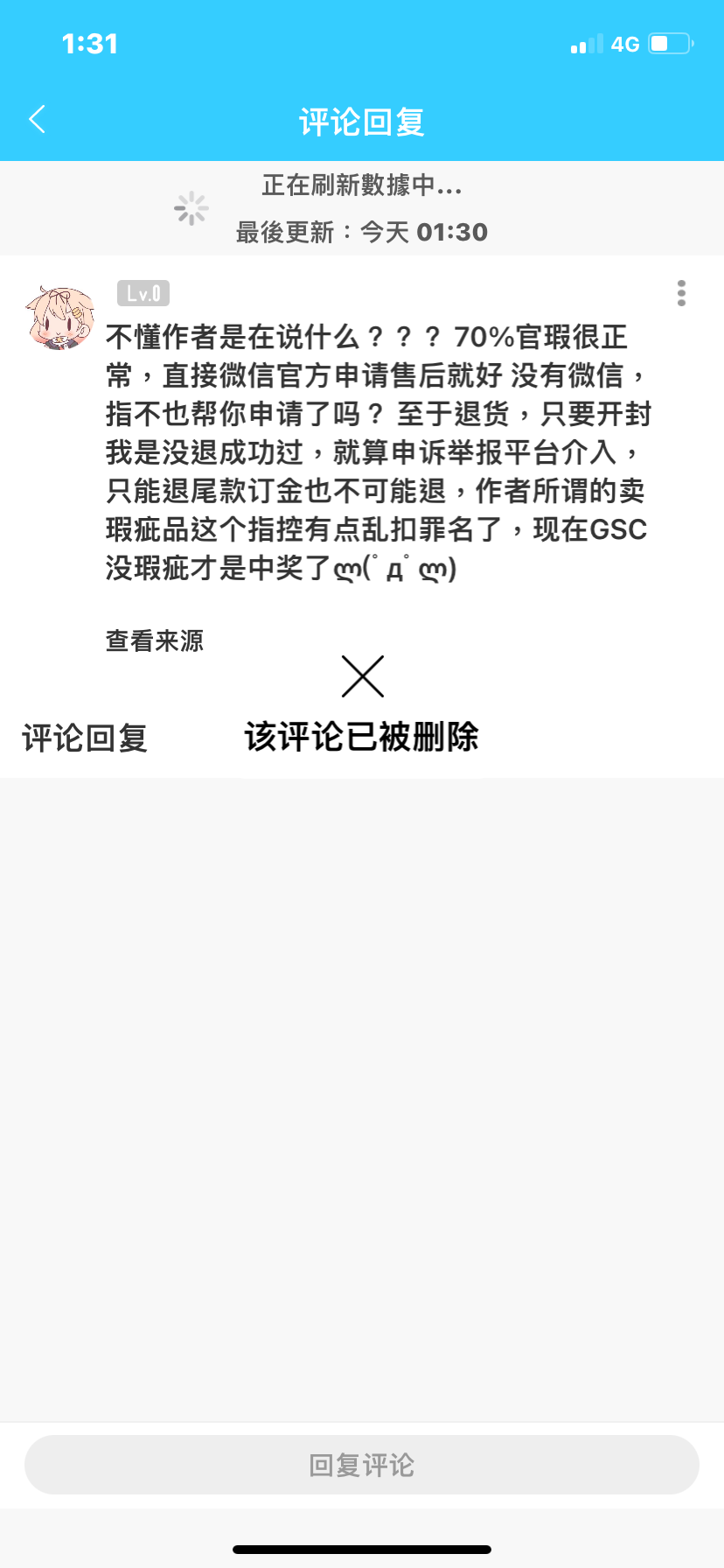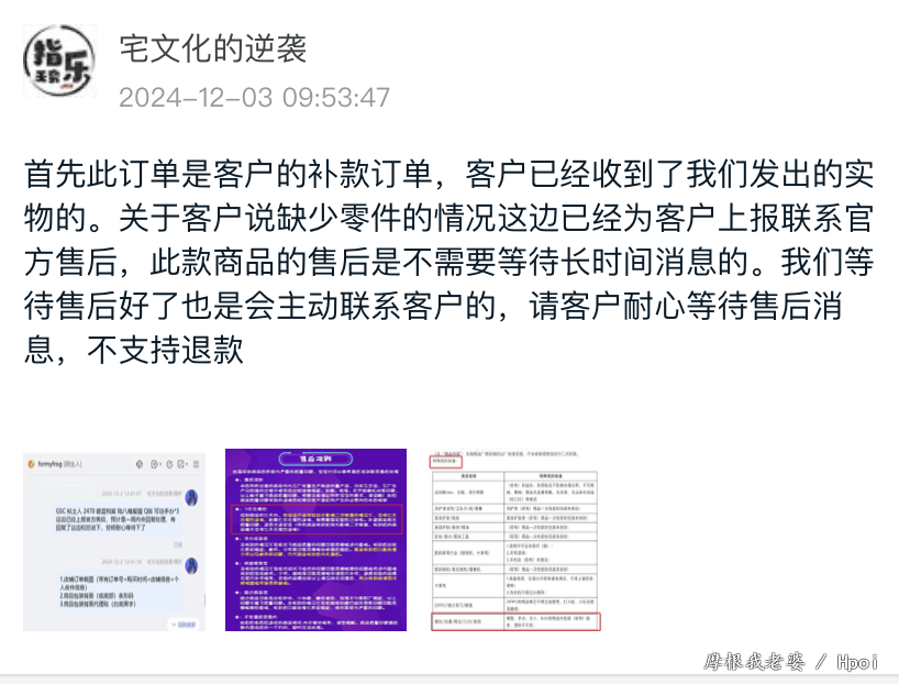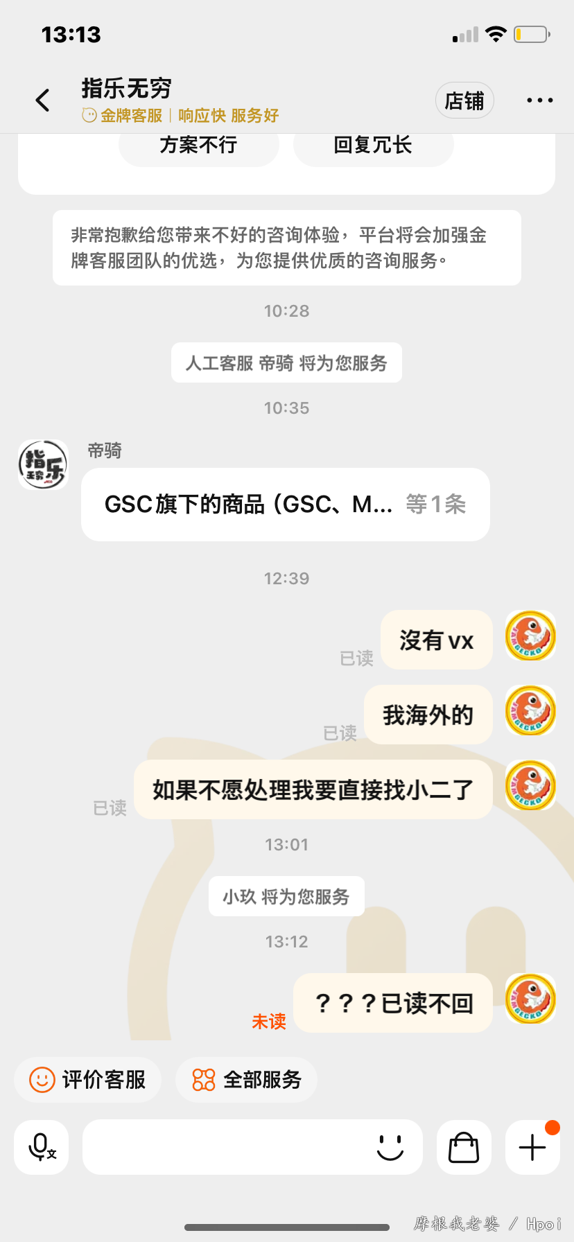 (前面几张是Fgo粘土人收藏,因为有个指X无穷水军以为我是第一次买粘土人一直护主,更新:隔天晚上发现他刪除留言了)预订了三个阿露,收到時三个披风都蹭色,找指X售后已读不回 因为卖家不回复,x宝叫我申请退款我就申请了,我也有在退款页面声明我只要三个披风补件售后而已因为指x已读不回我才申请退款,不会贪商品全款 指X一开始答应会找售后(还要了些资料)一直要求我取消退款 过一天就说因为我是海外的所以不会給我任何售后,只会给40元补偿 给我的結果是要我退货退款,我之前那些订金和运費他们都不会负责 打了热线也一样 现在最后就傻傻拿了40元补偿和三个有瑕疵的阿露粘土人 另外我是马来西亚的