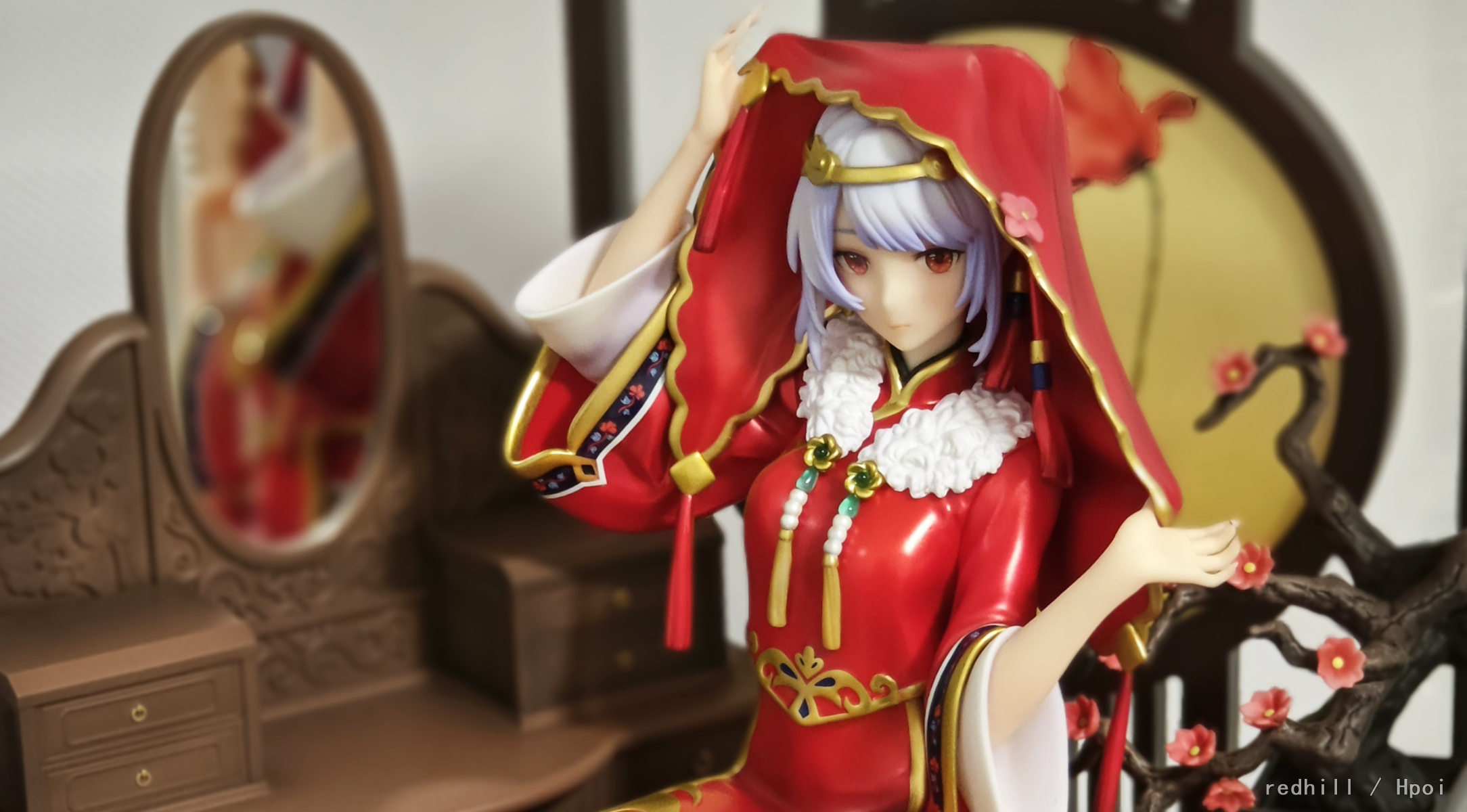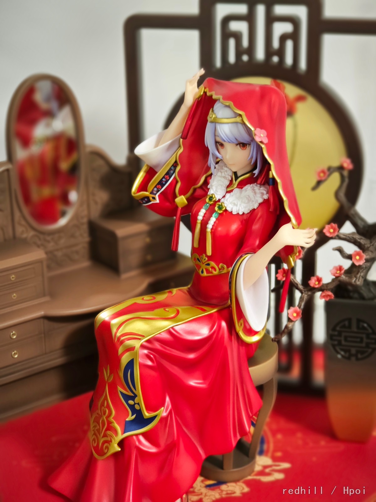 一直想入一款中式手办。找了好多,绝大部分就只是给原角色加了个旗袍,韶华和芒种在细节和场景上中式的味道还是挺足的,不过我实在是不喜欢这类旗袍款式(仅代表个人审美),还有少部分汉服手办感觉也只是套了一件汉服而已。各类古装游戏IP的也总感觉不够典型,找来找去还是不问天这套味儿最正,可能是这个中式婚嫁的主题比起那些玄幻一类的更有生活感。不过手里的预算只够其中一只的,纠结了很久之后选了33,感觉这个掀盖头的场景更有仪式感,所以更加典型,还有就是22的头发太长了,又因为颜色和质感问题,在整个场景里有点不太协调,33的短发就没这个问题,其实22的脸我是认为更成熟比33更合适一些。