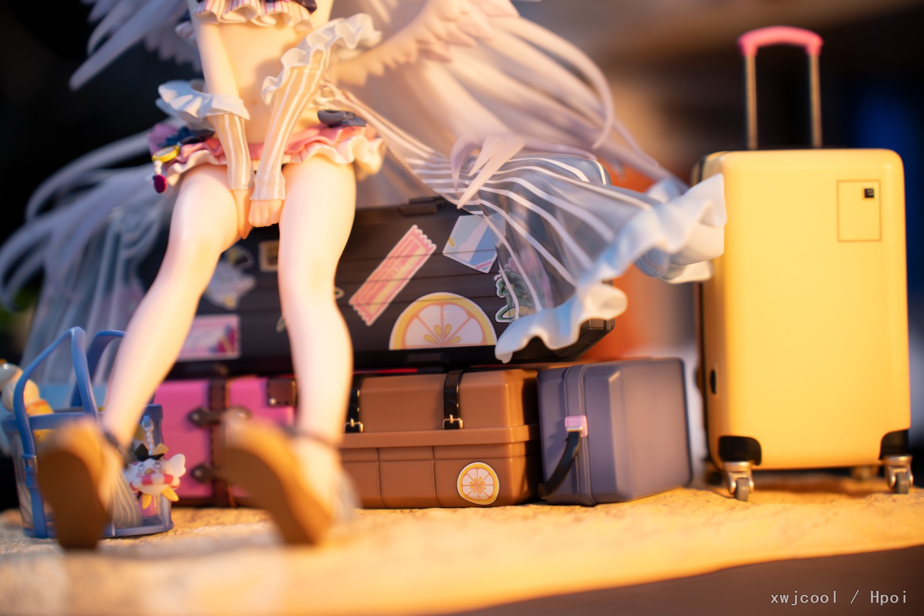 再说优点:无论是默认脸还是替换脸的面雕都很细致,装饰件虽多也没出现明显的瑕疵。翅膀和光环在强烈的背光下会透亮,十分美丽。配件里的提包和行李箱是独立零件,做工不输本体,很有把玩价值。