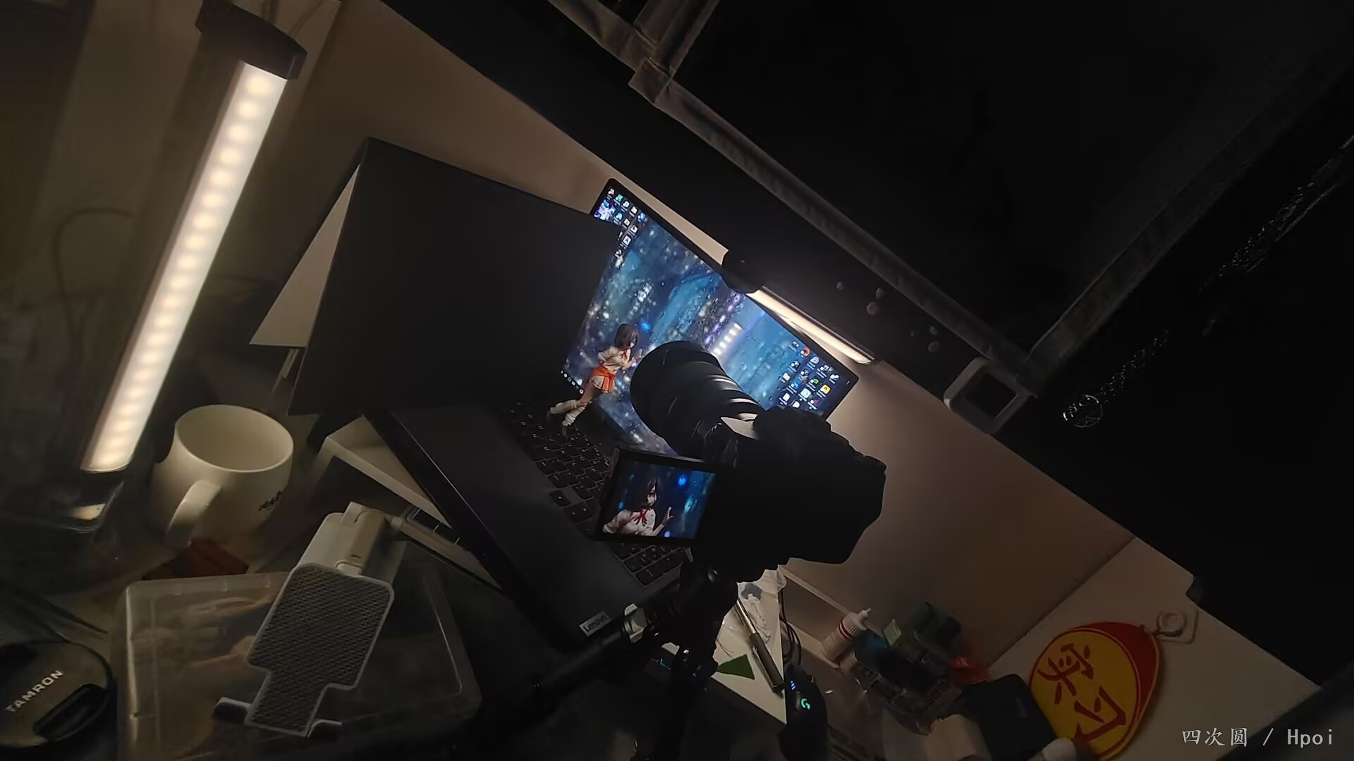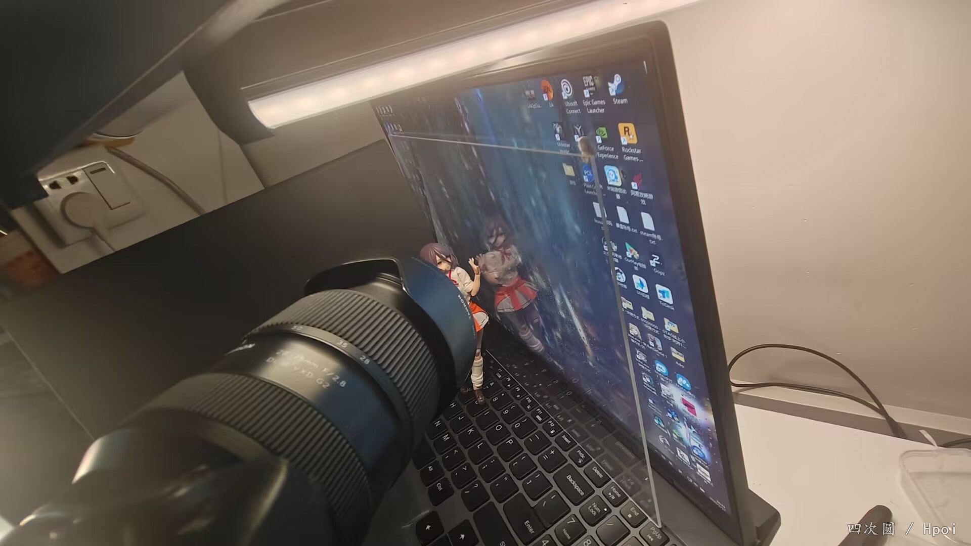 上面做顶光功率7%打面,左边侧光5%稍微往外侧点打轮廓让机娘的背部侧面不至于死黑。原图其实很亮的但是我感觉稍微降低曝光度会更有氛围感。倒影实拍需要找角度,我图方便就自己p了个