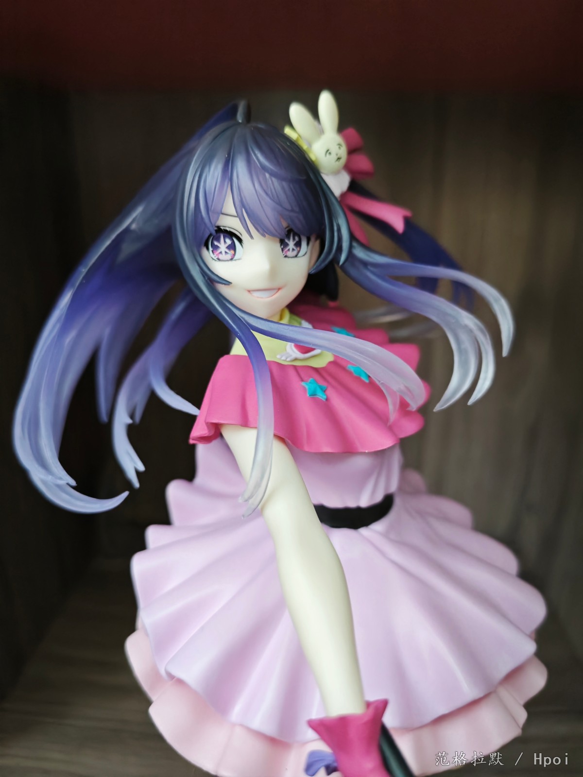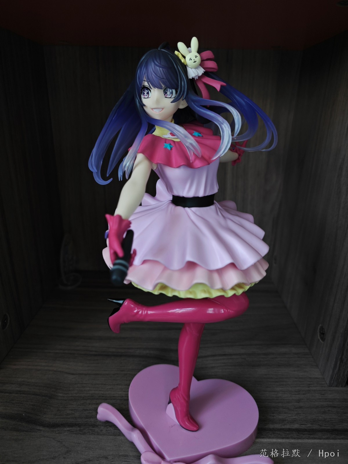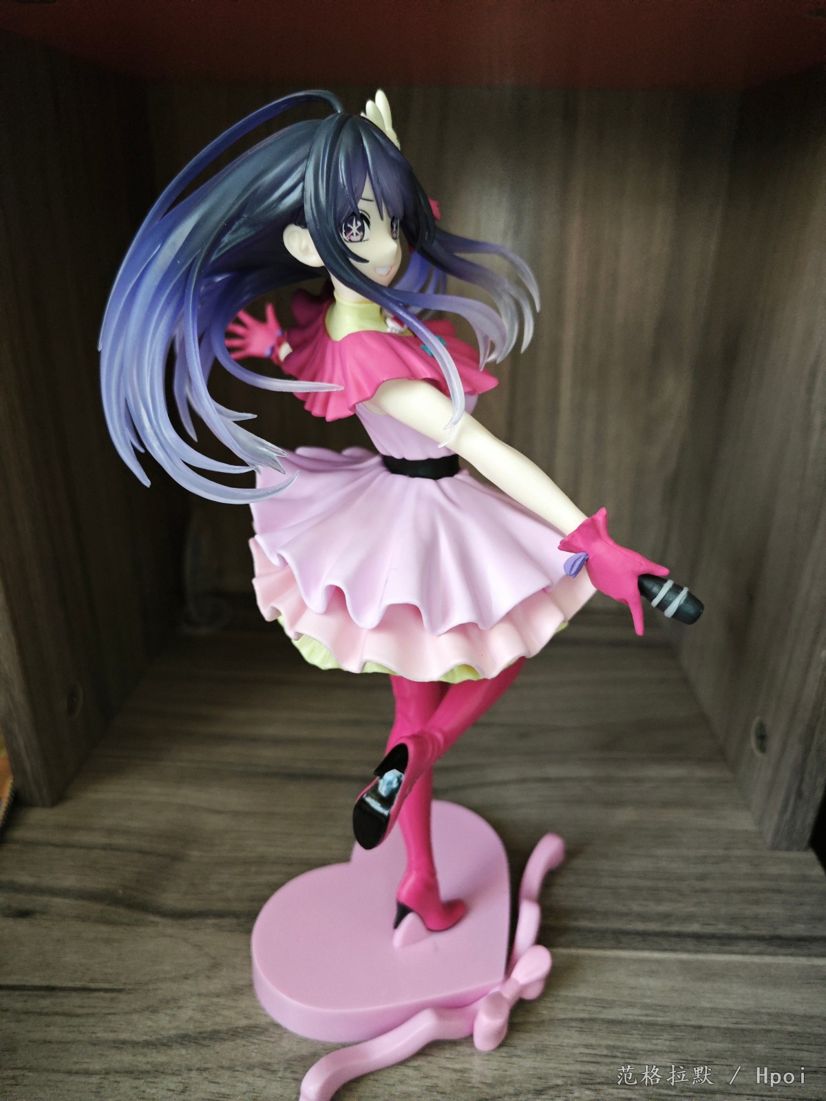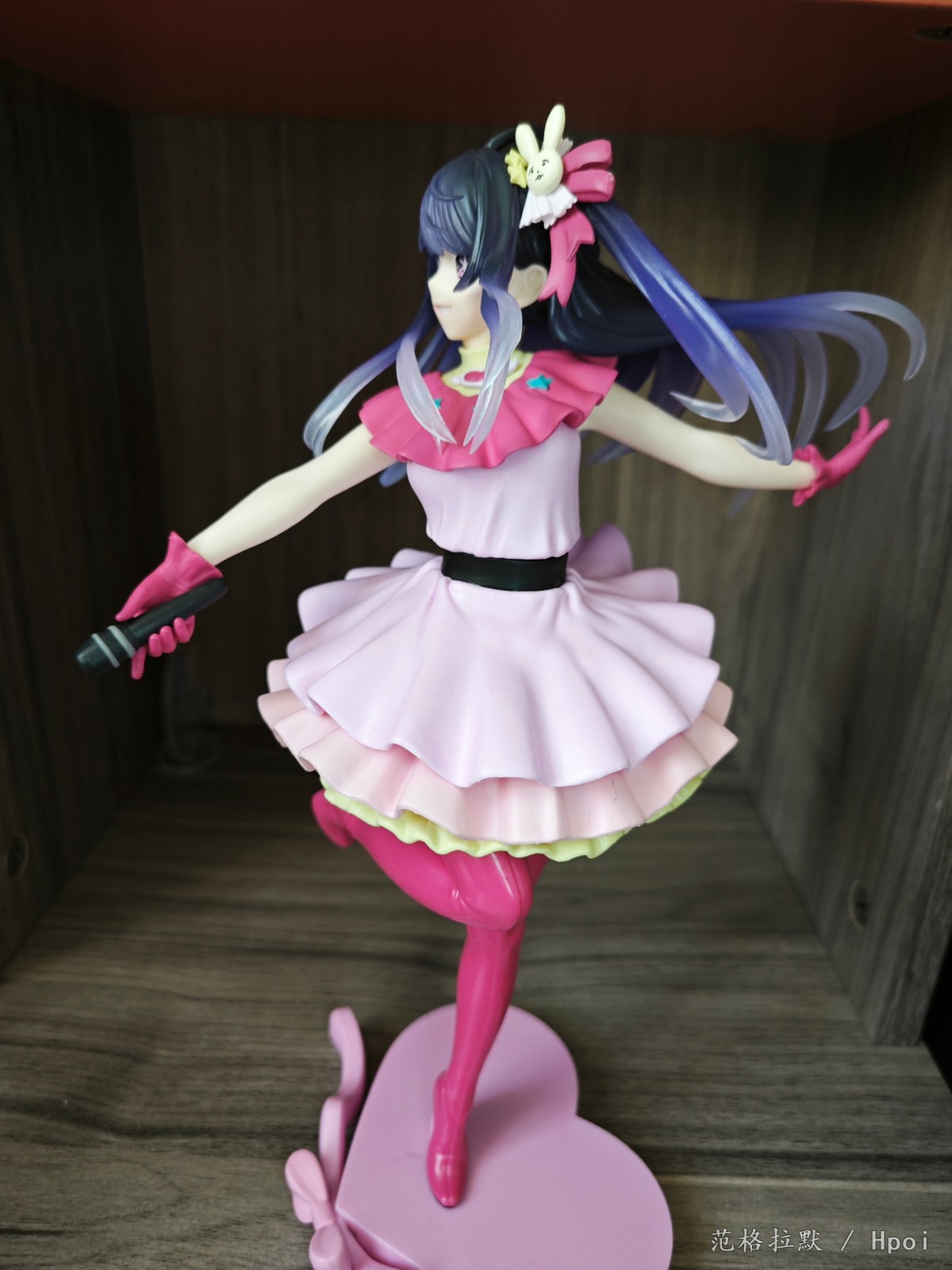 很大一只,有二十六七厘米,分为头,上半身,下半身和底座的组立式,得益于大比例做工,细节方面也很好。衣服的褶皱,裙摆的设计,头发的飘动。靴子两面漆的处理。以及飘逸渐变色的头发的涂装,面部眼睛的水贴也很正,整体做的都很到位。但最大也是美中不足的,缺点就是脸不太像。