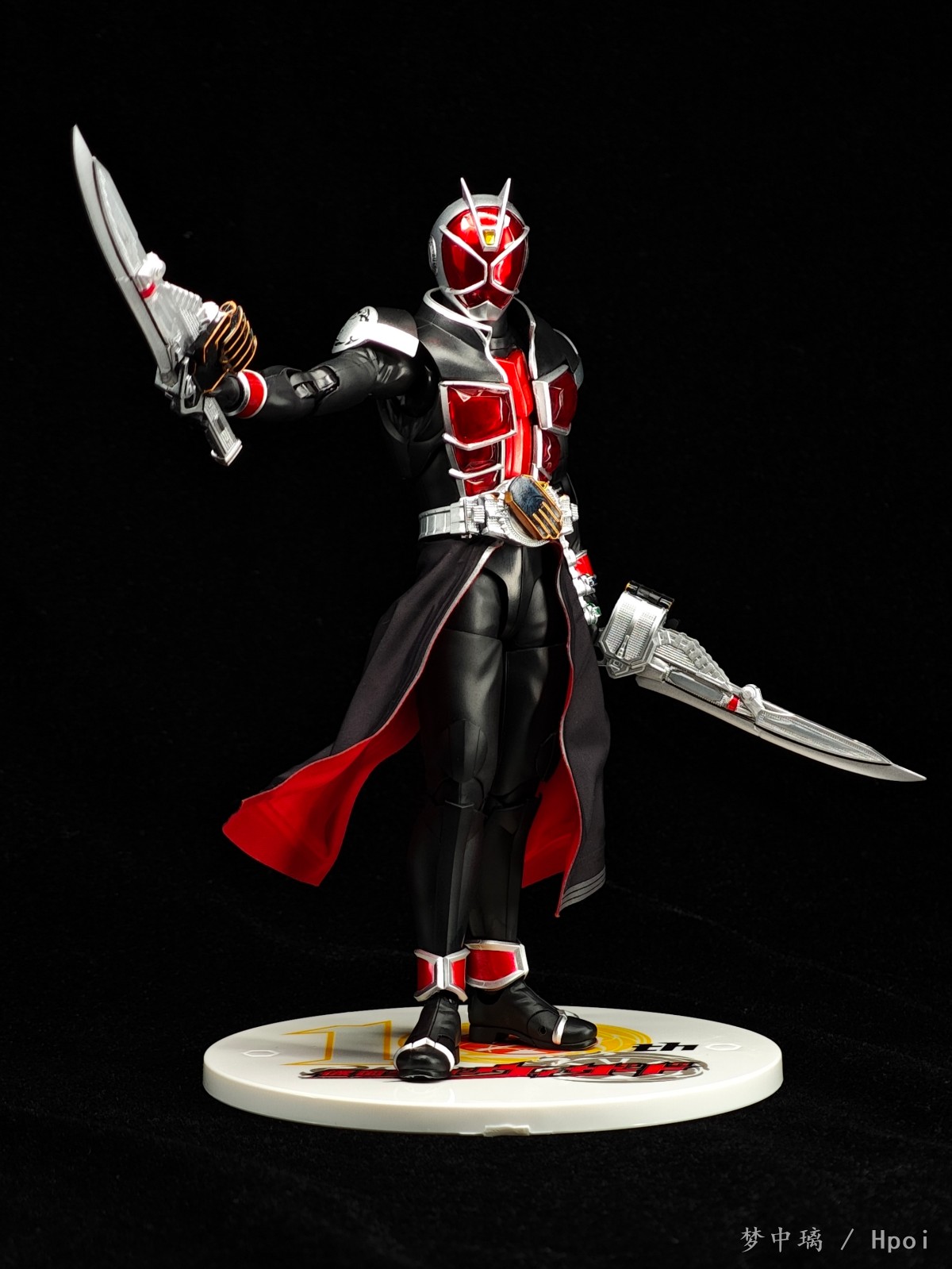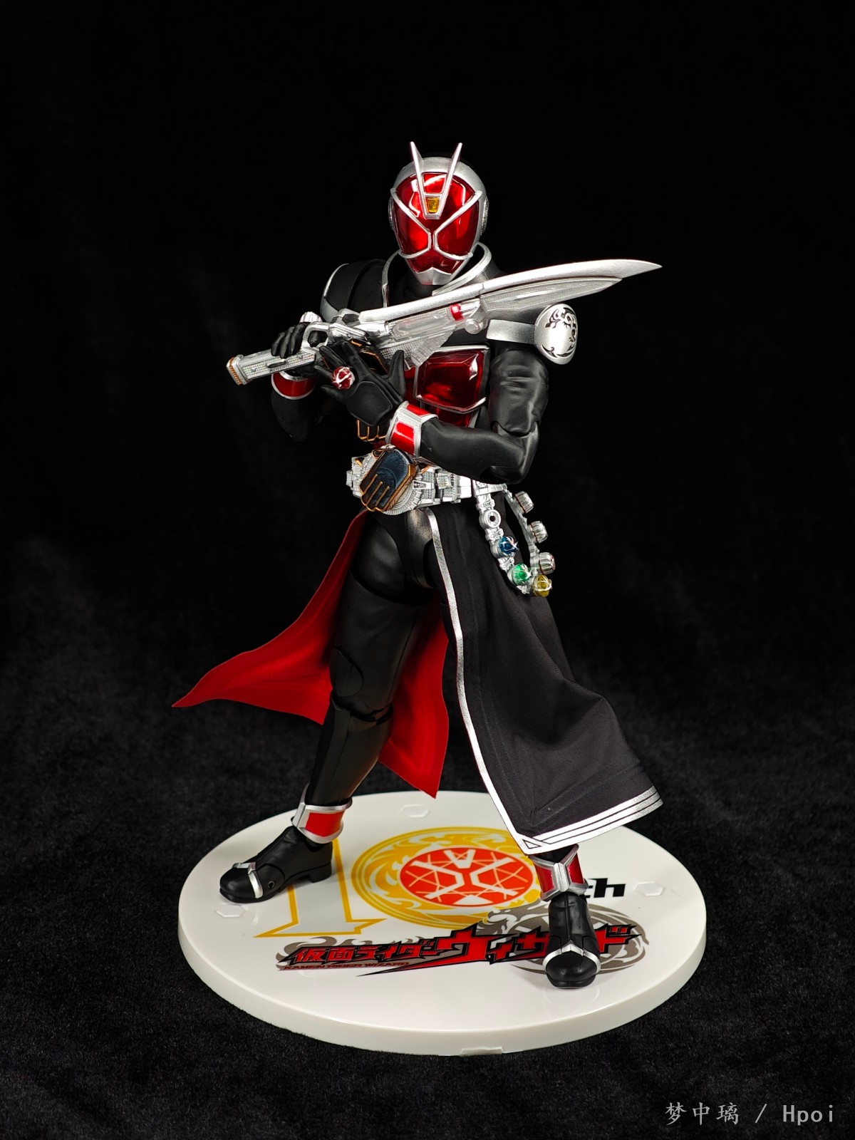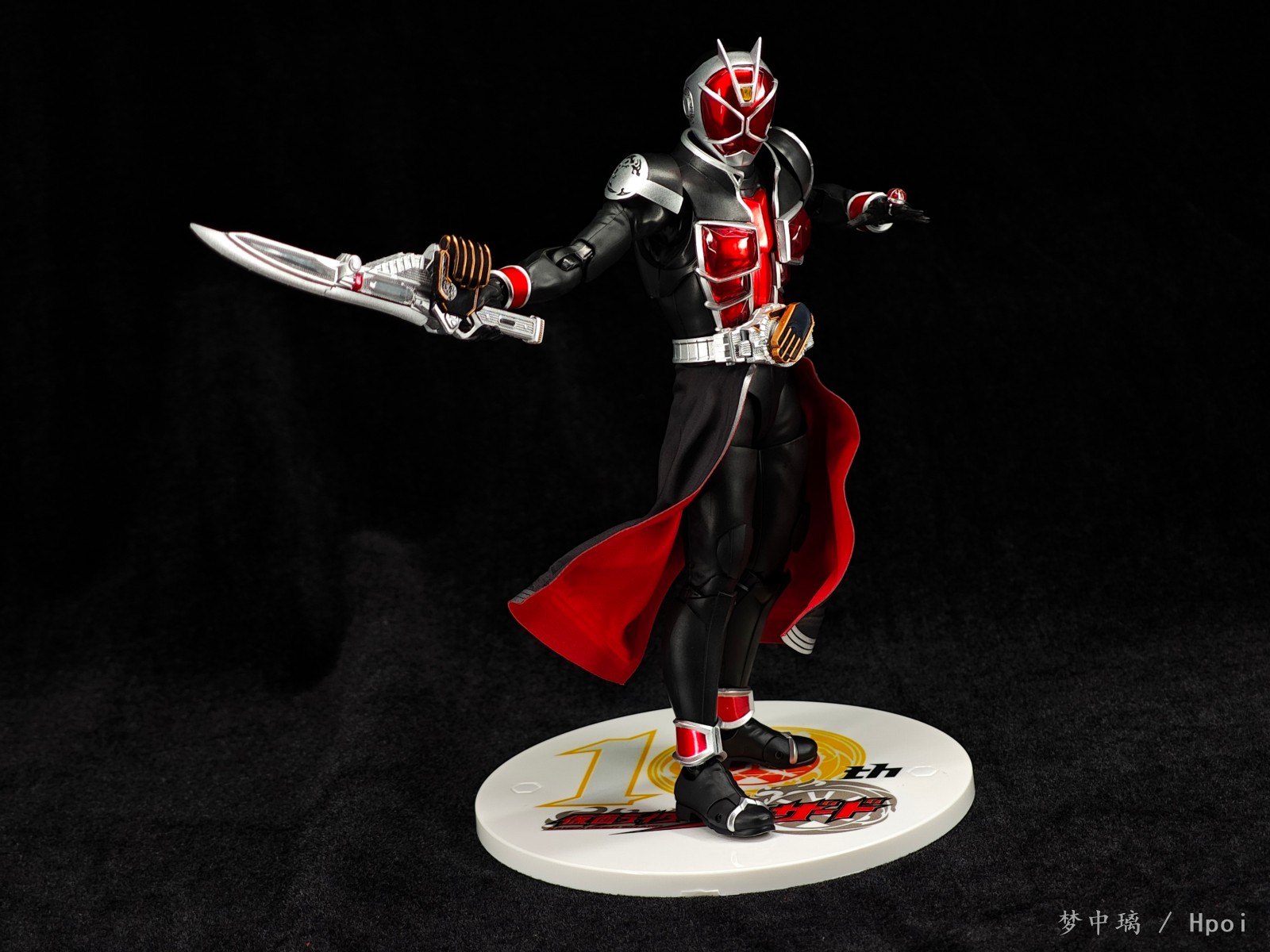 这只法爷素质优秀,各处细节做得相当细致,特别是腰带、戒指和武器,非常精致。布制裙摆可塑性很强,可动也不错,掰得非常过瘾。可惜武器没有给双份,我的第二把是从真骨雕全龙里拿的。相较于初版还多了一个10周年logo地台。