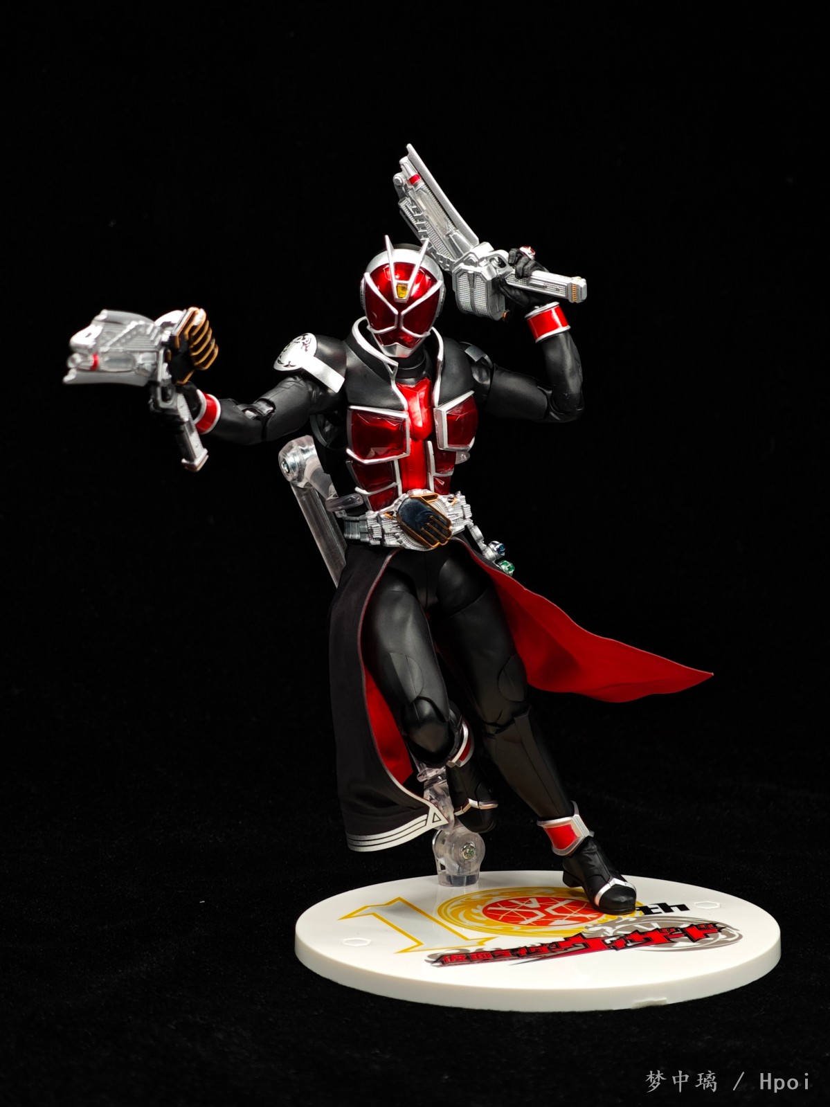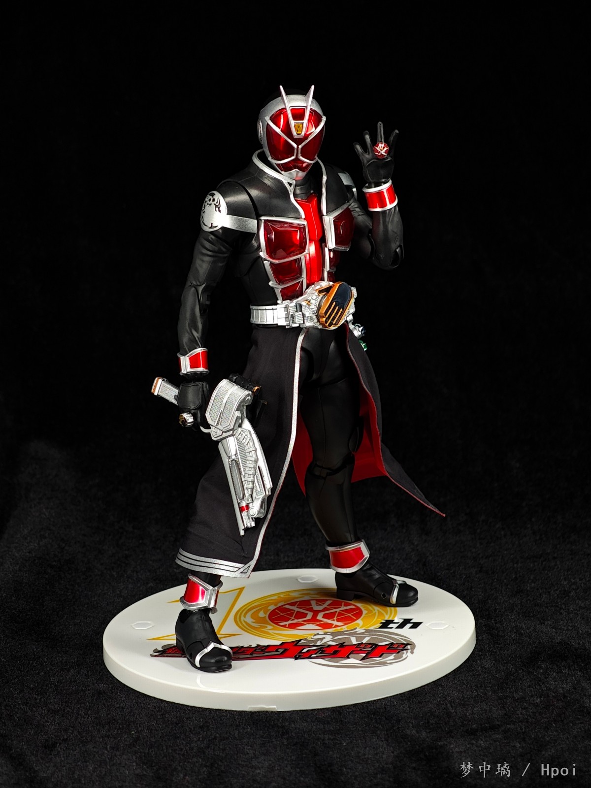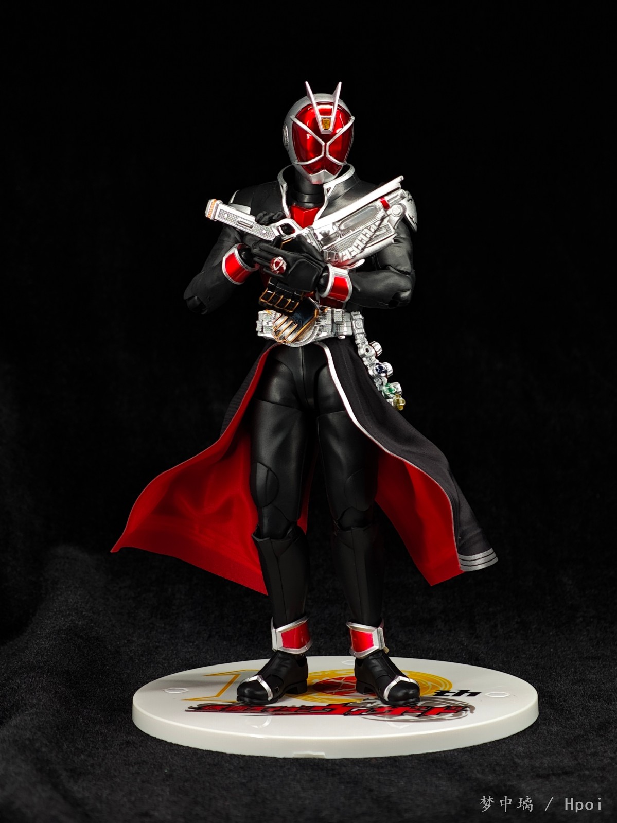 这只法爷素质优秀,各处细节做得相当细致,特别是腰带、戒指和武器,非常精致。布制裙摆可塑性很强,可动也不错,掰得非常过瘾。可惜武器没有给双份,我的第二把是从真骨雕全龙里拿的。相较于初版还多了一个10周年logo地台。