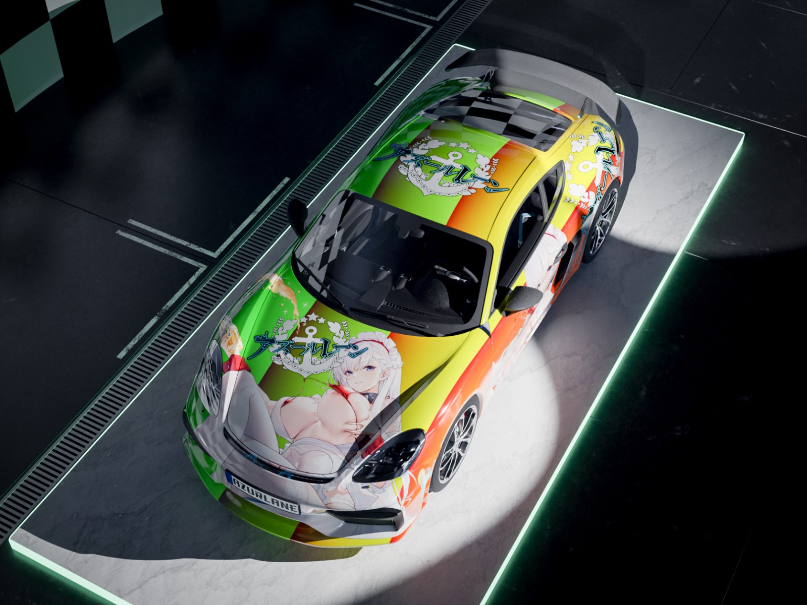 - 场景是改自模型市场一个地下车库,加高层高,做了个舰B logo背景板和一个发光地台