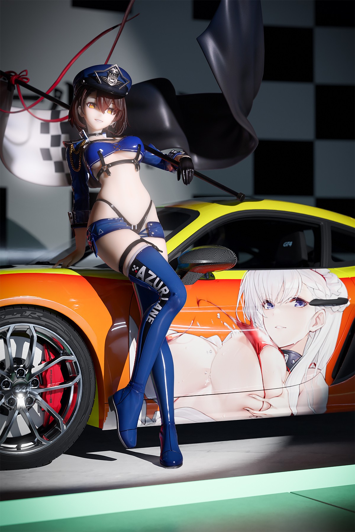 离APEX巴尔的摩出荷已有一年半时间,当时就想着给配台车出片,不过1/7的车不好找,想过弄台RC模型KM1/7雪铁龙C3WRC,但RC模型外观精细度不太够,且WRC车型也不太配这款手办,所以不予采纳。随时间推移,APEX赛车女郎已积累到三款,辗转多时,仍无法找到合适的车,导致每天晚上都因此事无法入眠,又或是梦中总给老婆(们)跪搓衣板磕头道歉而惊醒,长此以往精神萎靡不振。事情转机出现在上月,因为彼时虚实结合拍摄喜多川海梦效果还算能接受,萌生给老婆(们)配台赛博保时捷出片的想法,吹牛逼到此为止,下面是最终效果图,用的是聚光灯