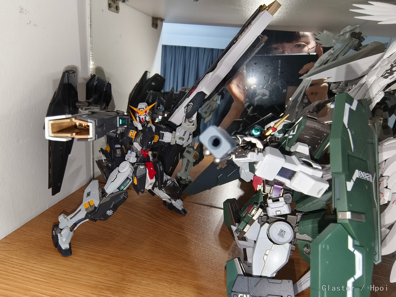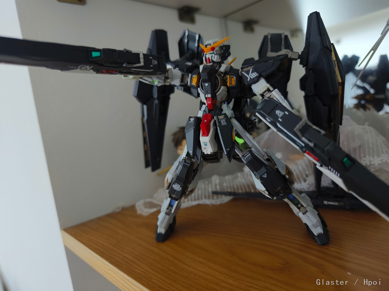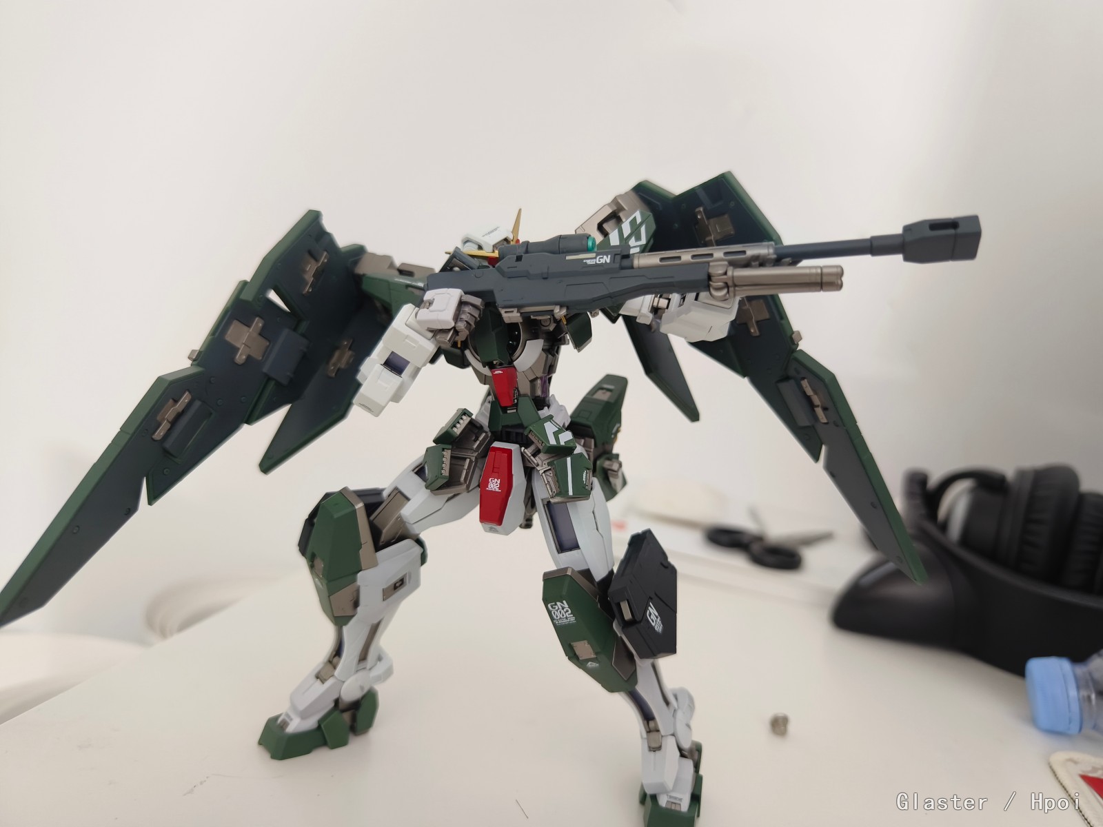 力天使MG原色绿得有点发慌,但是涂装重新喷的颜色就很舒服啦。有一个磁吸开关的灯组,太阳炉会发光,帅