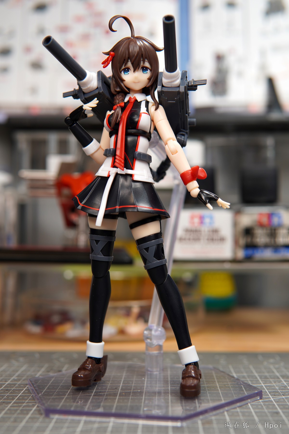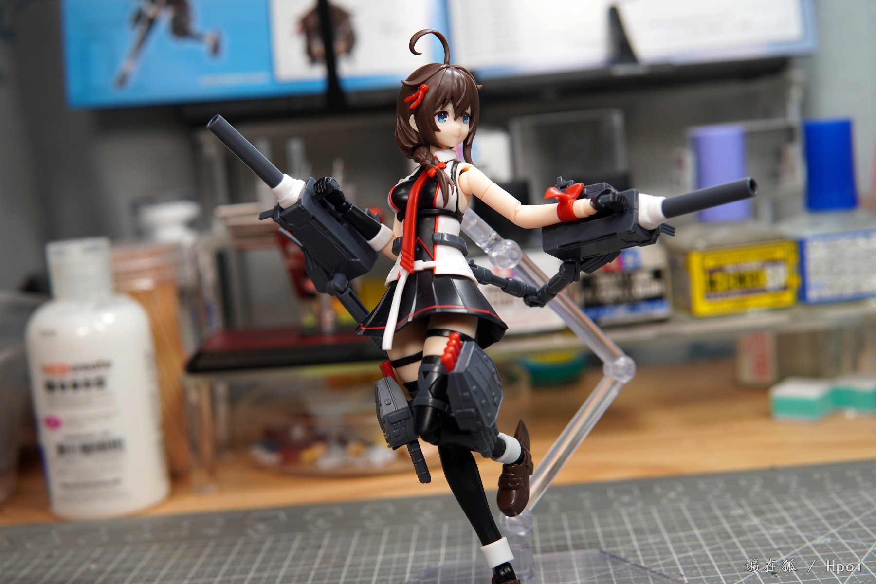 舾装也是很惨,背上的超大口径主炮仰角几乎没有,里面莫名其妙多了一块干涉导致炮管不能上抬很多。舰炮上面的25mm高射机枪组非常敷衍的做成了一坨垂直插在主炮上,也完全没还原立绘。机械臂可动性尚佳,鱼雷发射管是球形关节固定,可以前后微调防止干涉。