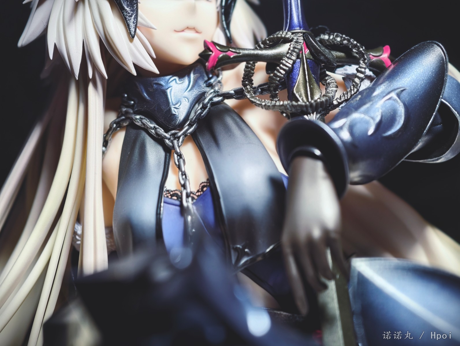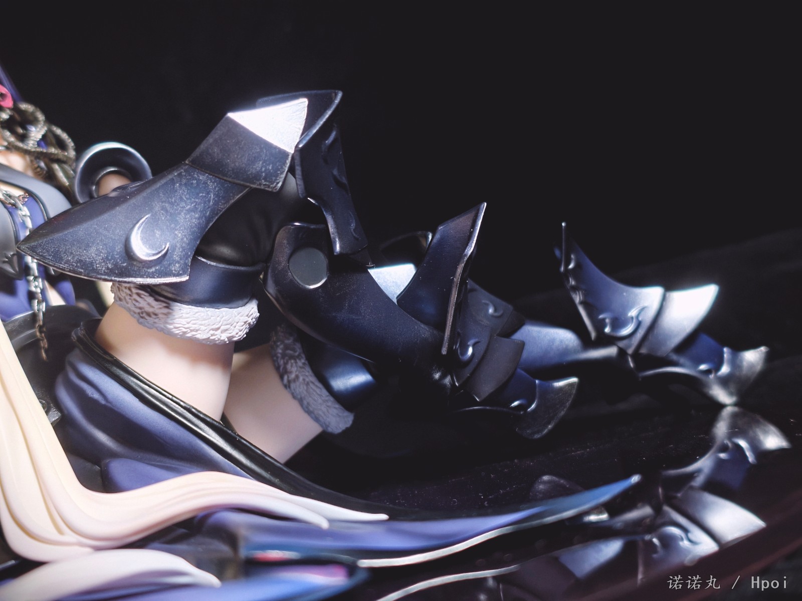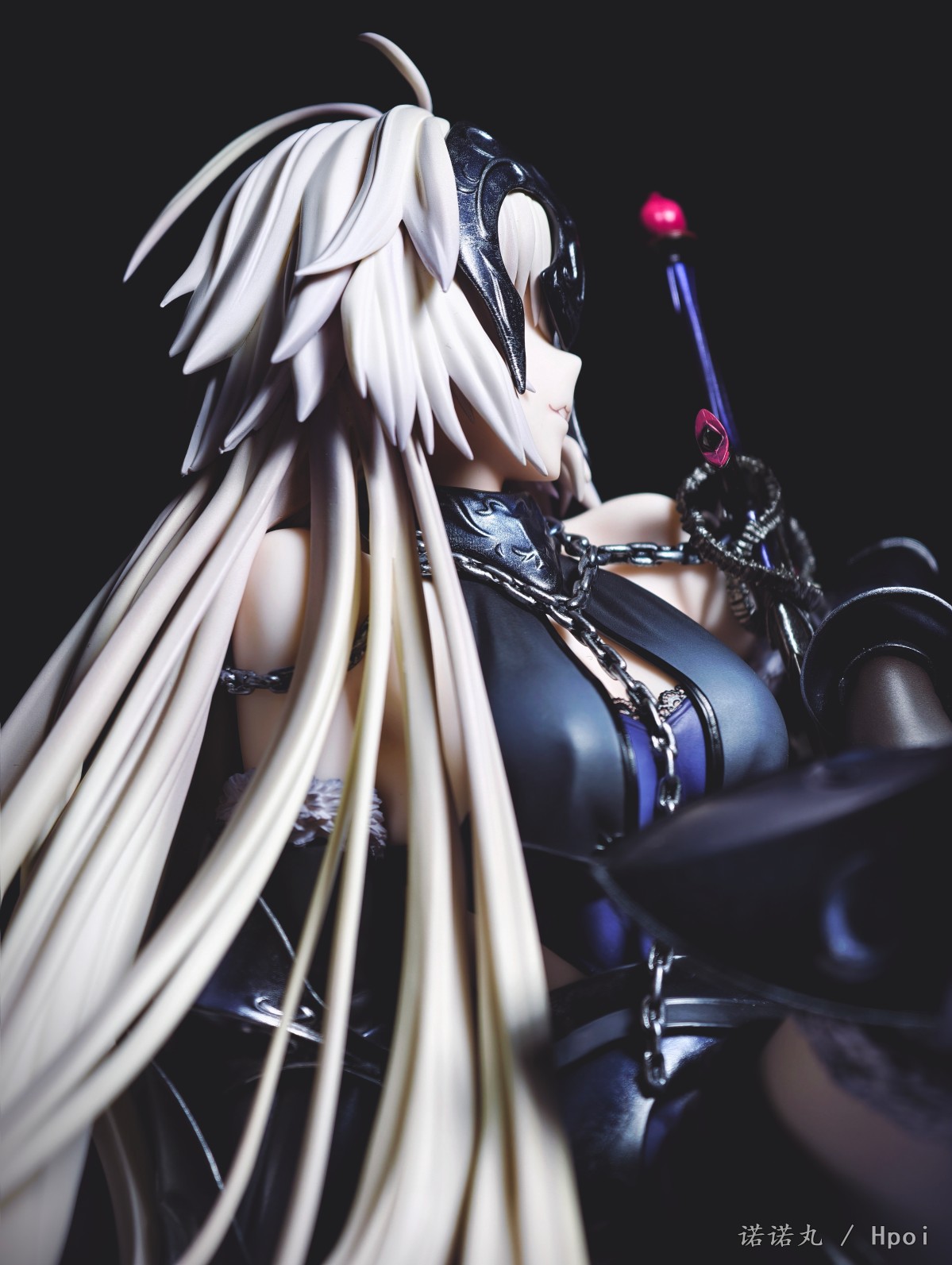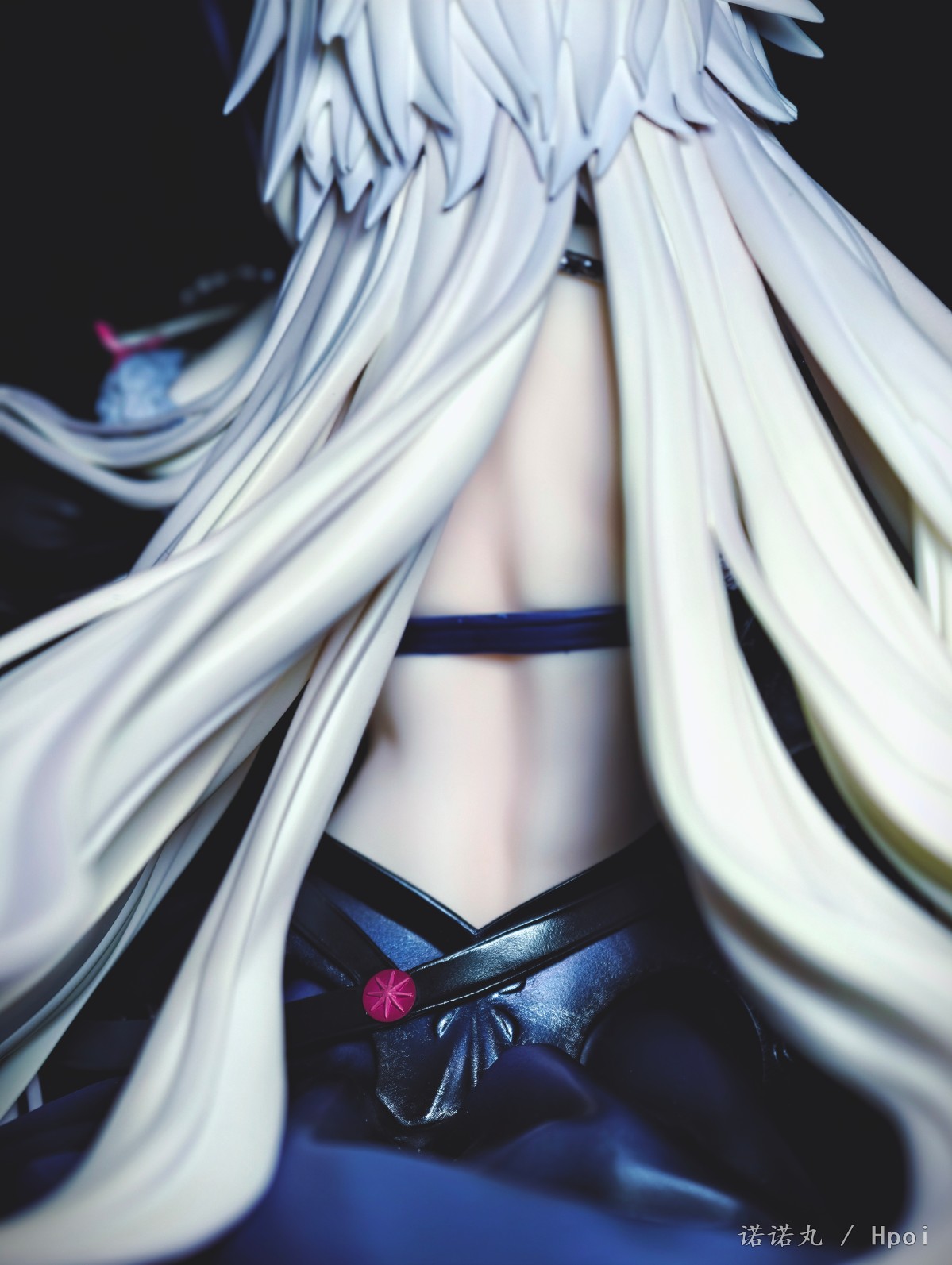 这次的坐姿黑贞作为三破状态,摊开在地上可以说确实是好大一盘。我也按照满破图的配色调了下色,黑贞三破状态下整体突出的邪魅风格被Alter拿捏的很好,礼服和装甲的涂装相得益彰,整体也透出一种淡淡的慵懒感,长嘴角一开始看有些奇怪,但最后还是看顺眼了,并且在看侧脸的时候有奇妙加成。而三破最为性感的地方其实是裸背,Alter做出了非常漂亮的后背,但因为设计,整个黑贞的背部和上次的大凤一样被挡了个严严实实,欣赏且不说,拍照几乎是难于登天,不过这一次在背后一束头发给了一个较大的活动范围,让人可以通过掀窗帘一样掰开来欣赏一下,不过最好还是不要经常这么做。