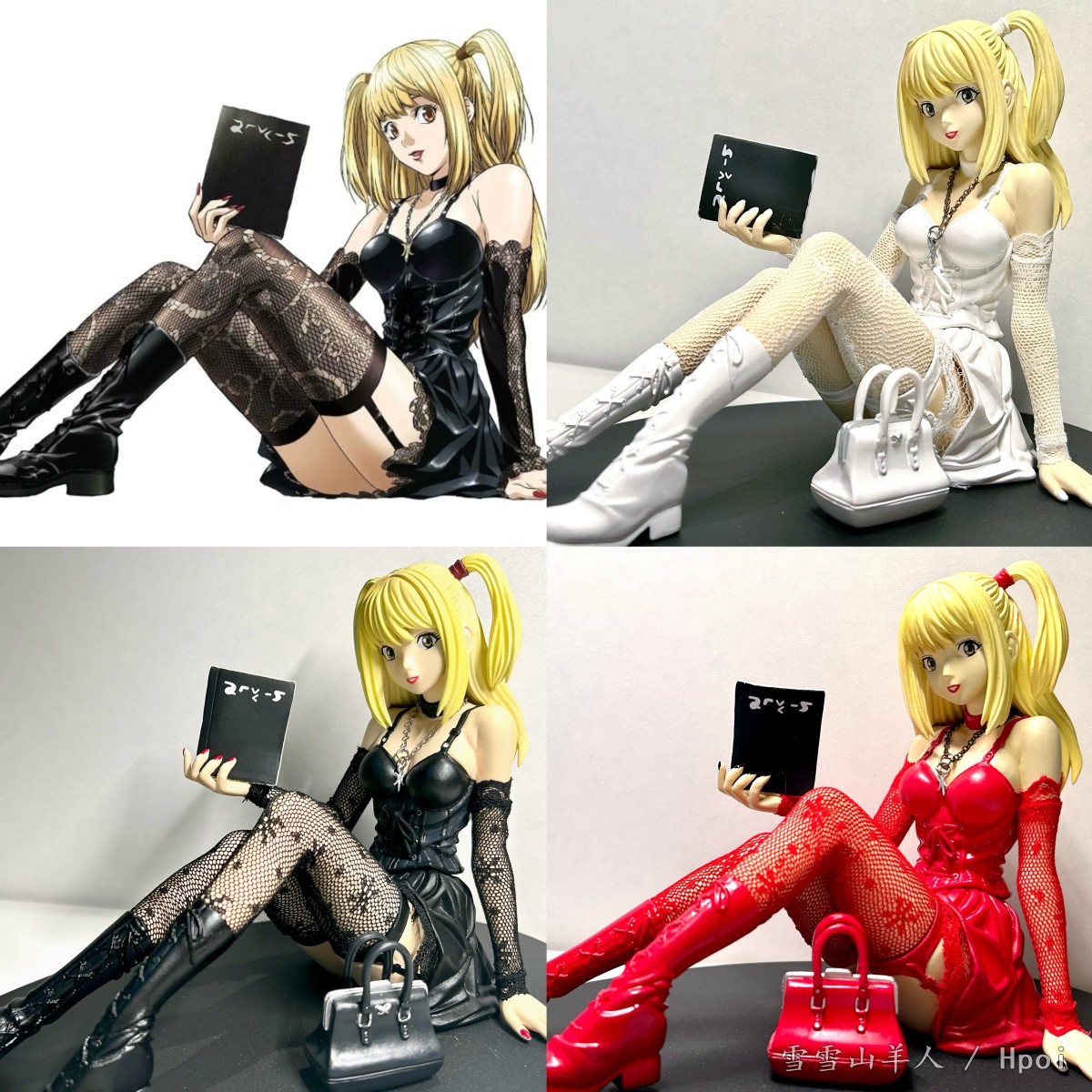 黑裙弥海砂: 特别漂亮的一款弥海砂,面雕可以说是非常还原原著中的misa了,完全不是那种大众脸,主体是pvc,丝袜和手袖采用了真实的蕾丝,很有质感。配件包含一本死亡笔记和一个手提包,可以自由搭配放在misa的手上。这一款比较有意思的是 弥海砂的裙子是可以自由拆卸的,裙子内部的吊带袜和一些其他方面也做得很好,在看不到的地方也完全不马虎,裙子内部也做了蕾丝封边,很细节了。原型为动画OST第三卷的配图,这款的还原度令人惊讶,基本上是一比一还原 白裙弥海砂: 如果说黑砂是经典,那么白砂就多增添了一份纯洁神圣的风味。白砂的大部分详情都与黑砂相同,但是像发绳,指甲油,还有配件手提包都发生了颜色上的细微变化,主体的一袭白裙更是美到说不出话来。 红裙弥海砂: 这个颜色非常好看鲜艳,和白砂黑砂是不一样的风味,皮包和头绳都做了颜色对应的处理,黑砂的指甲油对应的是红色,红砂的指甲油对应的是黑色,是一个很巧妙的照应!还没收到红砂之前觉得太鲜艳的颜色有点怪怪的,收到之后才发现是真的特别漂亮,红色衬得弥海砂的肤色更透亮了,是跳脱出角色框架非常特别的一款