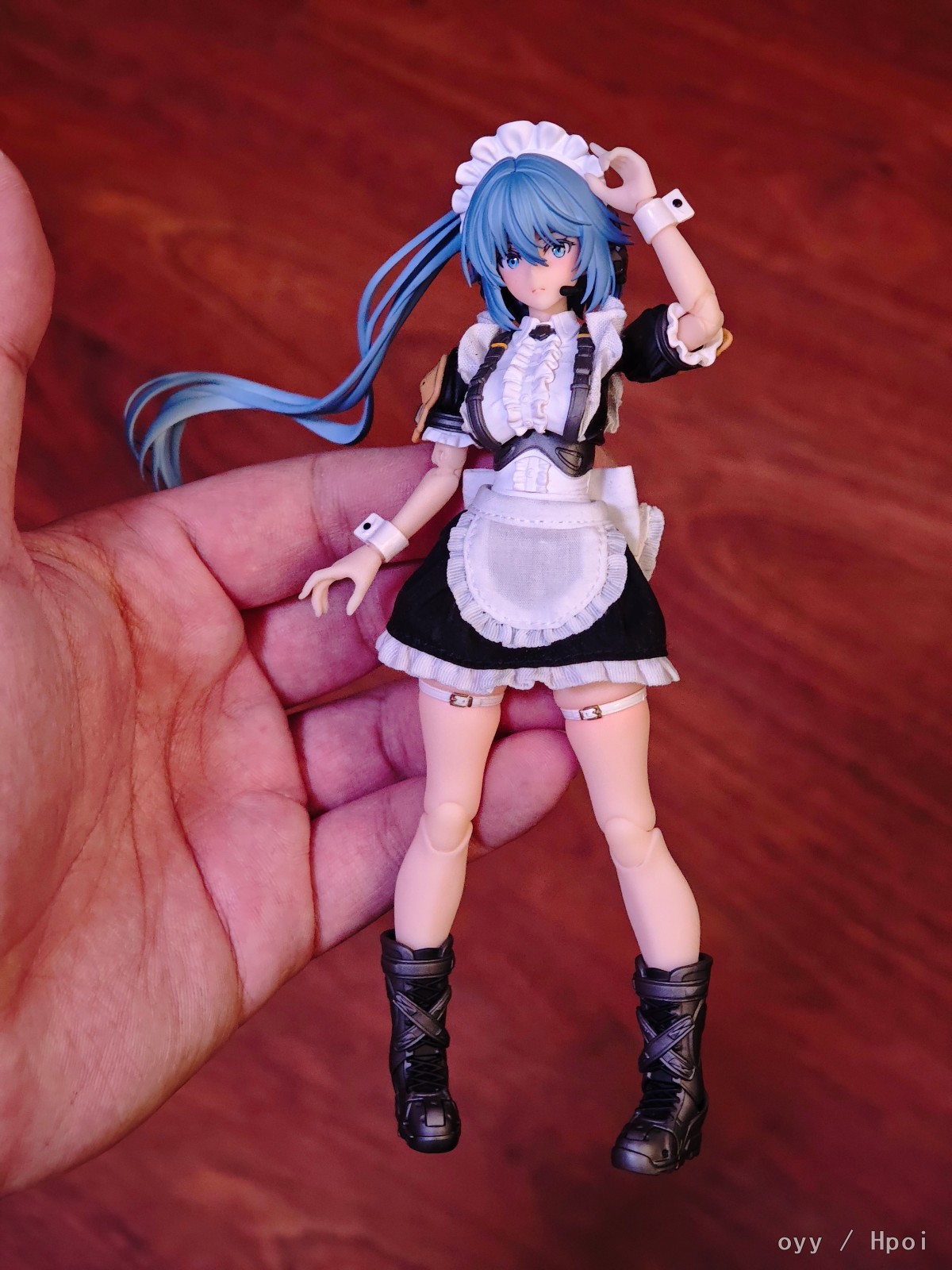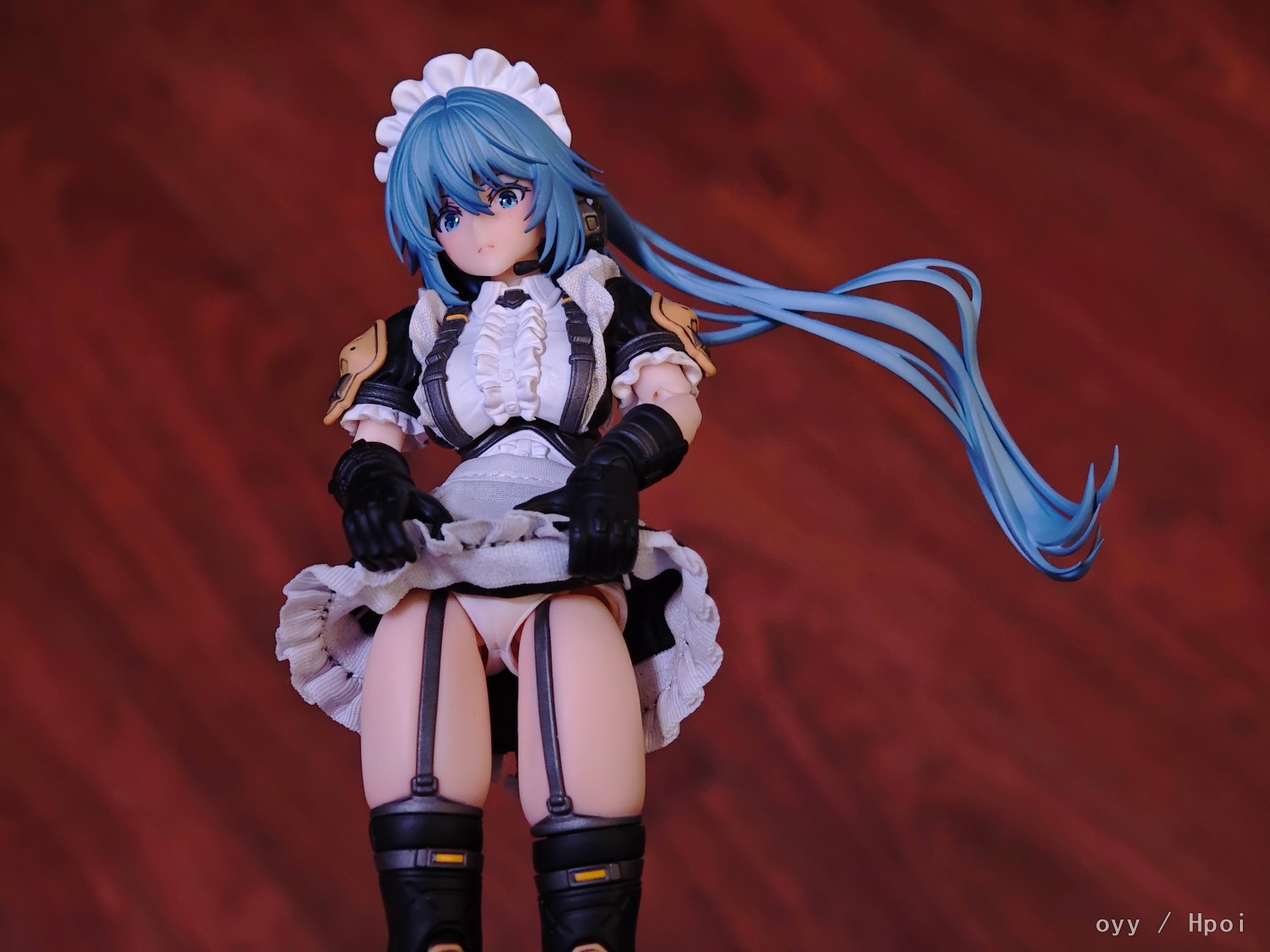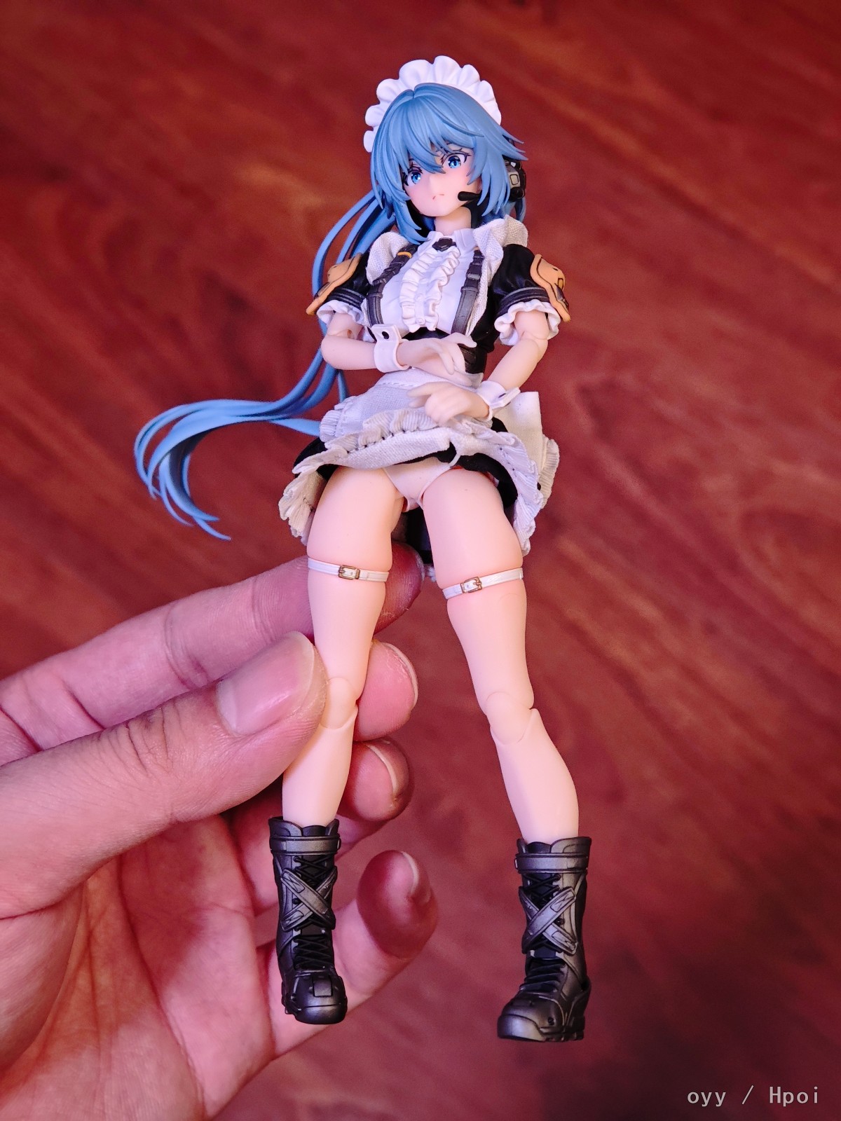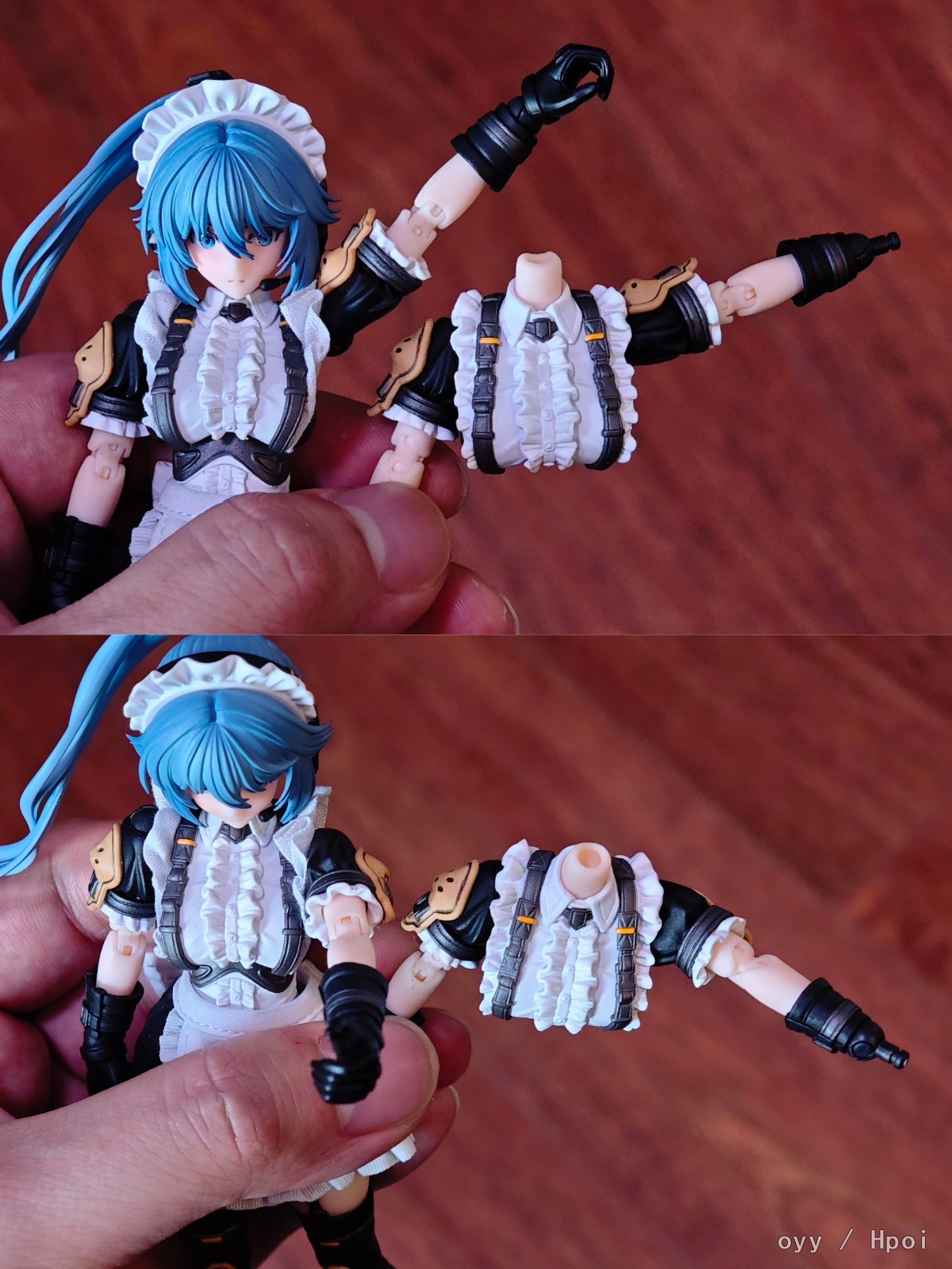 最后就是最妨碍可动的女仆服裙边了,我这里是直接做了切除自己粘布的,这个比较看个人手艺就没啥好说的了,最后是可动显示,差别可以自行对比。