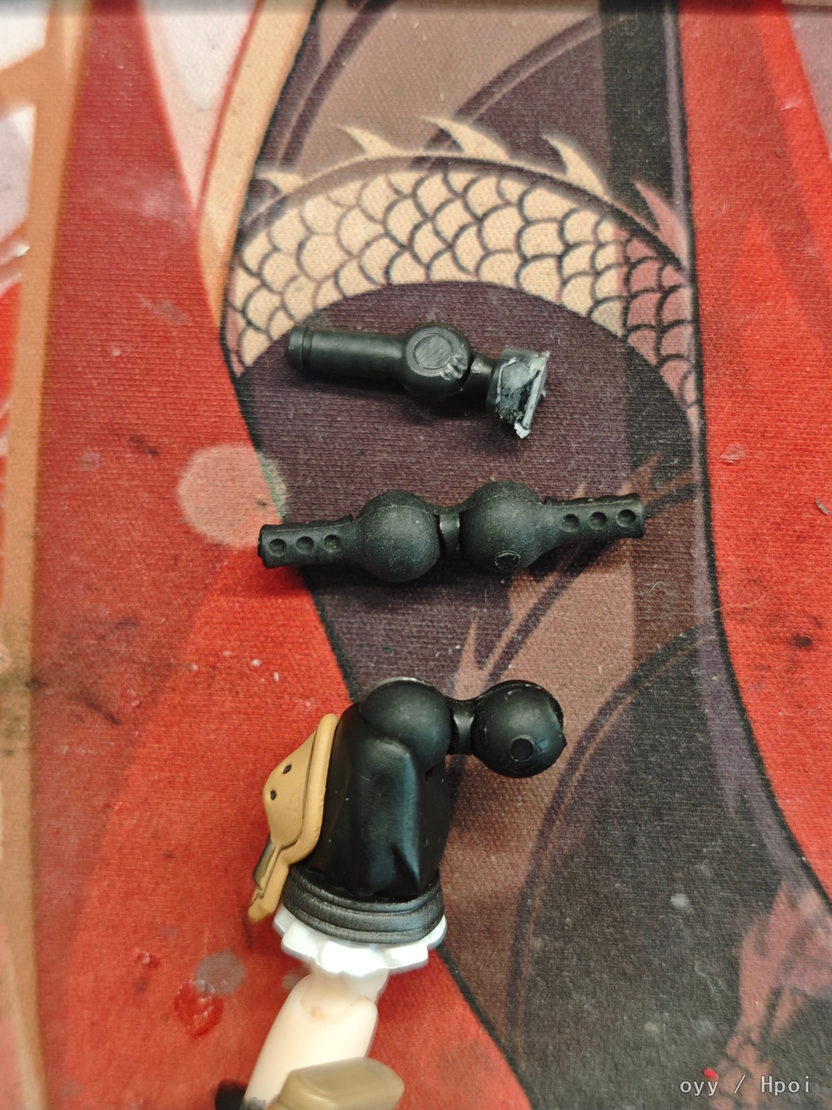首先是关节替换,原肩关节直接拿掉,肩关节球窝也得切掉留空,使用5mm双球的转轮关节,剪掉一边的装直接当球关节使用,因为整个胸腔都是软胶所以基本可以直接安插进原本肩膀的球窝留空凹槽里。手臂同理直接插就好,可以扩一下孔或者泡热水这样可以安插的更紧凑。
