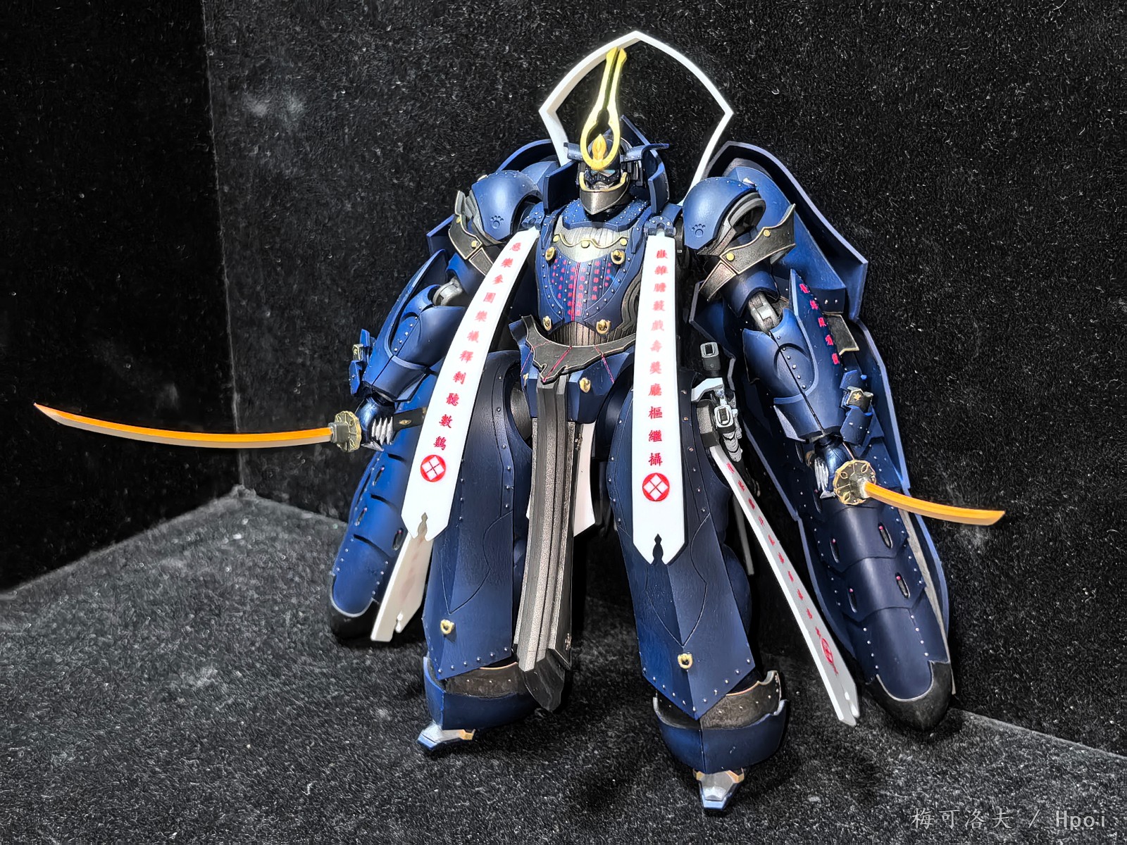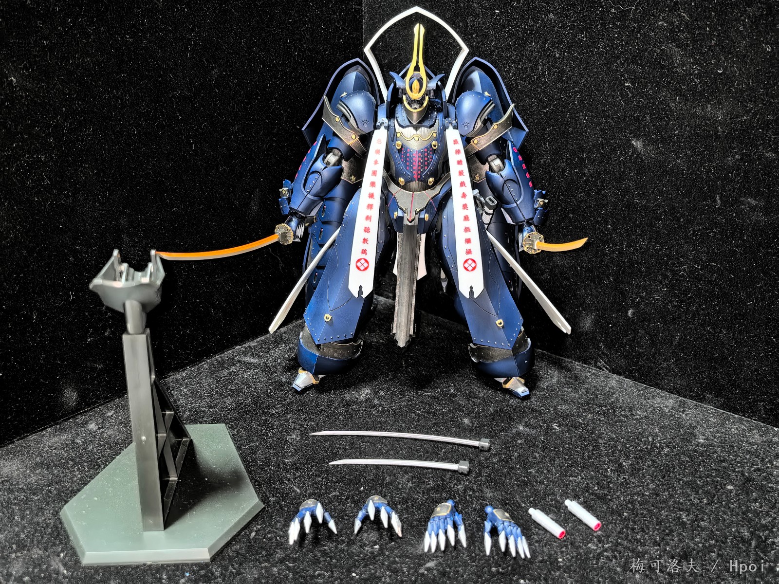 这个大天牛也是拼完了,我就简单笔涂补点色喷个消光。这个系列的普通水平吧,组合度没问题,大号hg级别的分件分色,补色地狱,素组真是完全不推荐。造型方面除了头都是相当还原的,头看设定图普通状态是两对蓝眼,阴义状态面甲上移嘴张开两对眼合成一对红眼,而模型偷懒做成一对蓝眼嘴也没张。武装就两把刀,分通常和赤热化都是预涂装,还有打开手臂的飞蛾铁炮,背后的大推进器可以展开两翅膀。阴义状态的全身的字是水贴,贴上没法切换状态。可动因为造型比较灾难,肩膀可以外拉一段所以手臂可动还好,双手持刀也可以做到。腿可动聊胜于无,侧摆角度非常小,平转角度也小,也就前后踢有点角度。站立基本只能靠背后推进器支撑。还有这个飞行姿势用台座是什么玩意,为什么桩和档部孔不匹配?站姿还要自己找支架,直接给个可调支架会亏死你吗。
