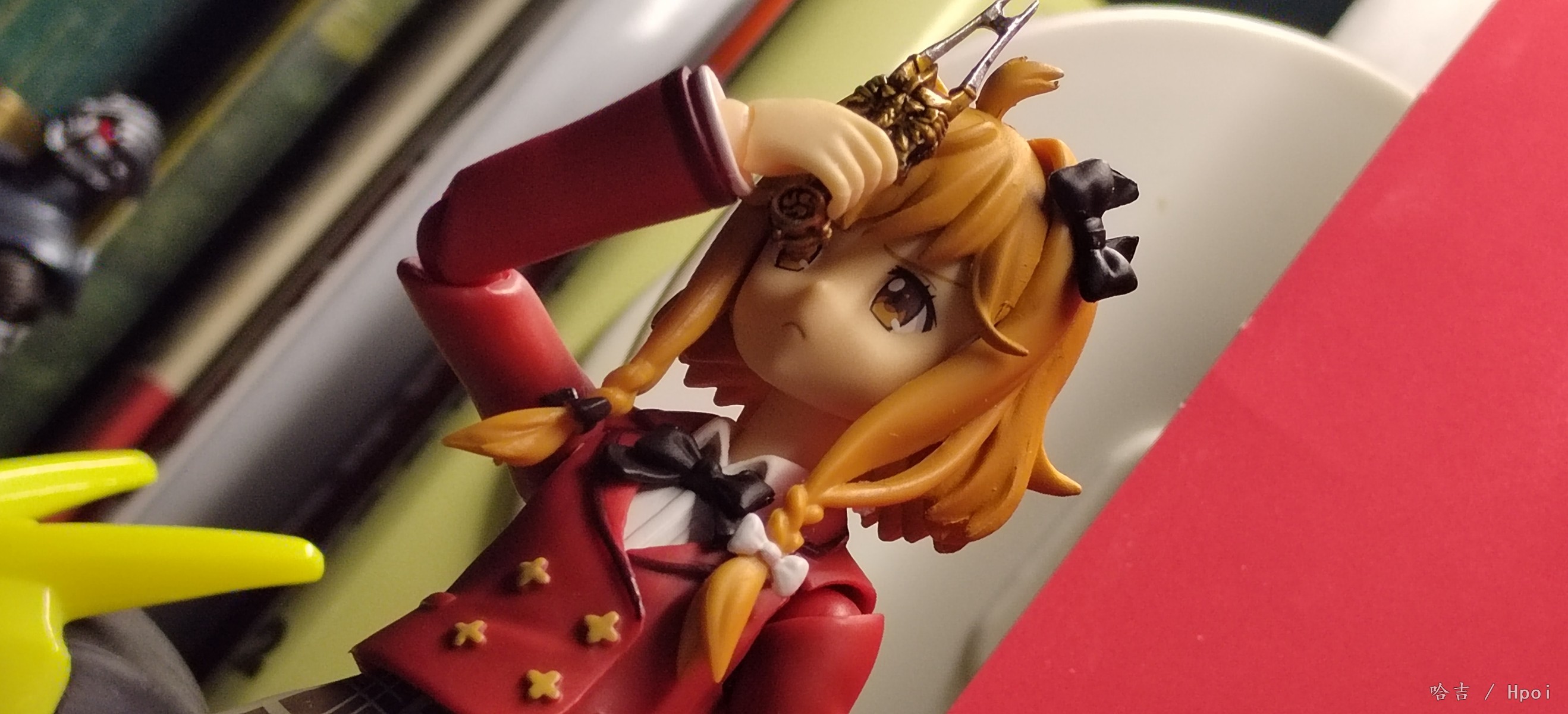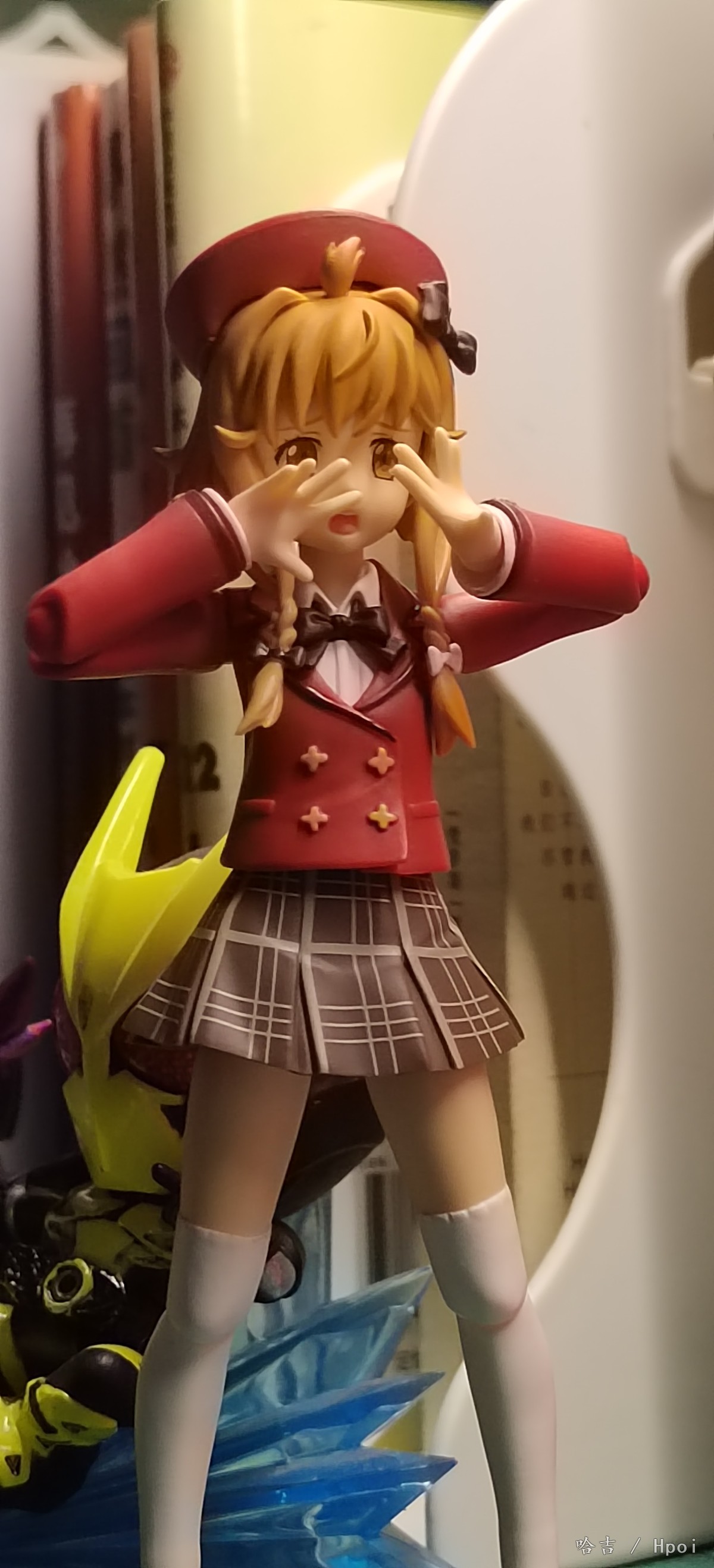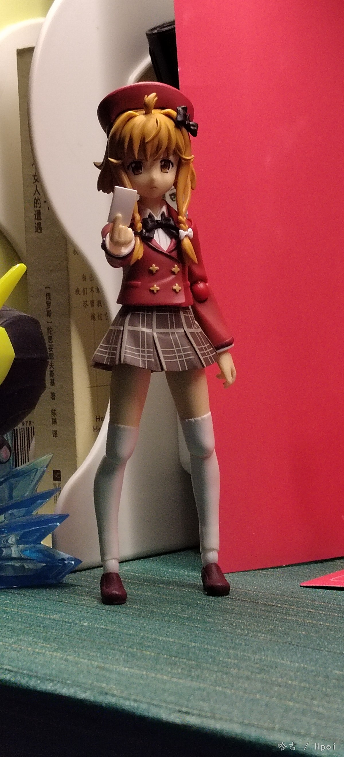 figma鵜野涡芽,入手的第二个figma,本来是想着给真锅和加一个可以卸下裙子的2.0素体玩一玩,买回来发现裙子是一样的安装方式 上套下粘,卸不下来,但是素质还可以,就是关节方面调教的不太好,整个下半身有点软,但自立还行,帽子是磁吸的,也有小鼓🥁配件,没拍是因为懒得拿出来了,做工也行,还有小包,全硬质的,也不错,鞋子我换下来了,虽然大但是底不平站不稳,换成了真锅和的鞋子,好多了, 有不错的抬头,低头一般般,表情给了三个,但是开心表情眼睛歪了,不在意,个人一般喜欢有微表情的脸,手腕关节...和手型组合太紧了,每次换手型都会把关节带下来,所以有些照片的是没插到底,不是插不进去。