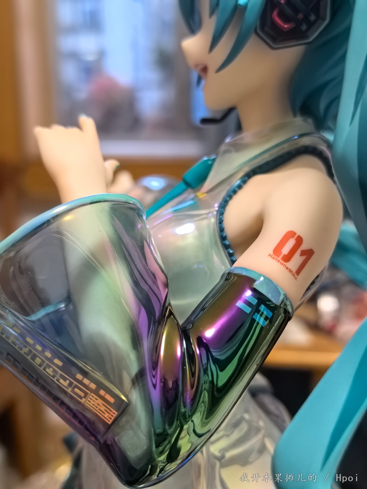 强烈建议把这个手办放到有光的地方。在光的照射下,整体真的非常好看。另外说一点,这个头发其实它不仅涂的非常有质感,而且它还靠分色,甚至是渐变,还有色块的区分,直接还原出了手办的这种原画的这种感觉。相当于是涂装和光影效果的共同加持。头发非常的好看,即使是在弱光的情况下也能像看原画一样的看出明显的这种层次感。然后就是袖子有非常棒的这种渐变涂装当然也少不了袖子上面的这些键盘涂装。