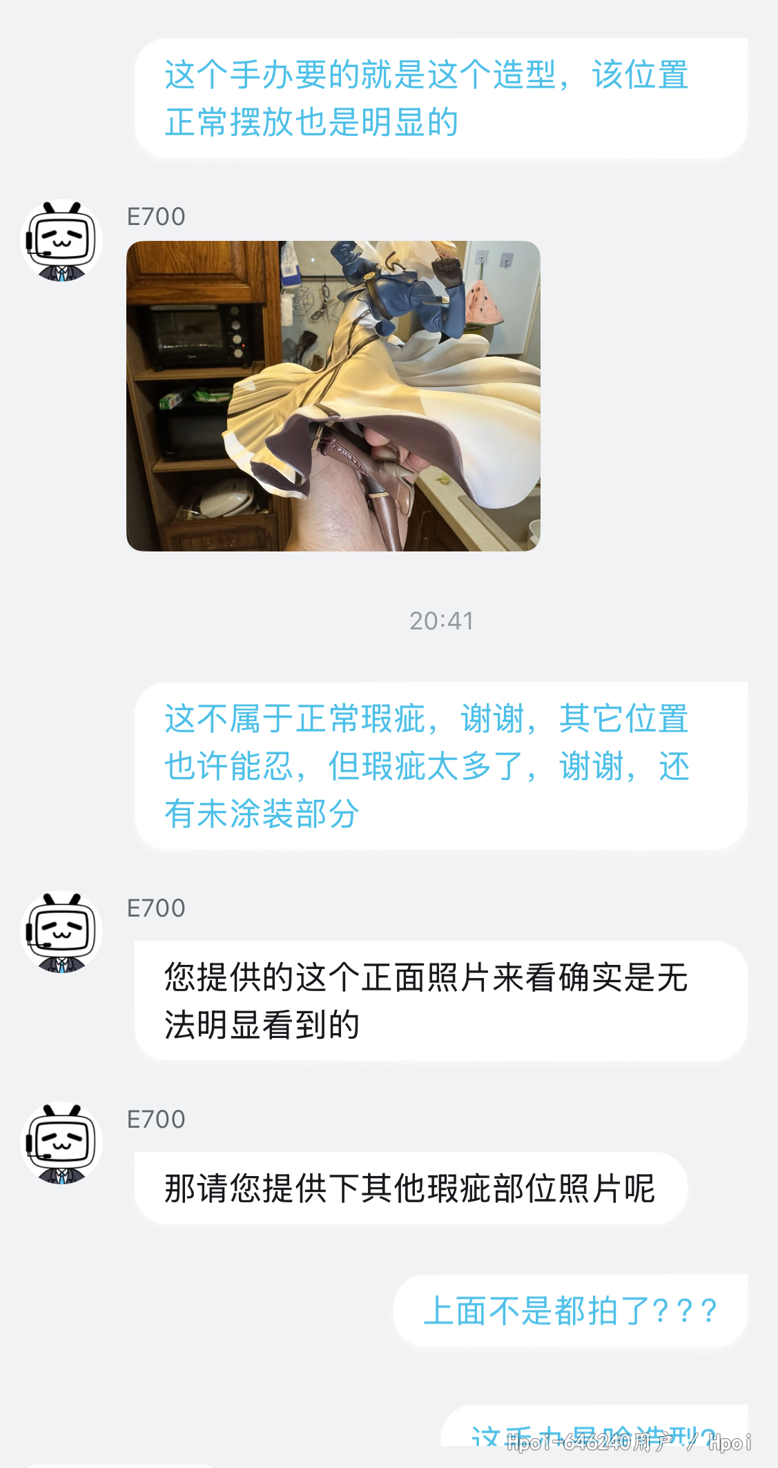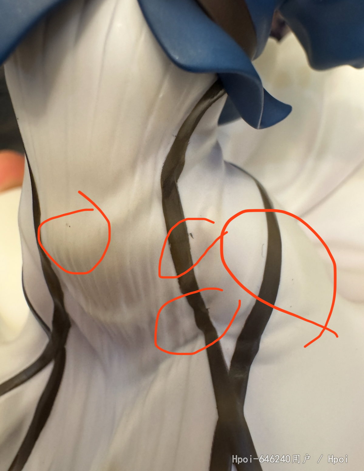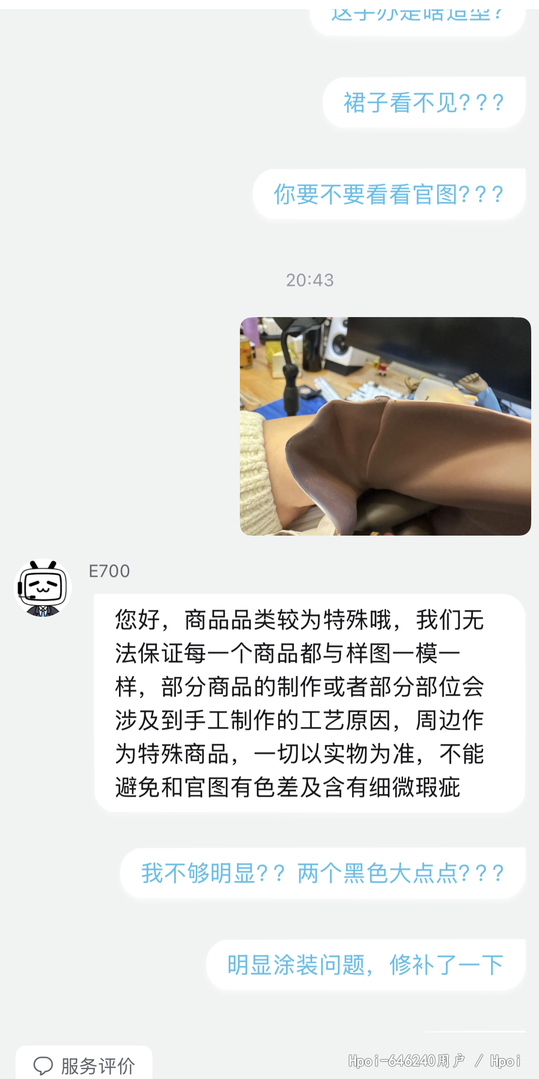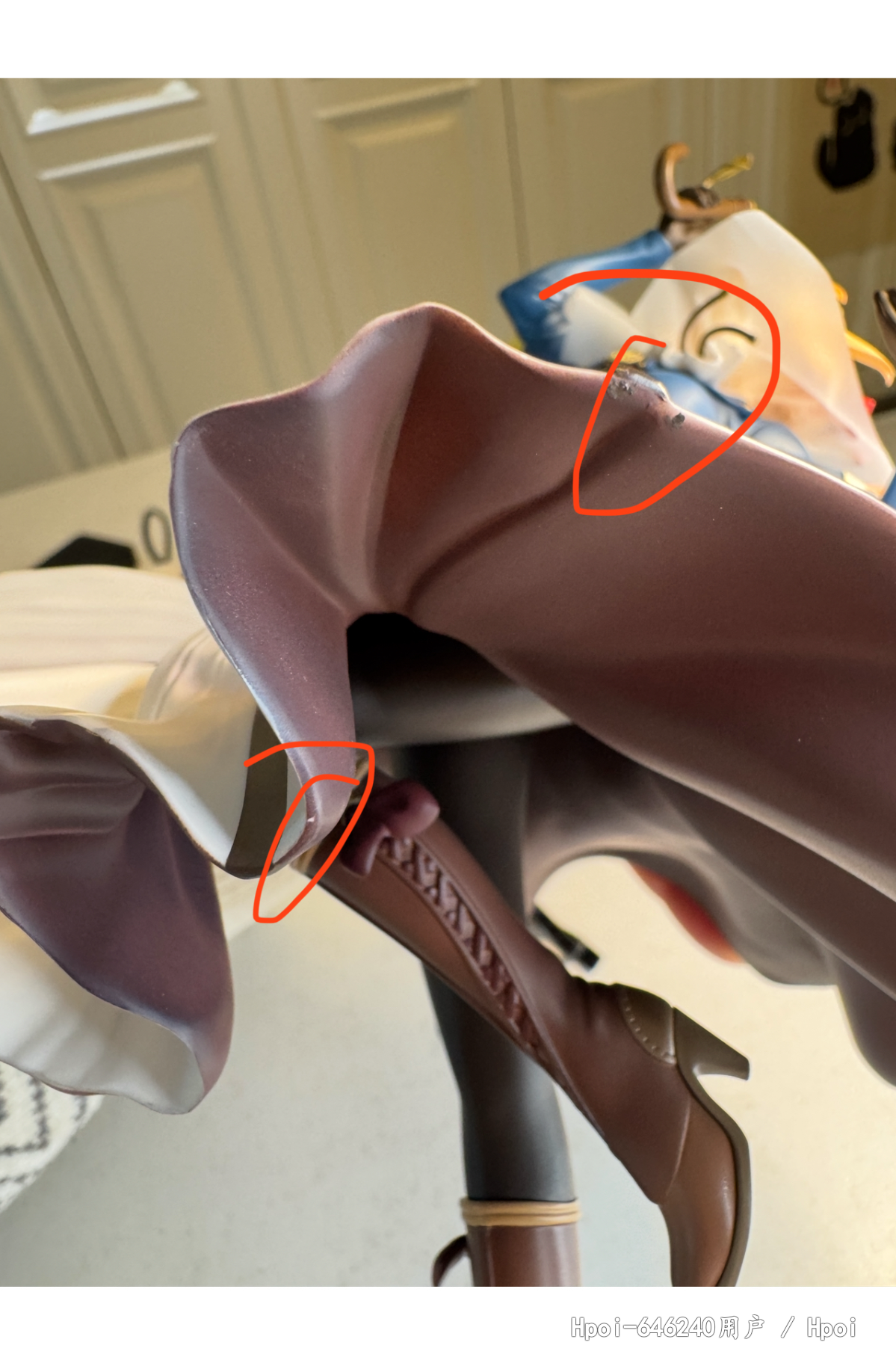 到货,内部雪梨纸被人为拆掉,箱子也存在些许破损,我反馈给hyg,说让继续开箱,开箱后内容物明显存在多处问题,客服说看不见,说是正常的,换货都不给换!这叫正常?别的位置我可以忍,这裙子边能忍?不是明显二次修补过的瑕疵品?而且裙子瑕疵位置正好在左边,正常摆放看的一清二楚。hyg真的厉害了,hyg还十几个手办没补,真是灾难!